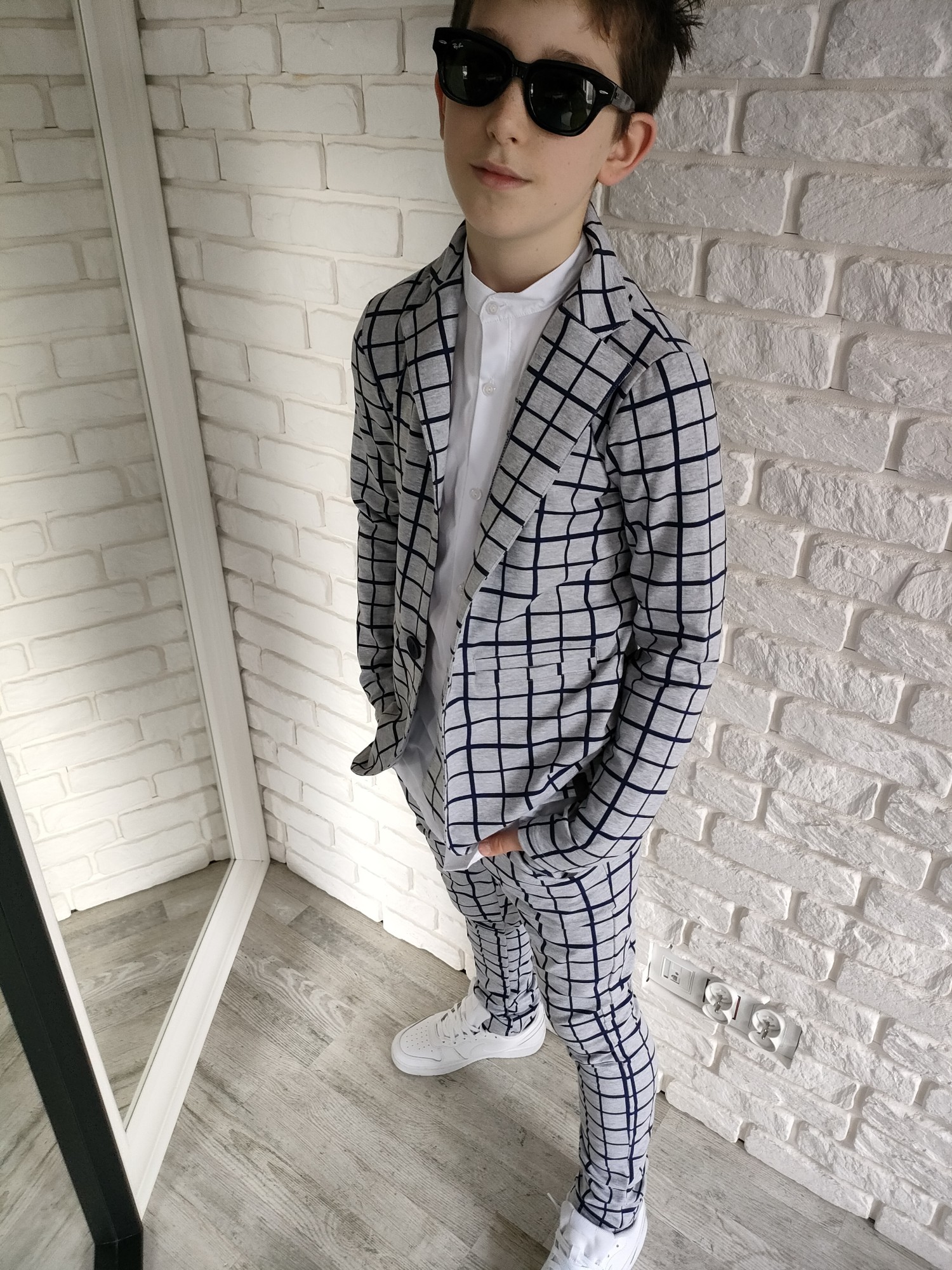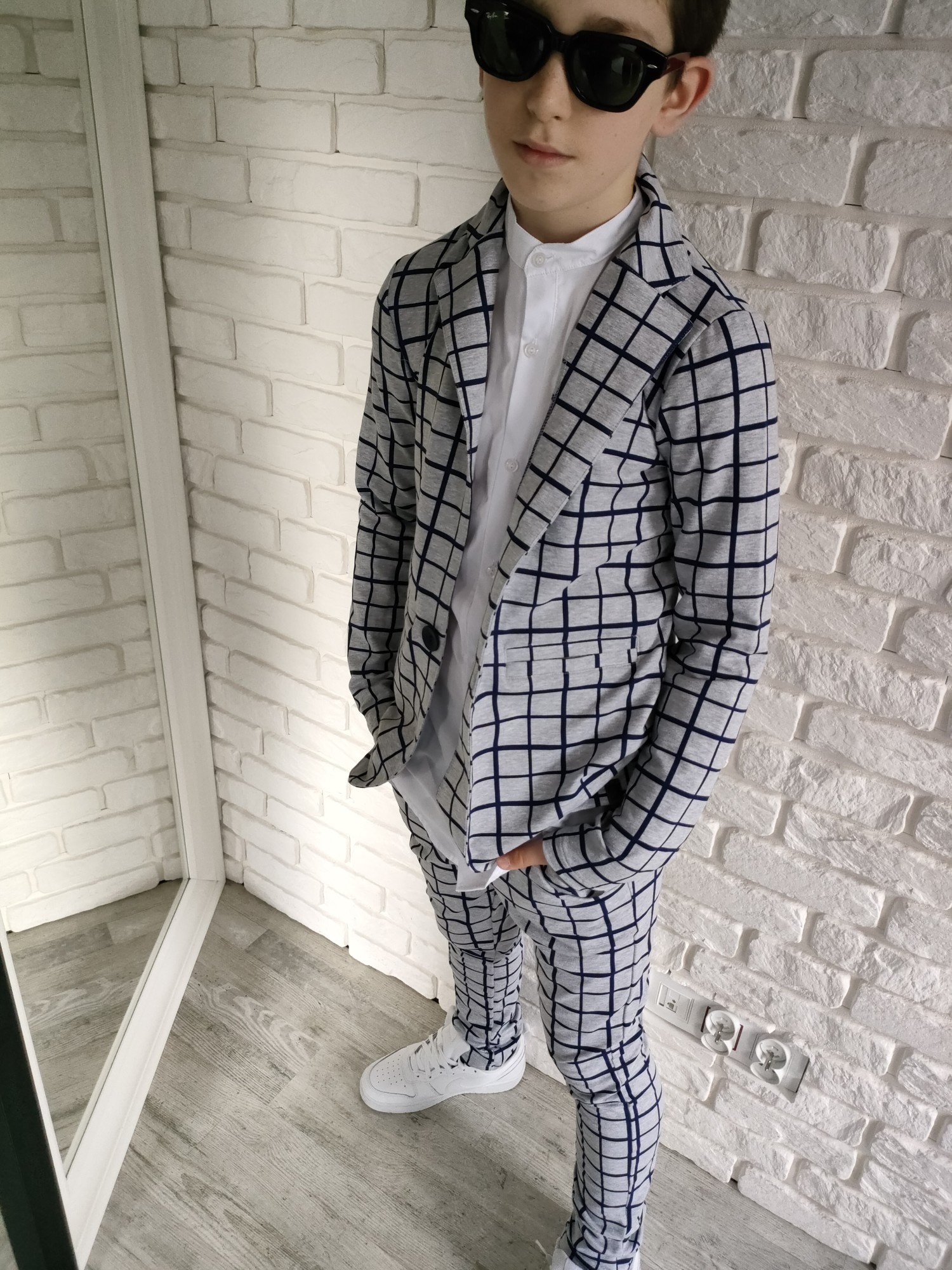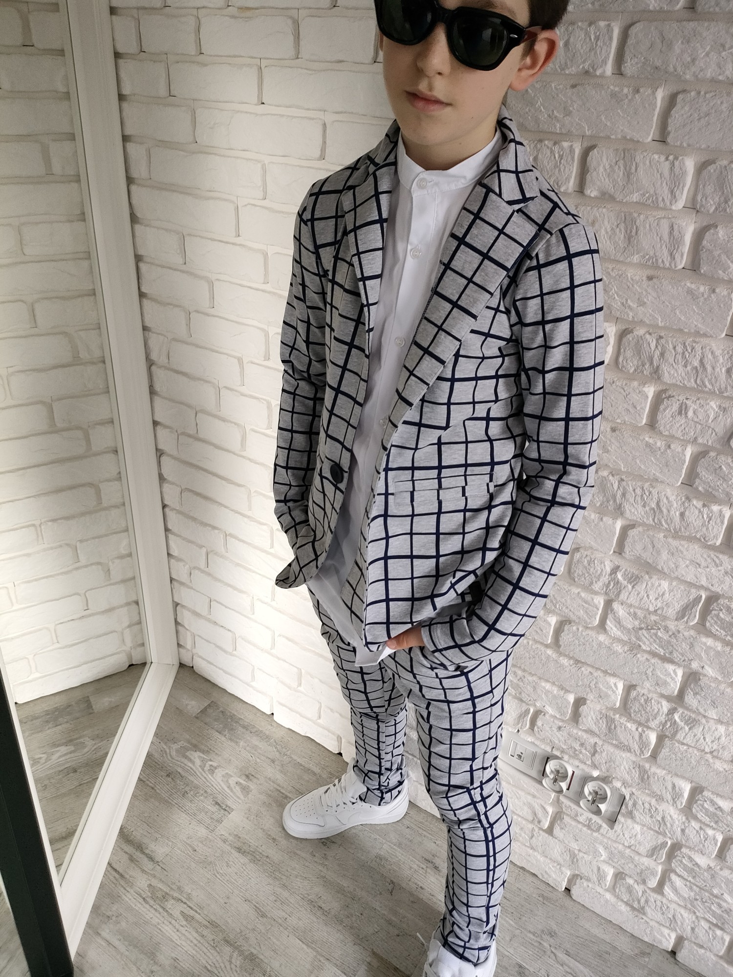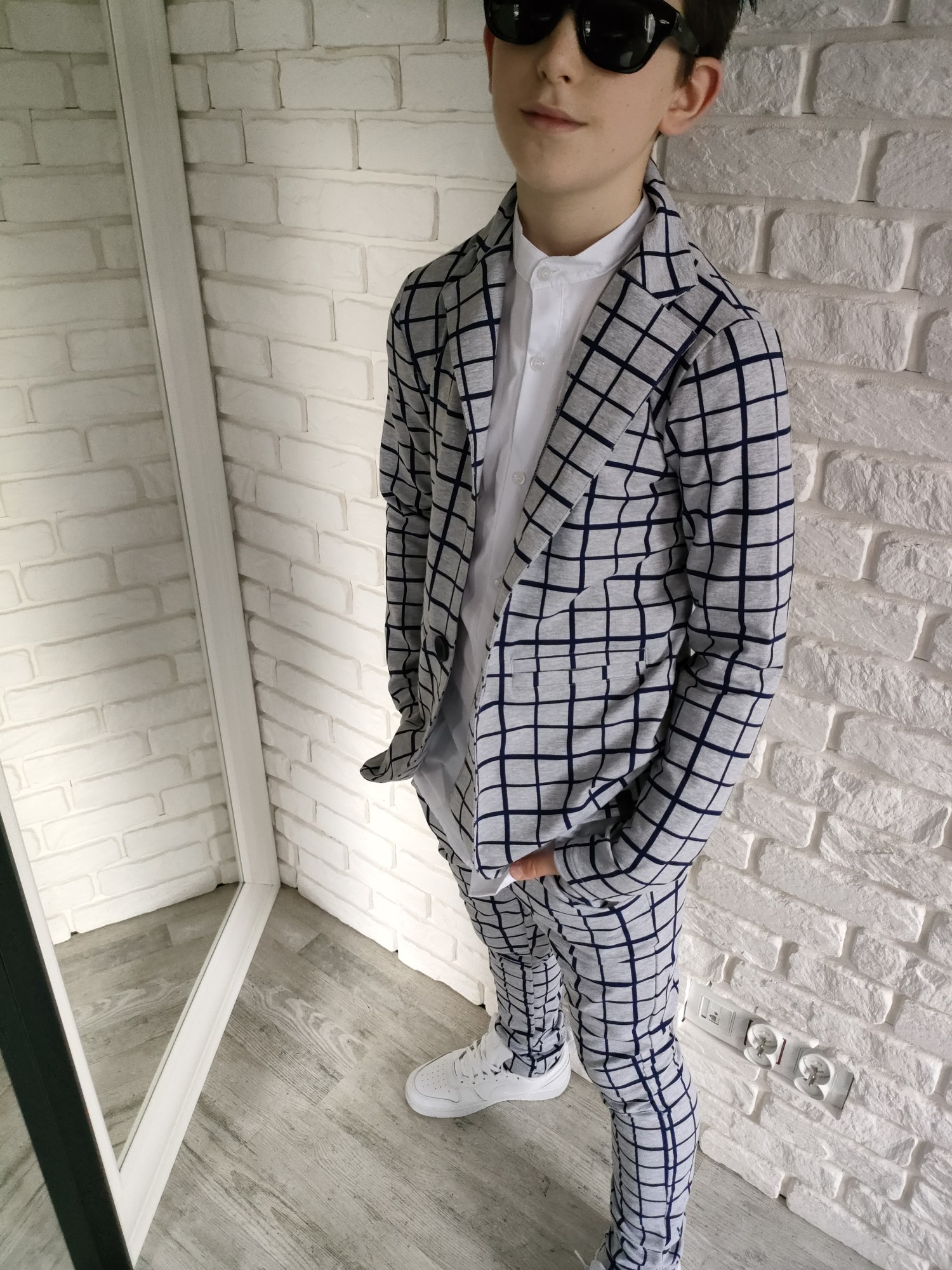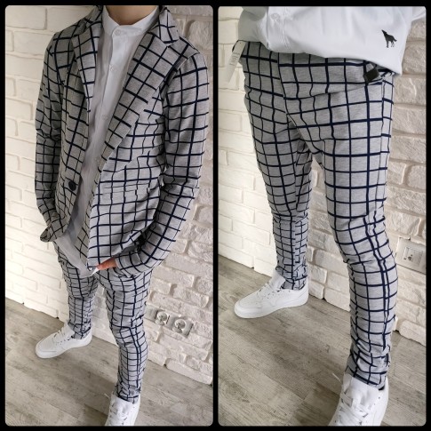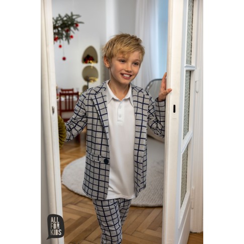 Zestaw, który gra jak dobrze nastrojony instrument: marynarka i spodnie w szaro-granatową kratę tworzą duet, który sam w sobie robi styl. To komplet, który nie potrzebuje nadmiaru – wystarczy białe polo, koszula albo ulubione T-shirtowe basic i masz gotowy look, który pasuje wszędzie, od świątecznego stołu po szkolny apel.