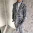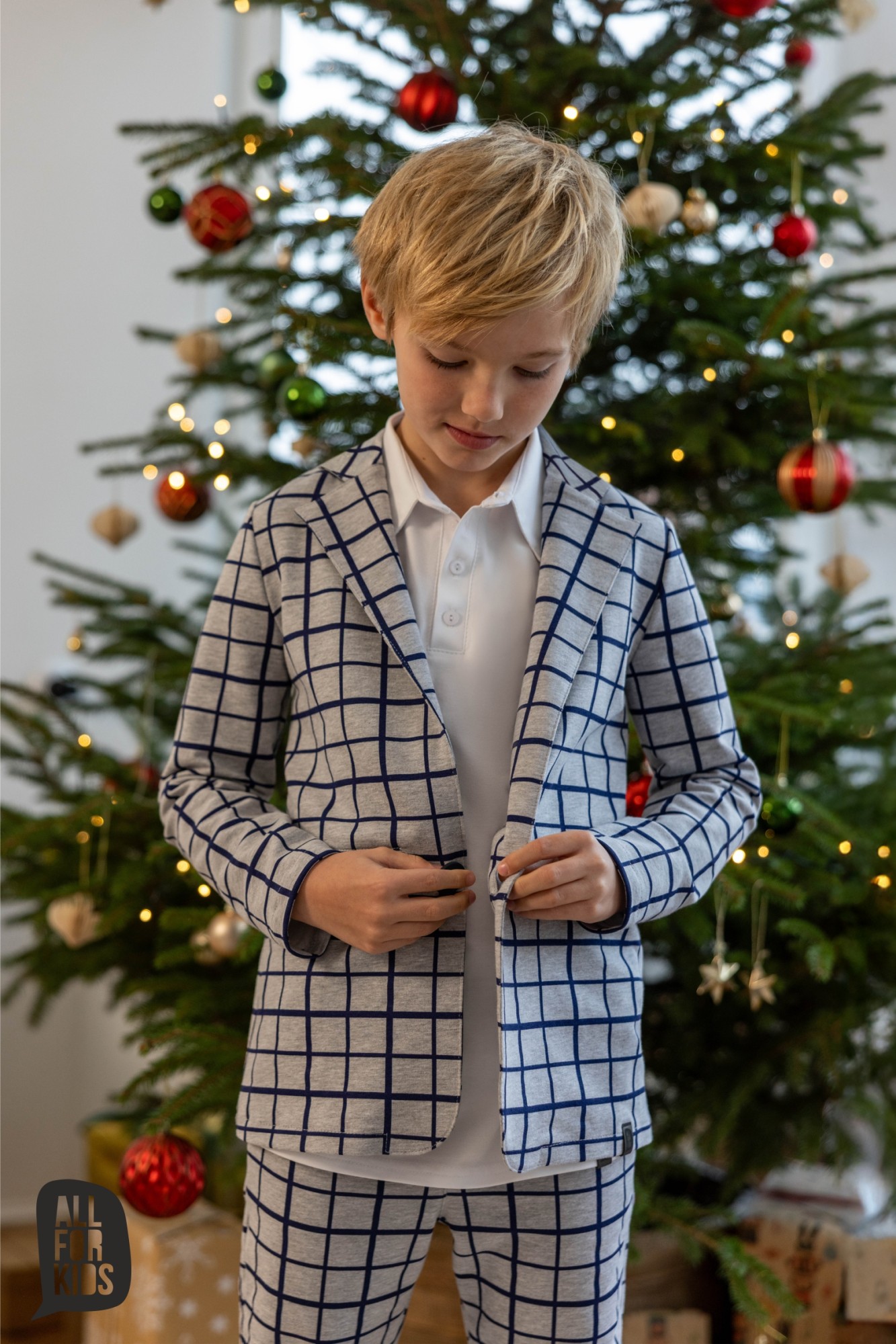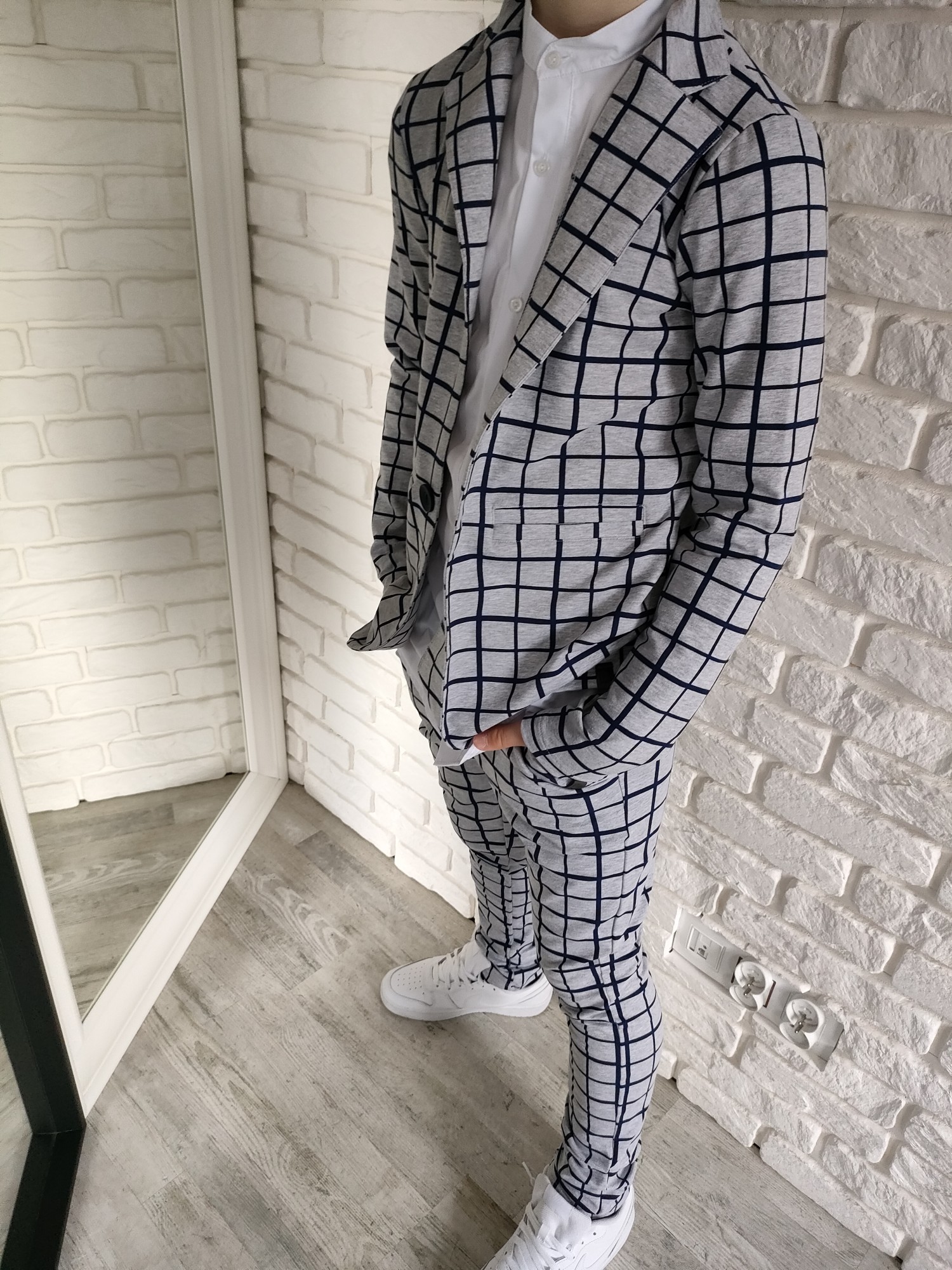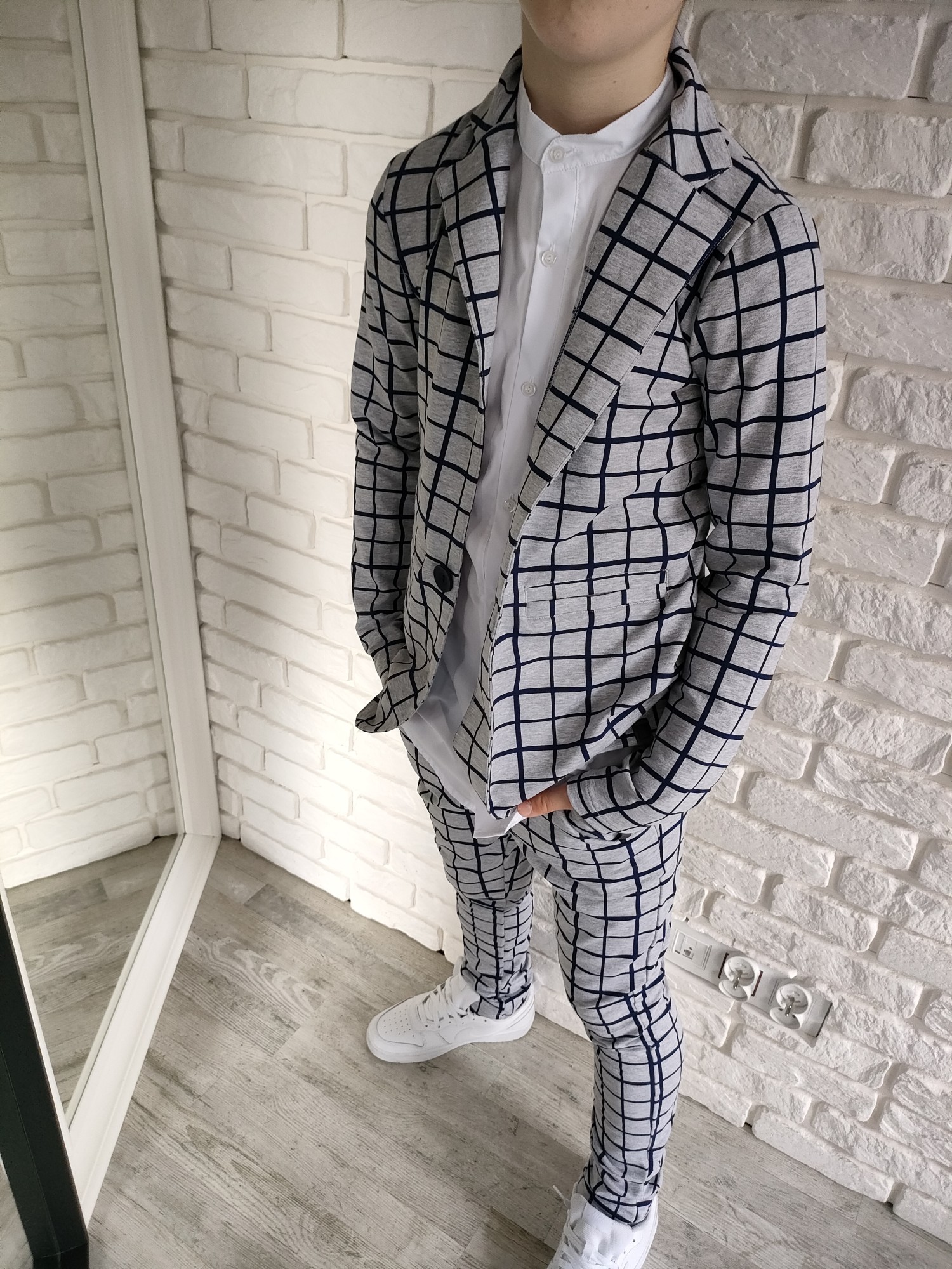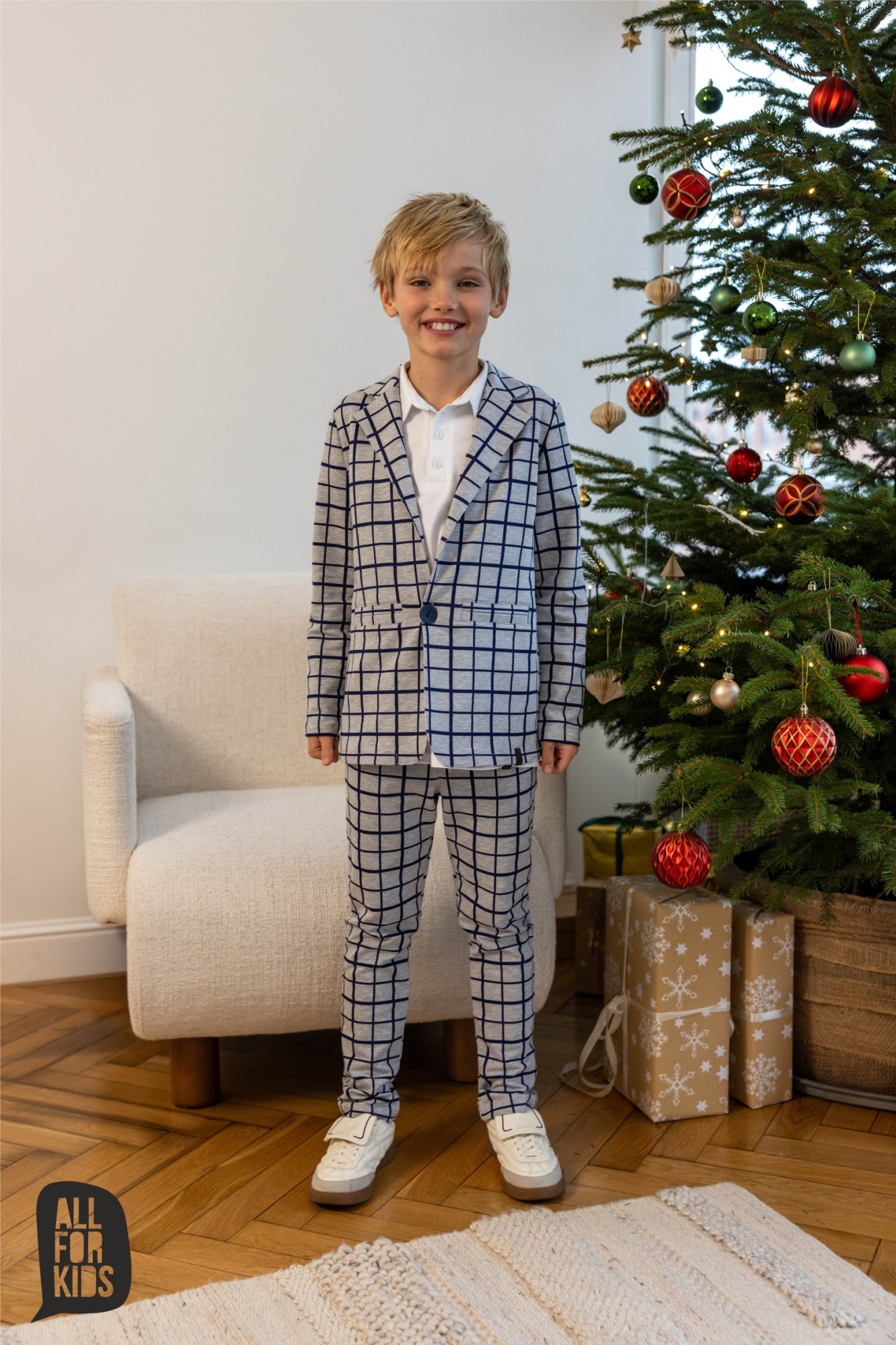 Zestaw, który gra jak dobrze nastrojony instrument: marynarka i spodnie w szaro-granatową kratę tworzą duet, który sam w sobie robi styl. To komplet, który nie potrzebuje nadmiaru – wystarczy białe polo, koszula albo ulubione T-shirtowe basic i masz gotowy look, który pasuje wszędzie, od świątecznego stołu po szkolny apel.