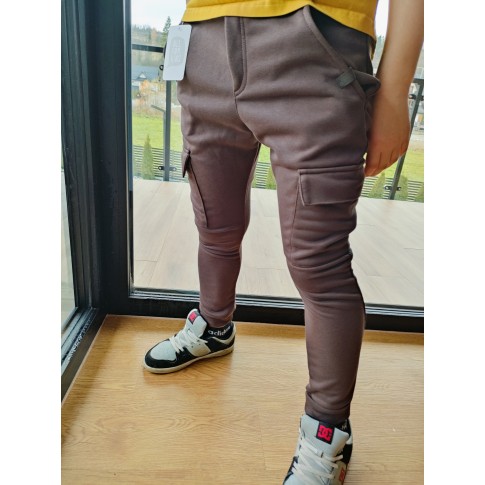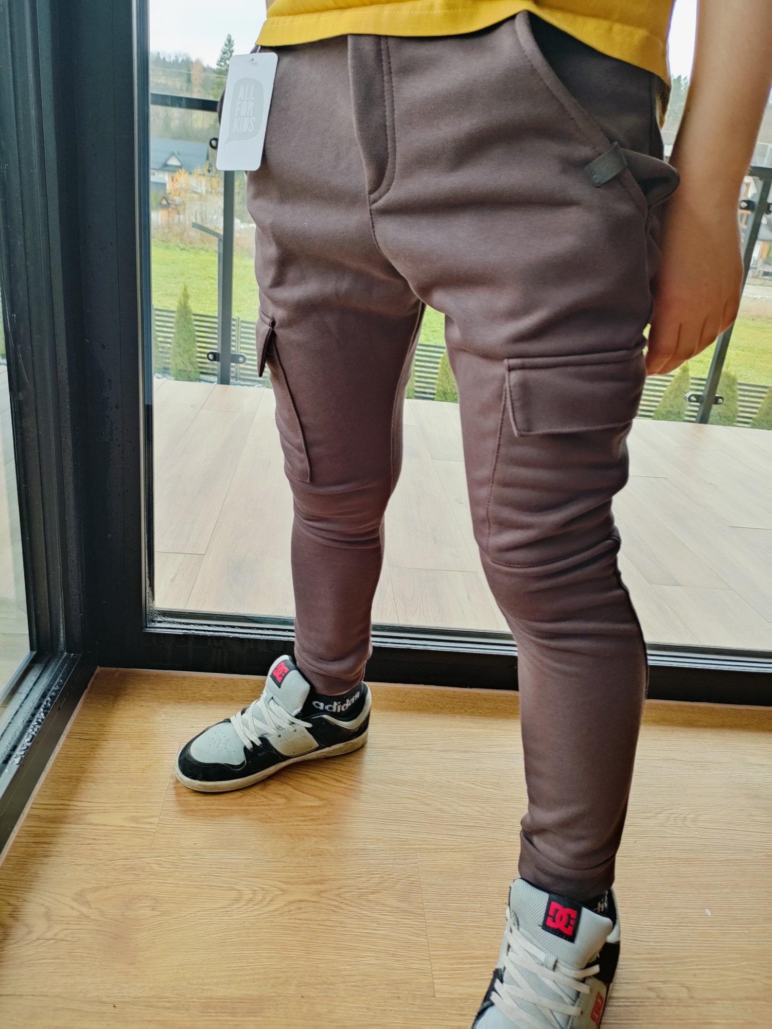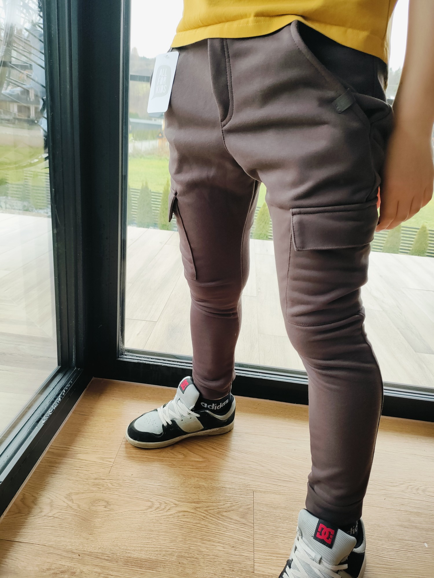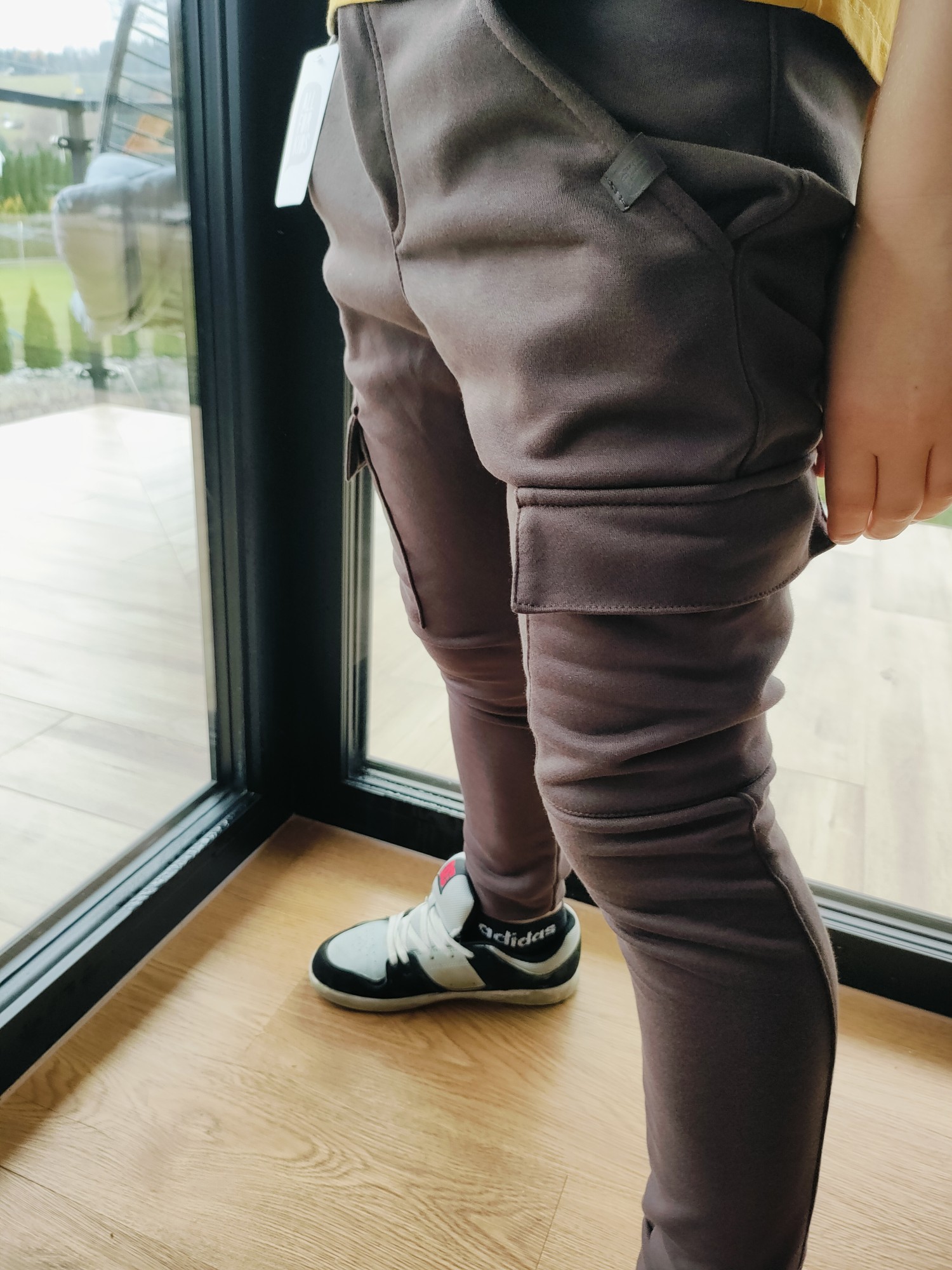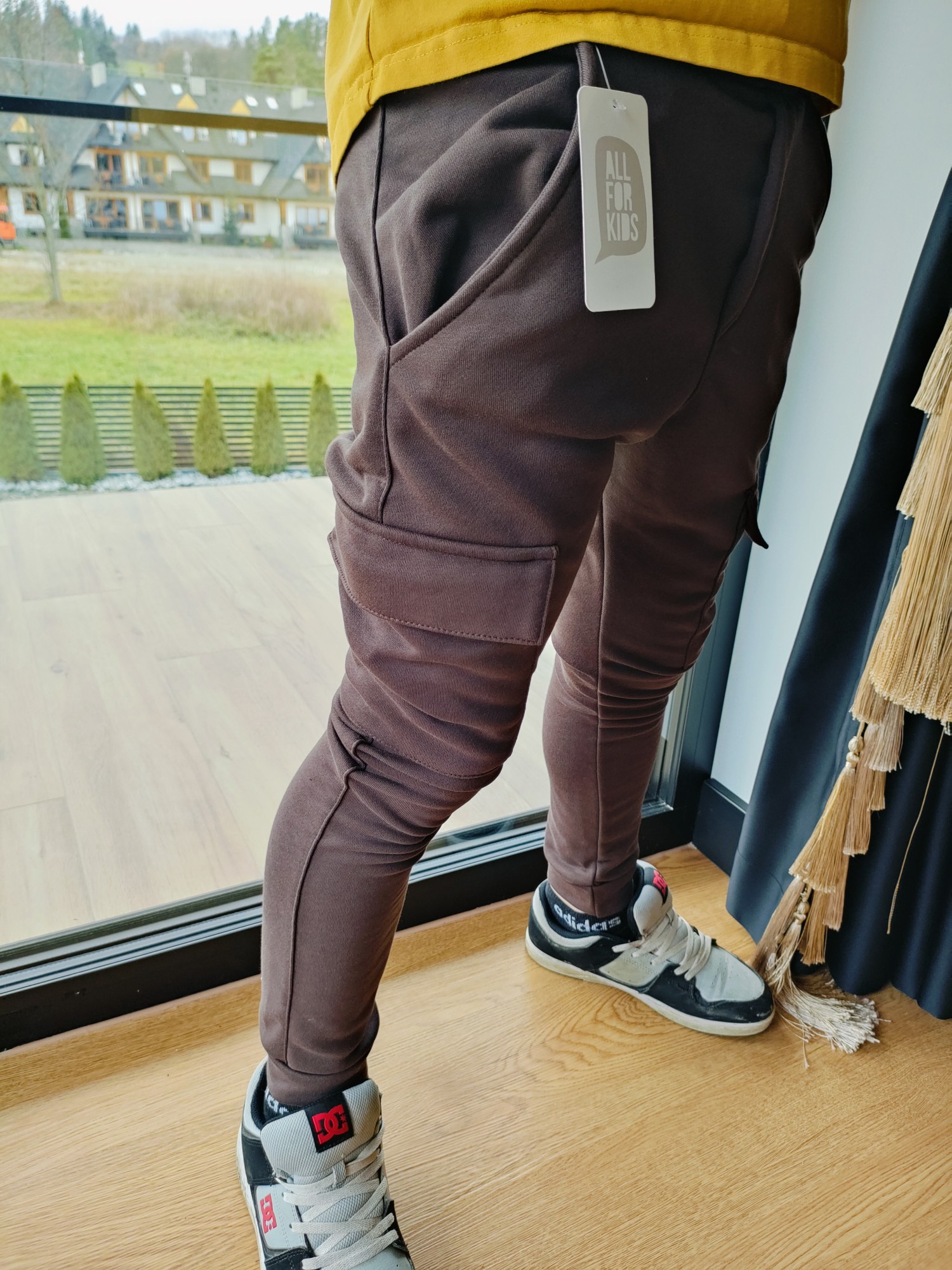 Spodnie dresowe bojówki brązowe All For Kids to połączenie funkcjonalności i młodzieżowego stylu – luźny krój cargo daje swobodę ruchu, duże kieszenie cargo na udach są prawdziwie użytkowe (zmieszczą się wszystkie skarby), a ściągacze w kostce trzymają formę i nie zahaczają o buty podczas gry czy jazdy na rowerze. Ciemny brązowy kolor to neutralna baza, która łączy się z wszystkim – szarością, czernią, beżem, zielenią i kolorowymi bluzami.
