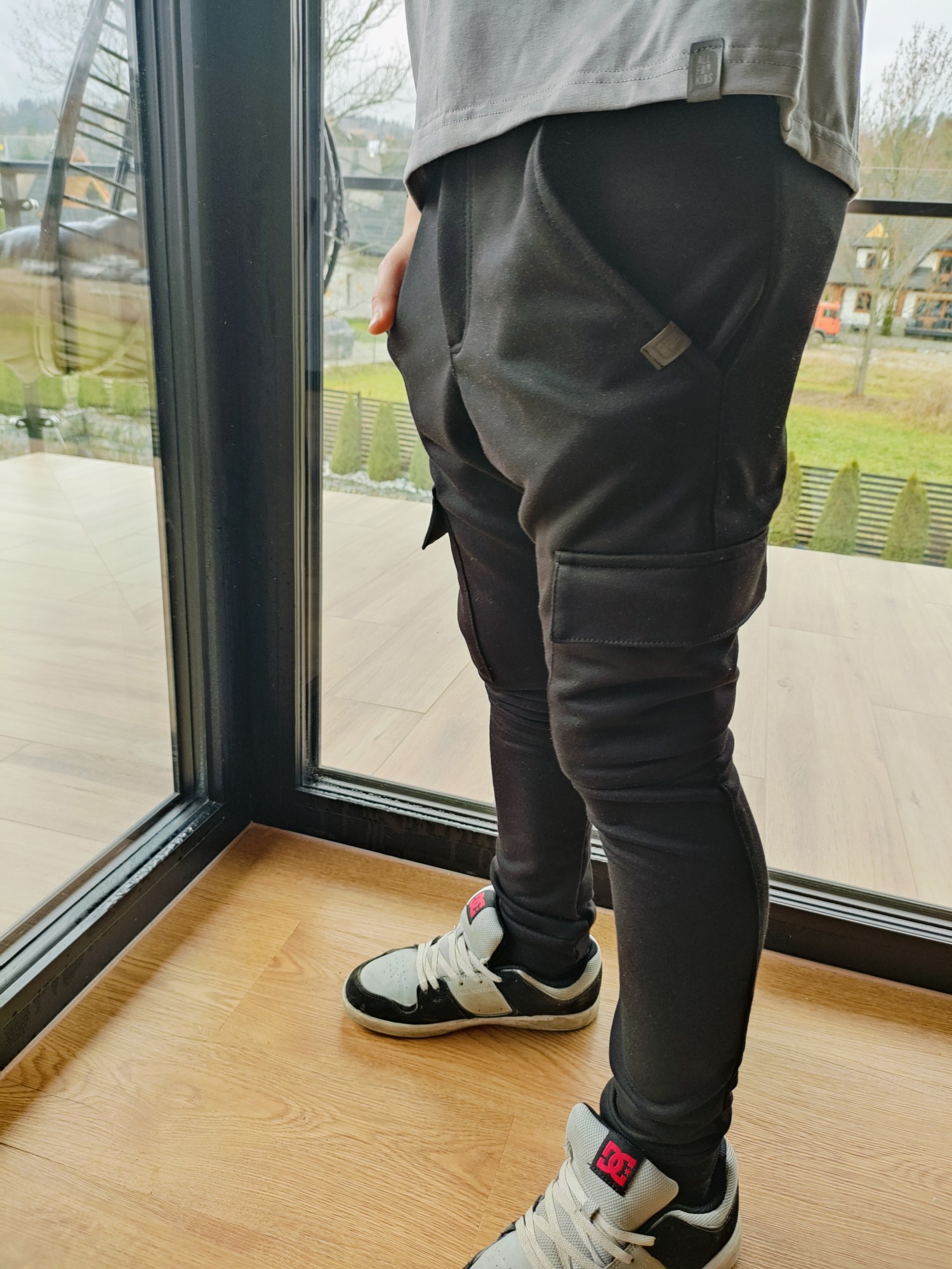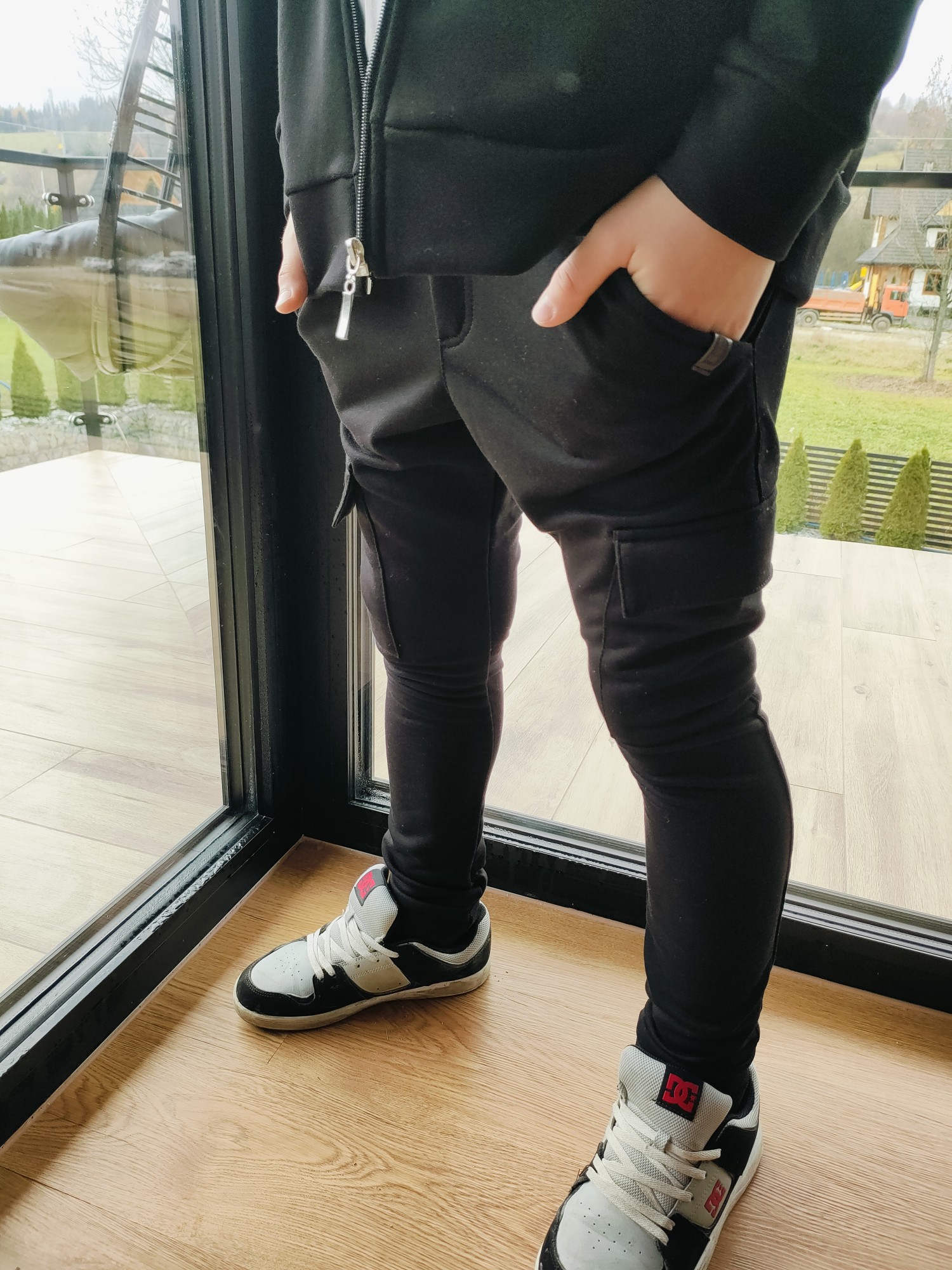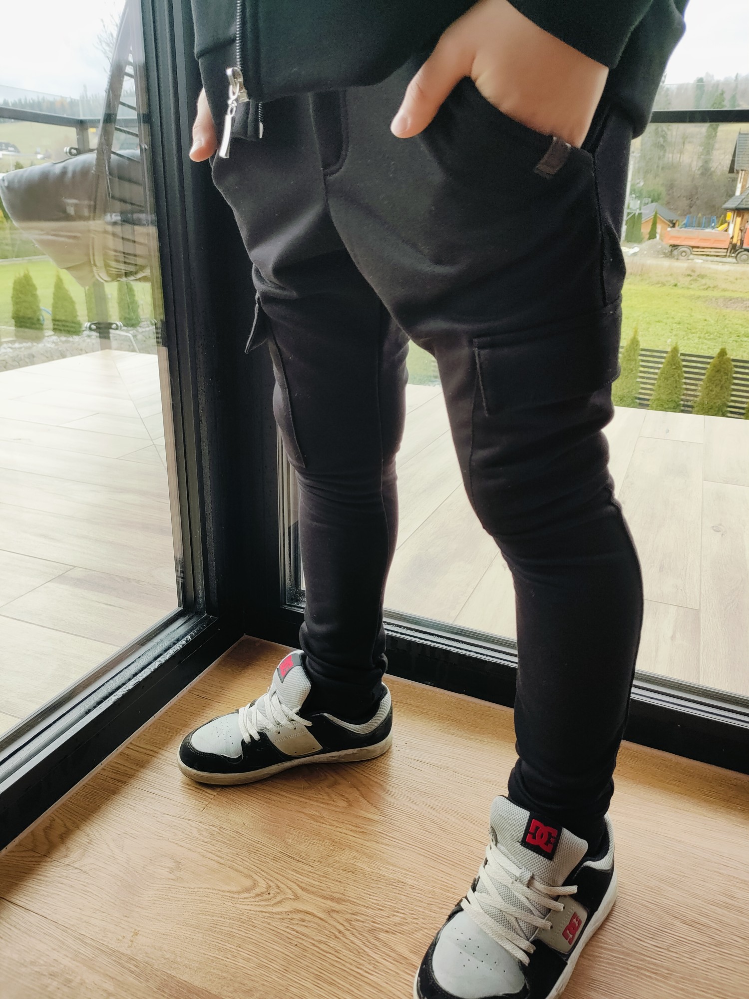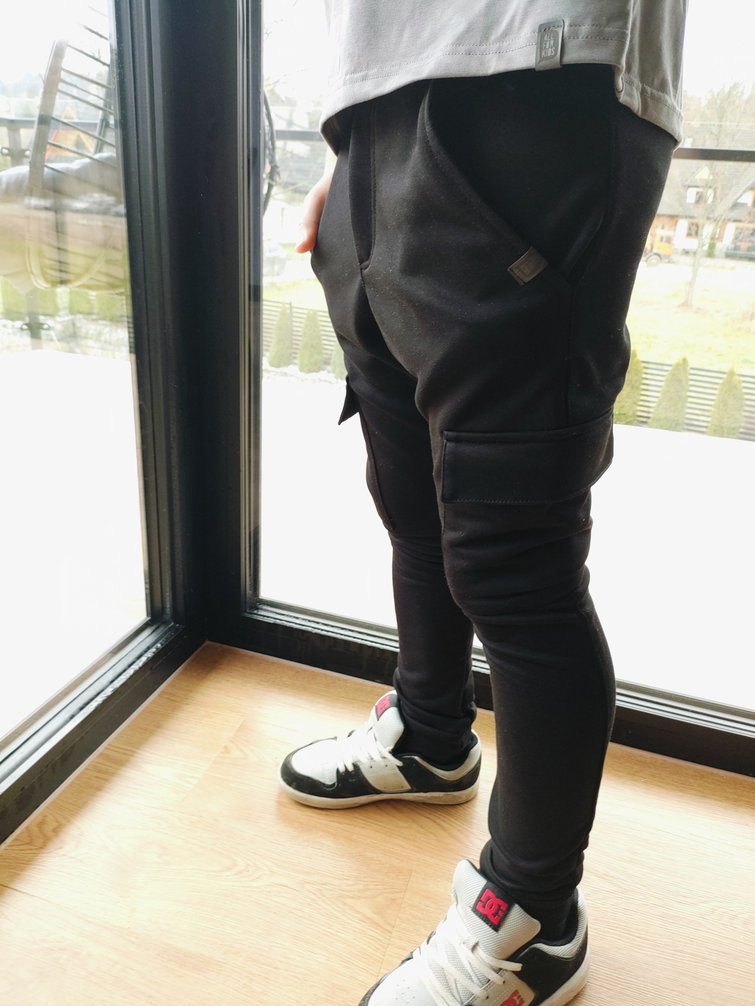 Spodnie dresowe bojówki czarne All For Kids to must-have do codziennej rotacji małego streetweara. Luźny krój cargo daje luz ruchu i młodzieżowy vibe, kieszenie boczne są prawdziwie funkcjonalne (zmieści się wszystko co ważne), a ściągacze w kostce trzymają formę i nie zahaczają o buty podczas gry, zabawy czy jazdy na rowerze. Czarny kolor to baza, która pasuje do wszystkiego – kolorowych bluz, białych t-shirtów, kurtek oversize.
