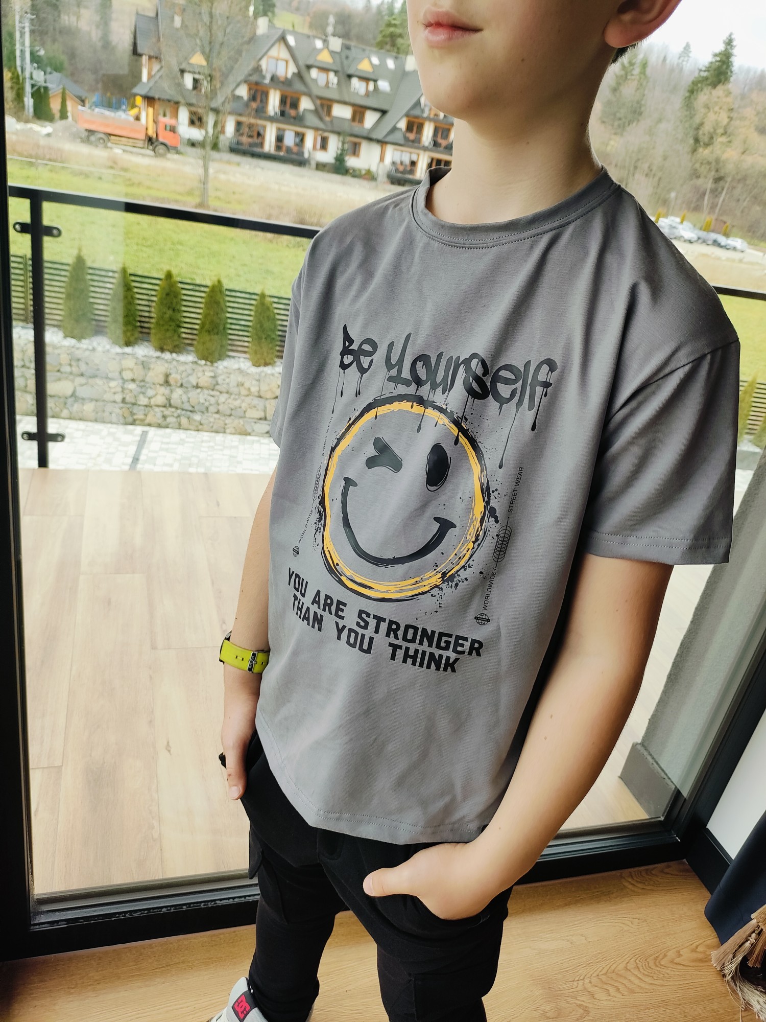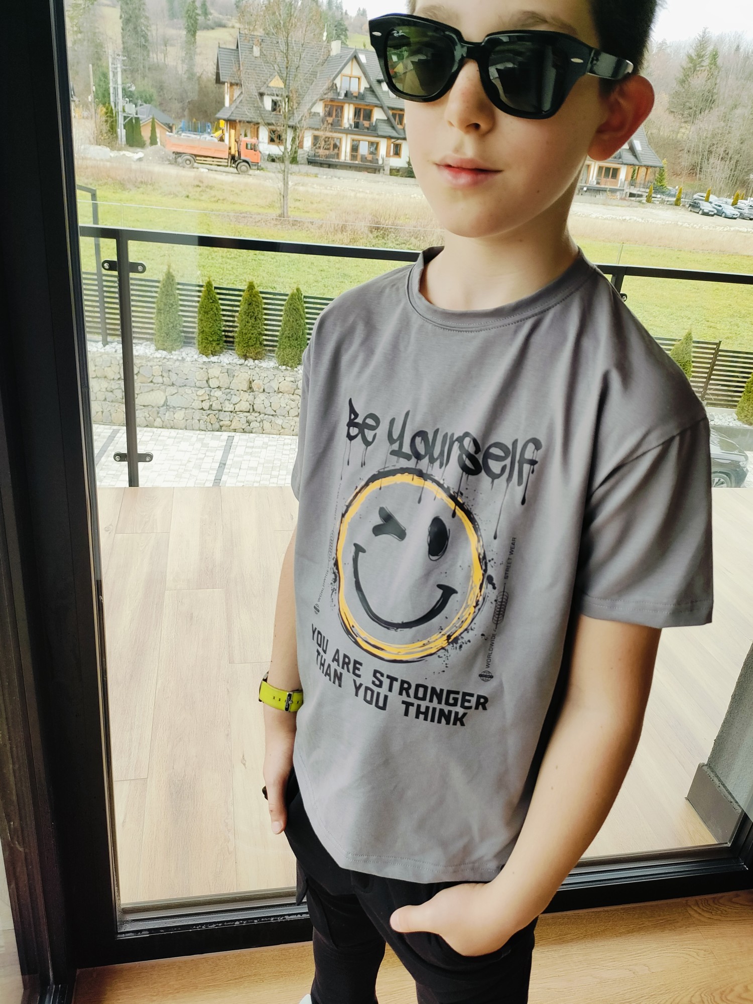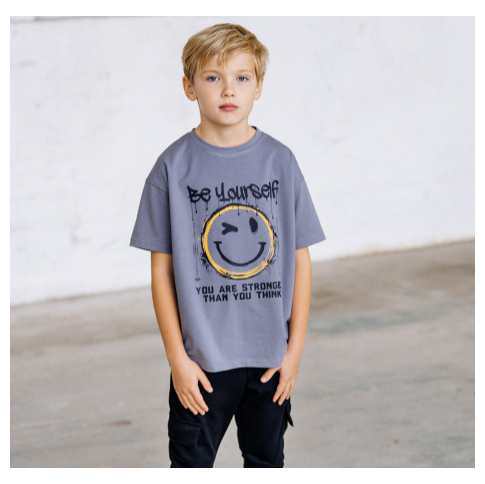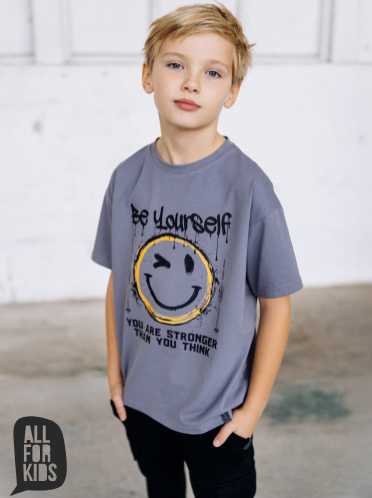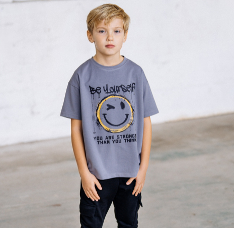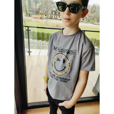 T-shirt szary "Be Yourself" All For Kids to koszulka z przesłaniem – luźny oversizowy krój, smiley w okularach i napis "BE YOURSELF / YOU ARE STRONGER THAN YOU THINK" robią look, który nosi się dobrze fizycznie i mentalnie. Szary kolor to baza, która pasuje do wszystkiego – czarnych joggerów, jeansów, szortów cargo. Krój oversize daje młodzieżowy luz i swobodę ruchu, a miękka bawełna zapewnia komfort od rana do wieczora.