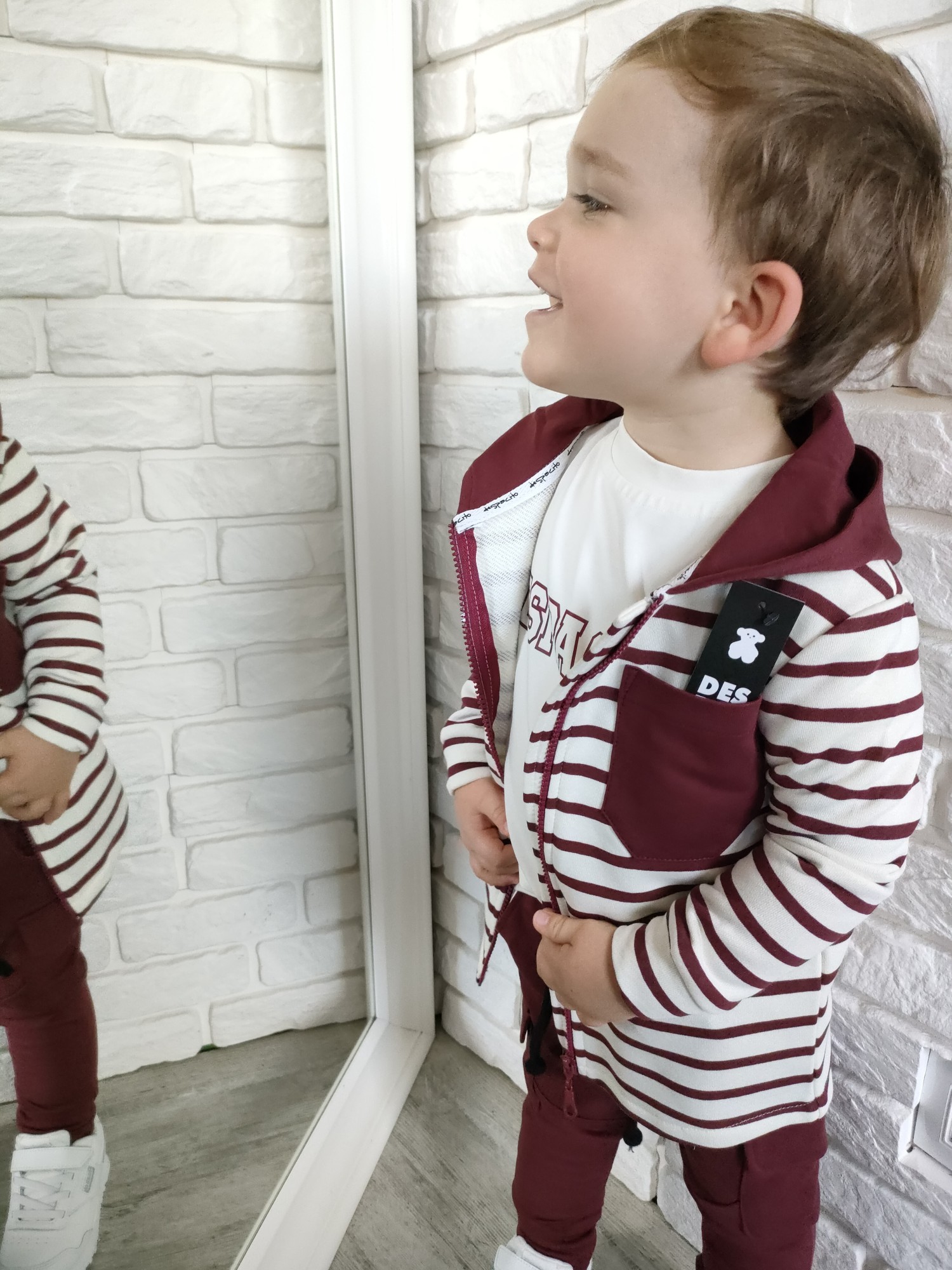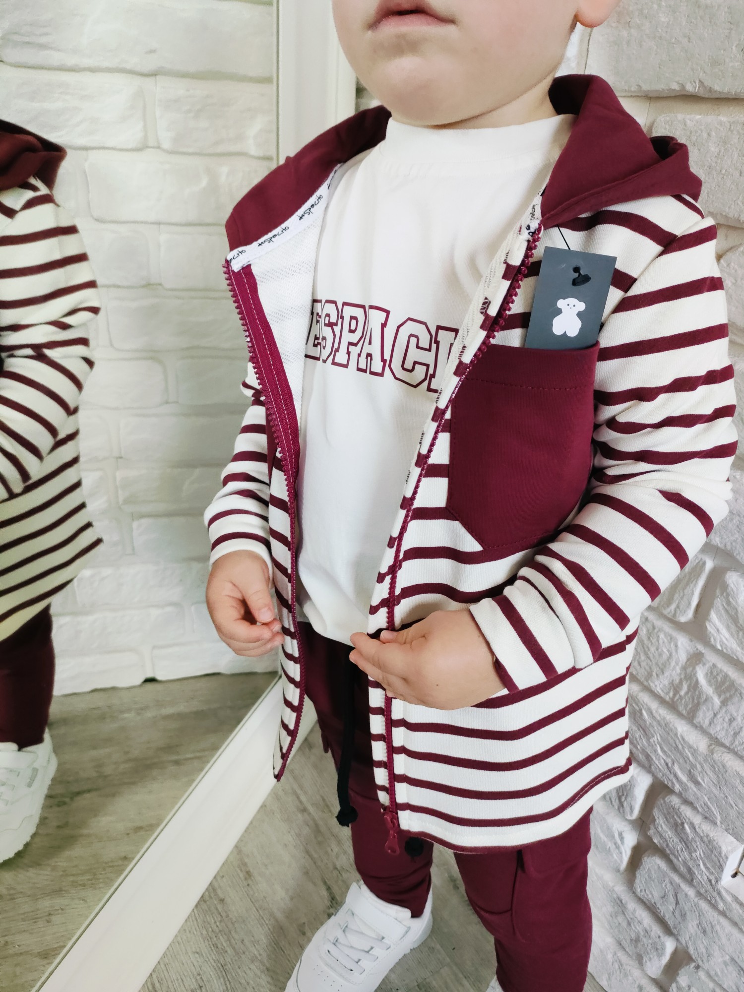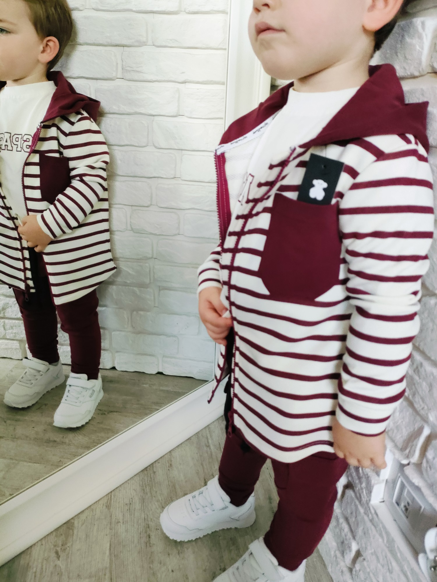 Bluza Despacito w paski „burgund” to odcień dojrzałej czerwieni spotykający się z rytmem pasków. Full-zip ogarnia poranne zakładanie w minutę, kaptur łapie wiatr, a miękka dzianina dowozi komfort w klasie i na placu. To jest ta bluza dziecięca na zamek, która gra z T-shirtem i longiem, a pod puchówką robi warstwę „na pewniaka”. Burgund w paski lubi denim, czerń, szarość, ecru i oliwkę – składasz w sekundę, wygląda jak świadomy set.