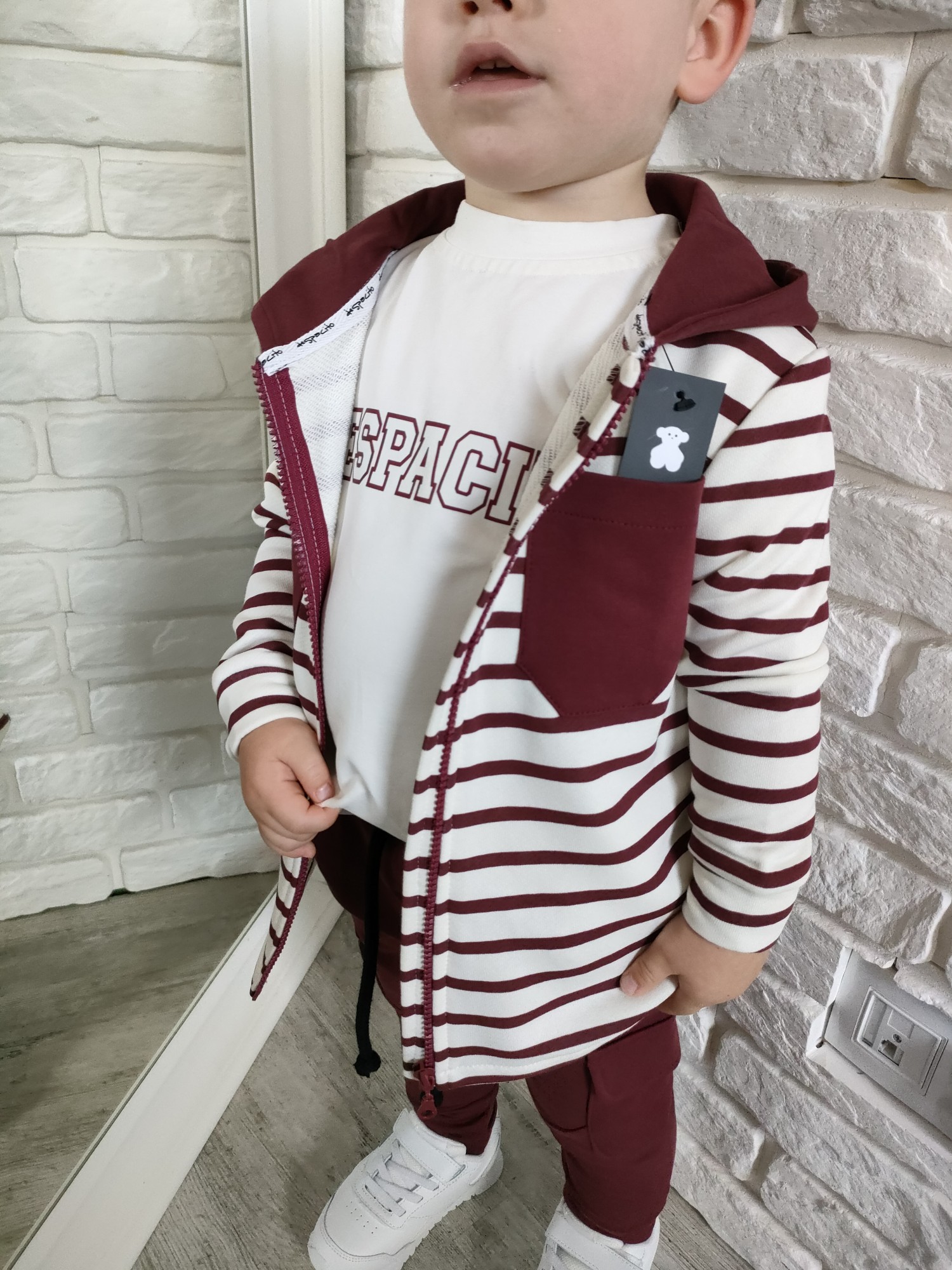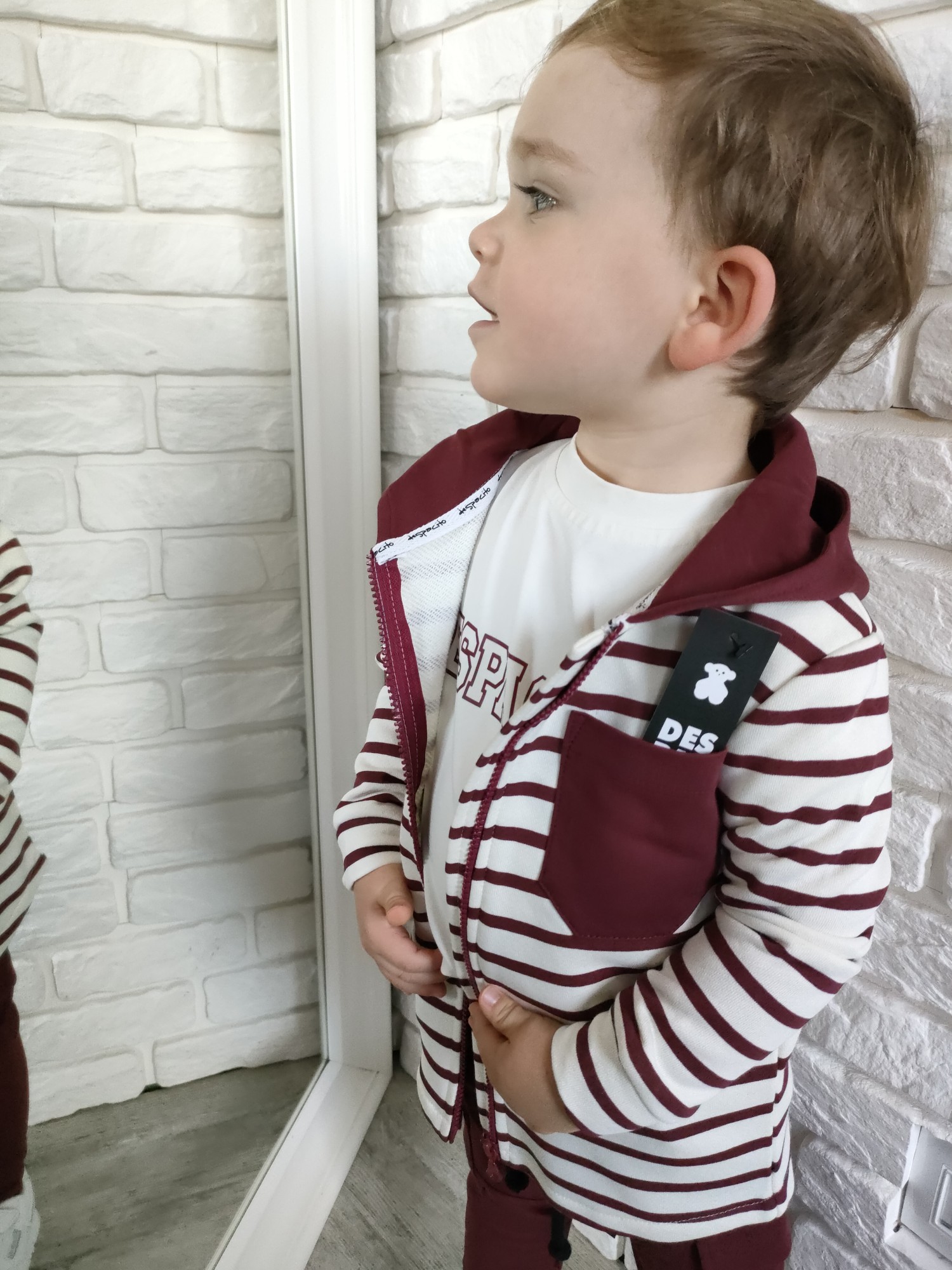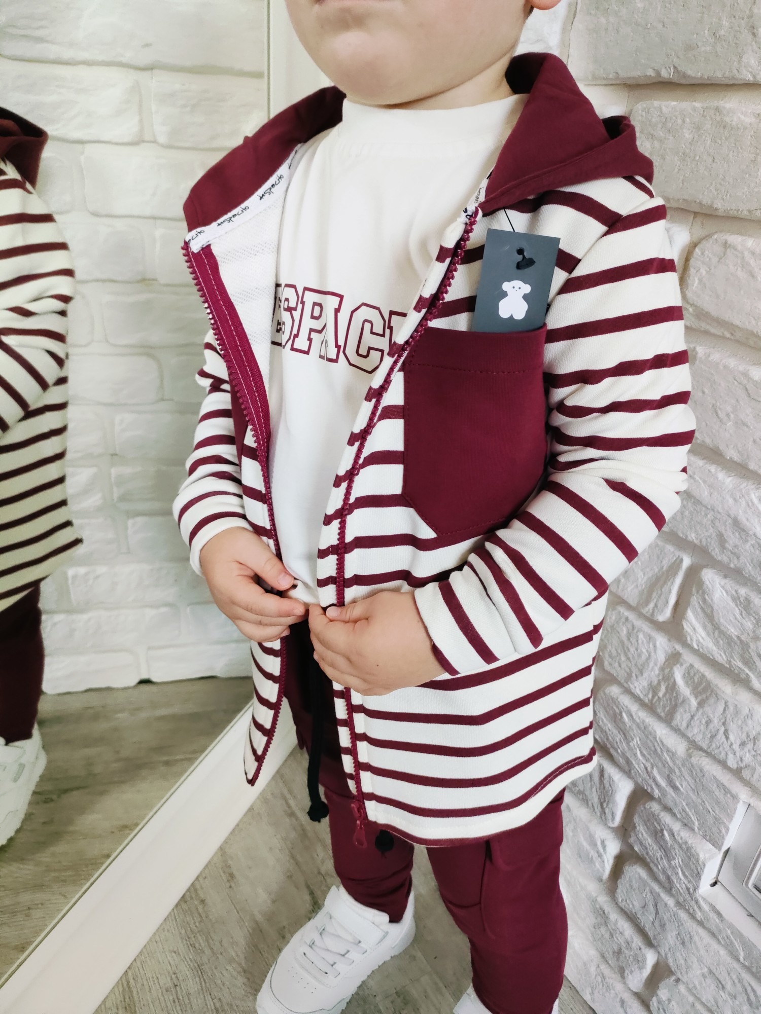 Bluza Despacito w paski „burgund” to odcień dojrzałej czerwieni spotykający się z rytmem pasków. Full-zip ogarnia poranne zakładanie w minutę, kaptur łapie wiatr, a miękka dzianina dowozi komfort w klasie i na placu. To jest ta bluza dziecięca na zamek, która gra z T-shirtem i longiem, a pod puchówką robi warstwę „na pewniaka”. Burgund w paski lubi denim, czerń, szarość, ecru i oliwkę – składasz w sekundę, wygląda jak świadomy set.