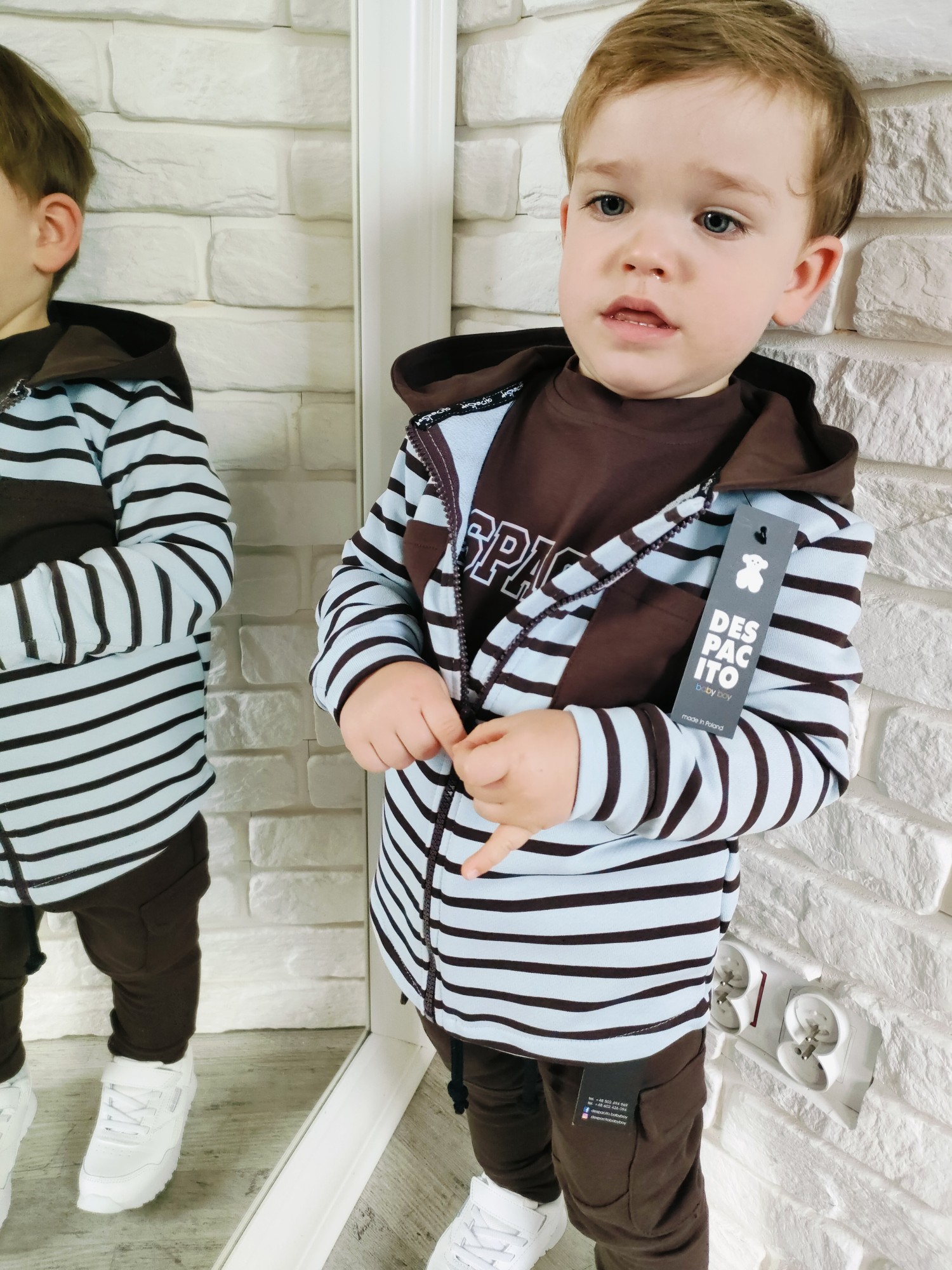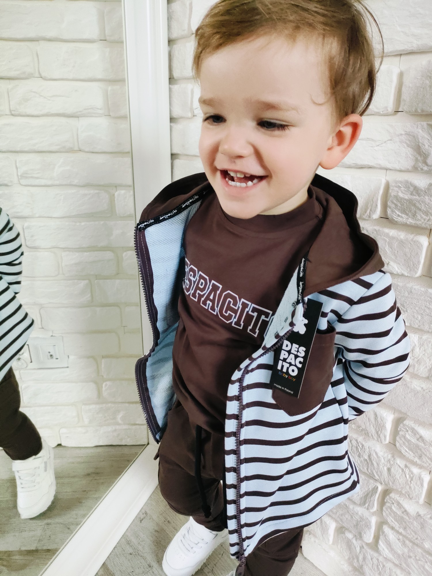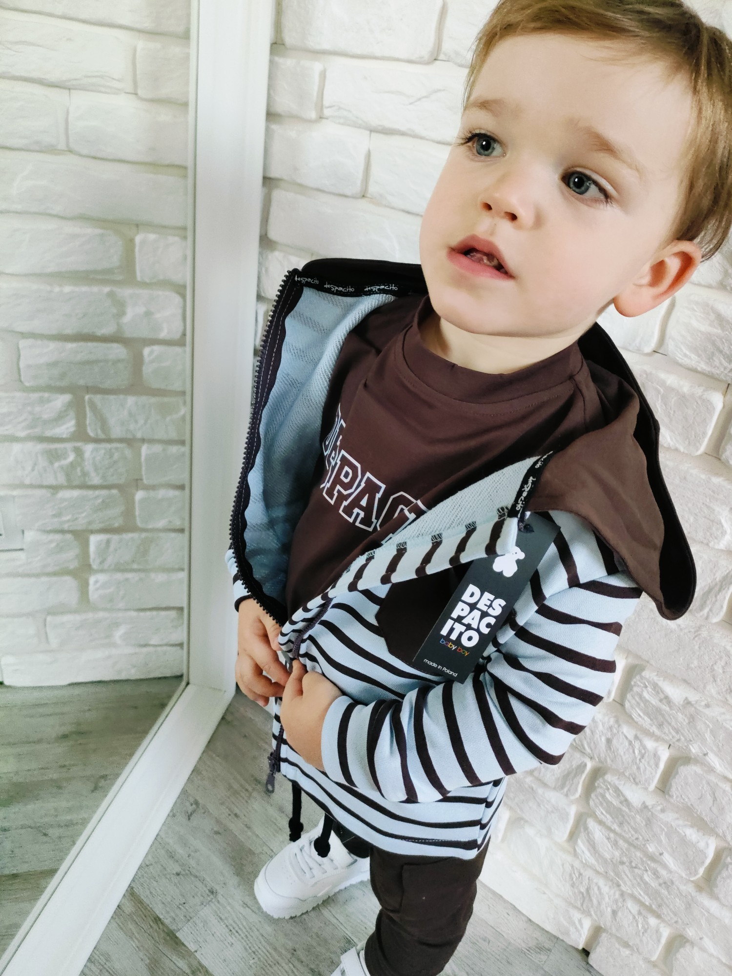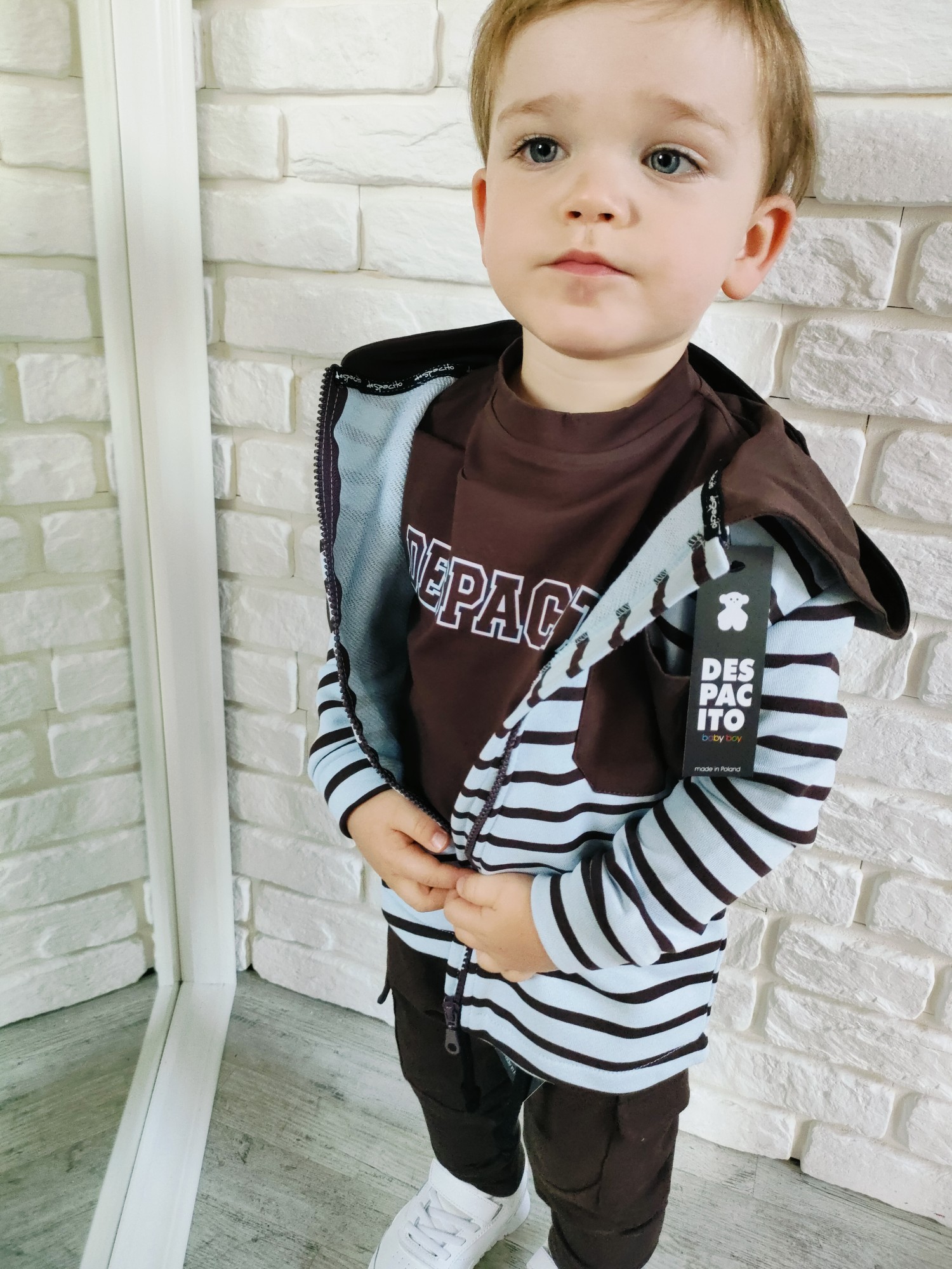 Bluza Despacito w paski „czekolada” to ciepły, głęboki brąz i rytm pasków, który robi charakter bez krzyku. Full-zip ogarnia poranki w minutę, kaptur chroni od wiatru, a miękka dzianina dowozi wygodę w klasie i na placu zabaw. To jest ta bluza dziecięca na zamek, która gra z T-shirtem i longiem, a pod puchówką daje warstwę „na pewniaka”. „Czekolada” lubi ecru, beż, oliwkę, czerń i denim – składasz w sekundę, wygląda jak przemyślany set.