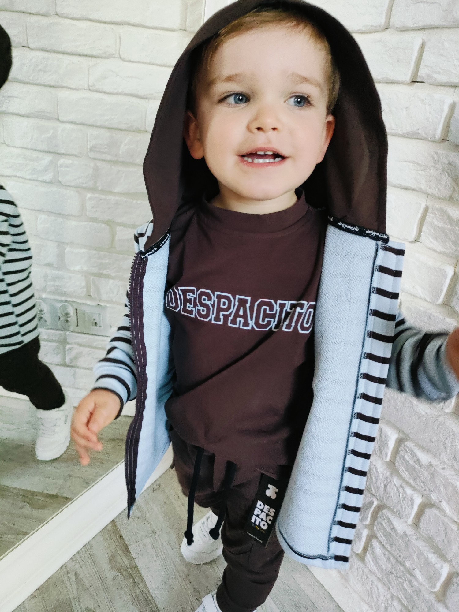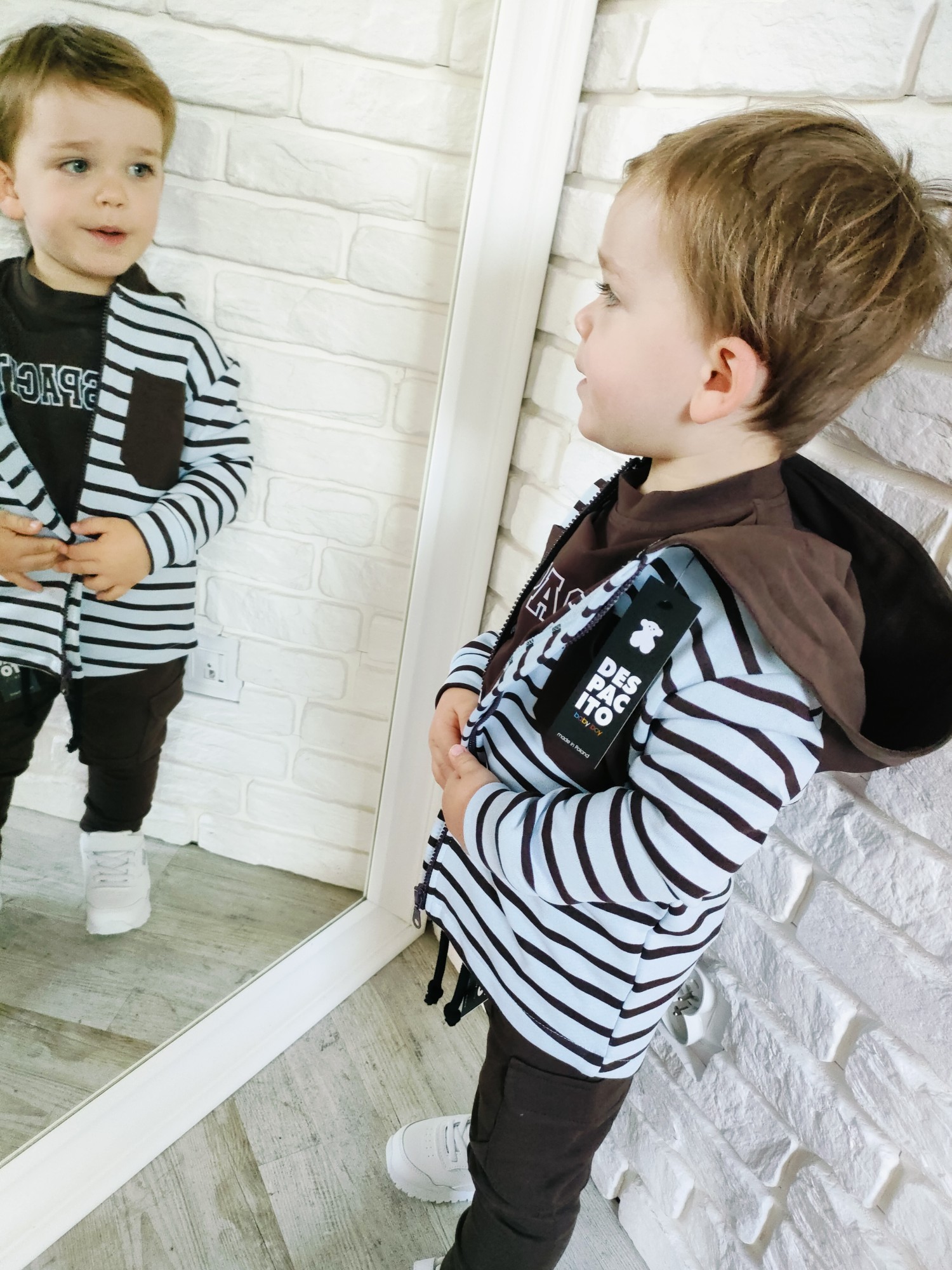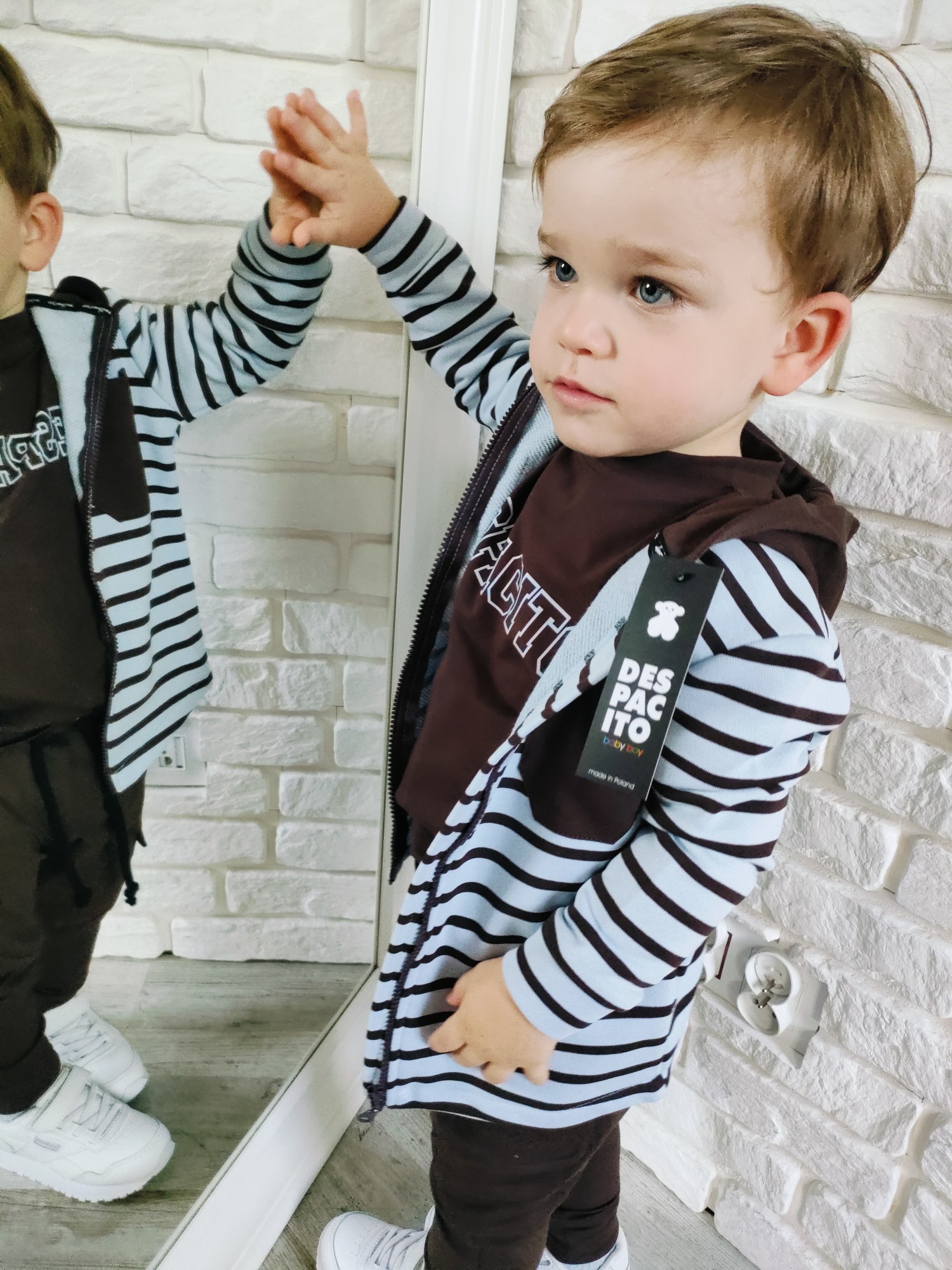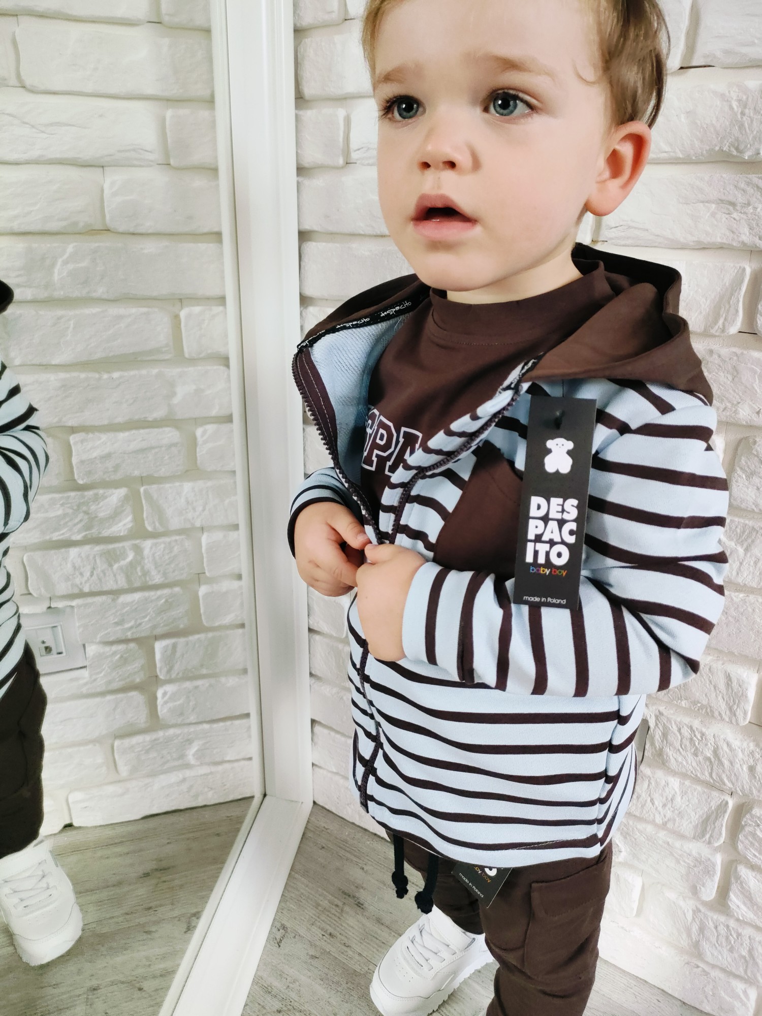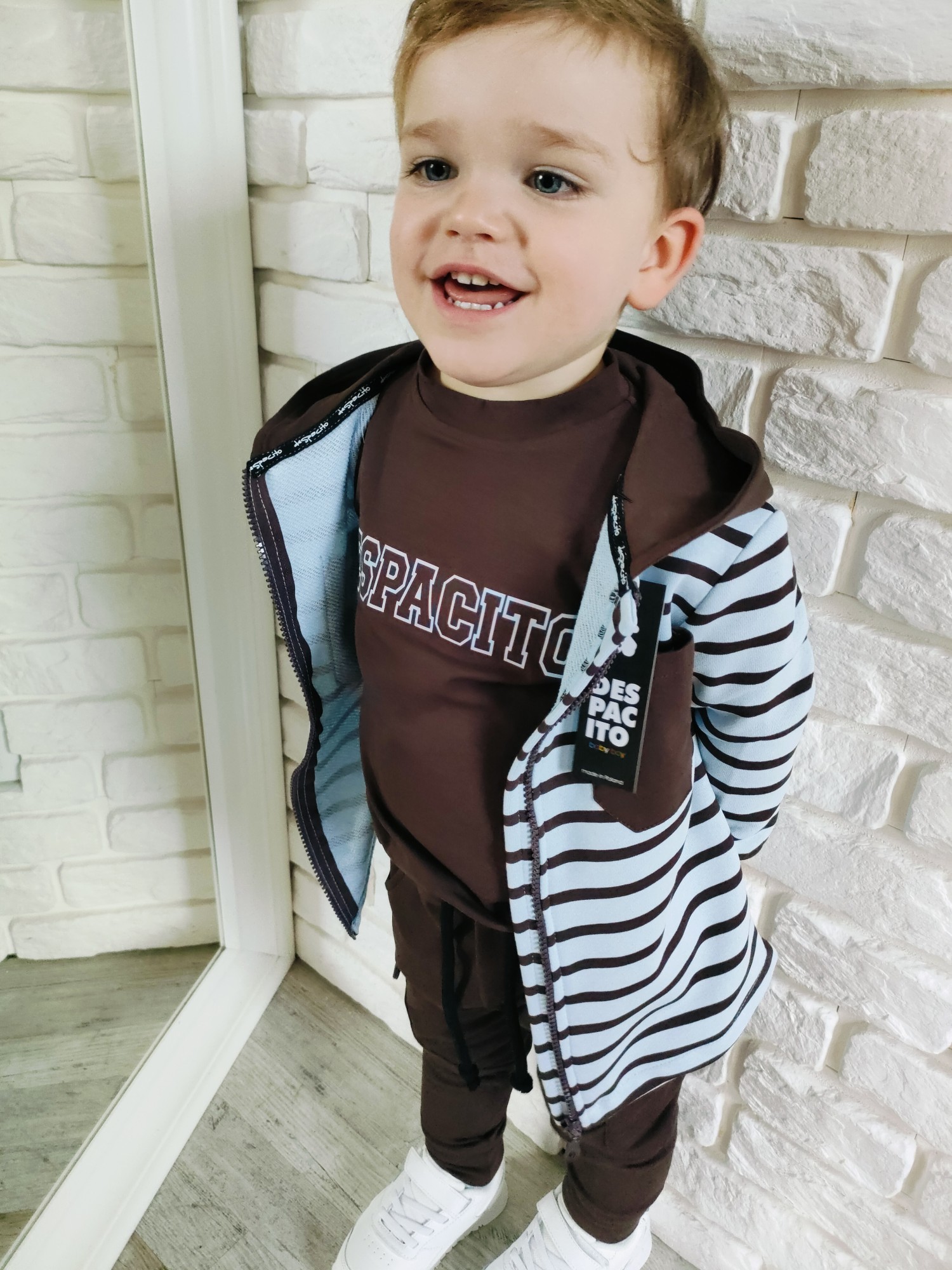 Bluza Despacito w paski „czekolada” to ciepły, głęboki brąz i rytm pasków, który robi charakter bez krzyku. Full-zip ogarnia poranki w minutę, kaptur chroni od wiatru, a miękka dzianina dowozi wygodę w klasie i na placu zabaw. To jest ta bluza dziecięca na zamek, która gra z T-shirtem i longiem, a pod puchówką daje warstwę „na pewniaka”. „Czekolada” lubi ecru, beż, oliwkę, czerń i denim – składasz w sekundę, wygląda jak przemyślany set.