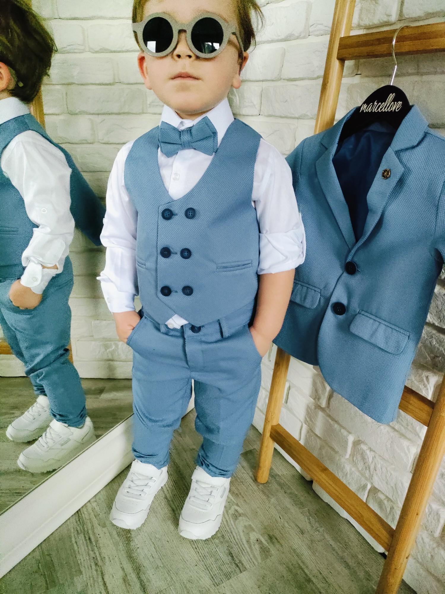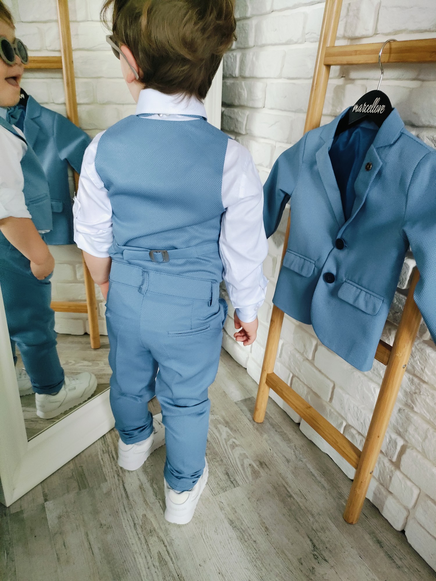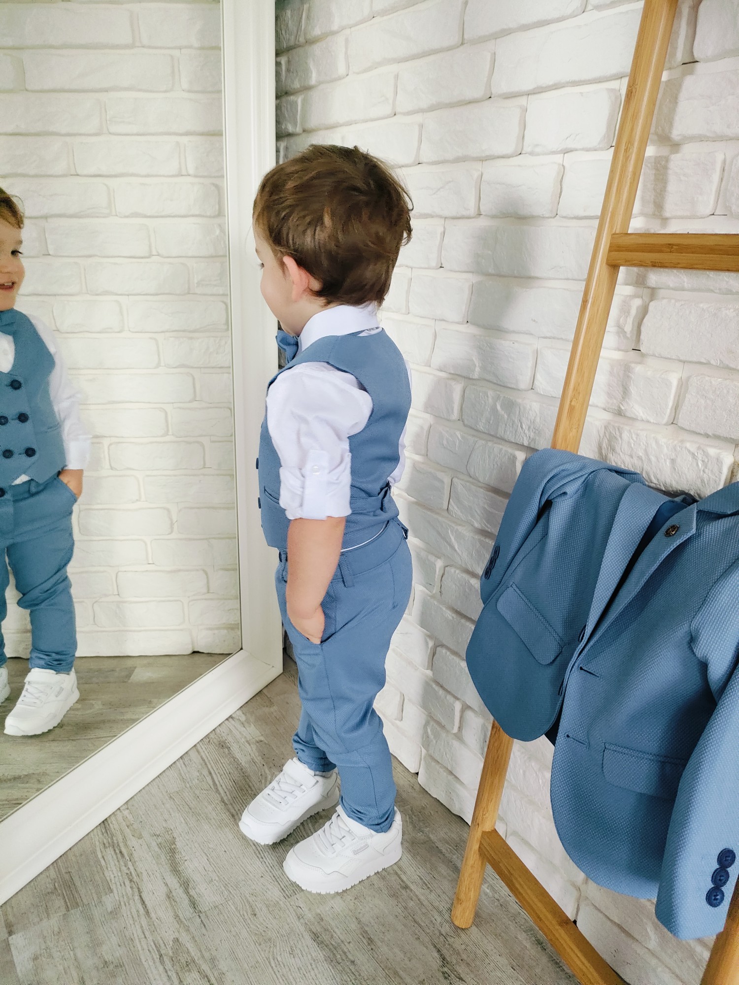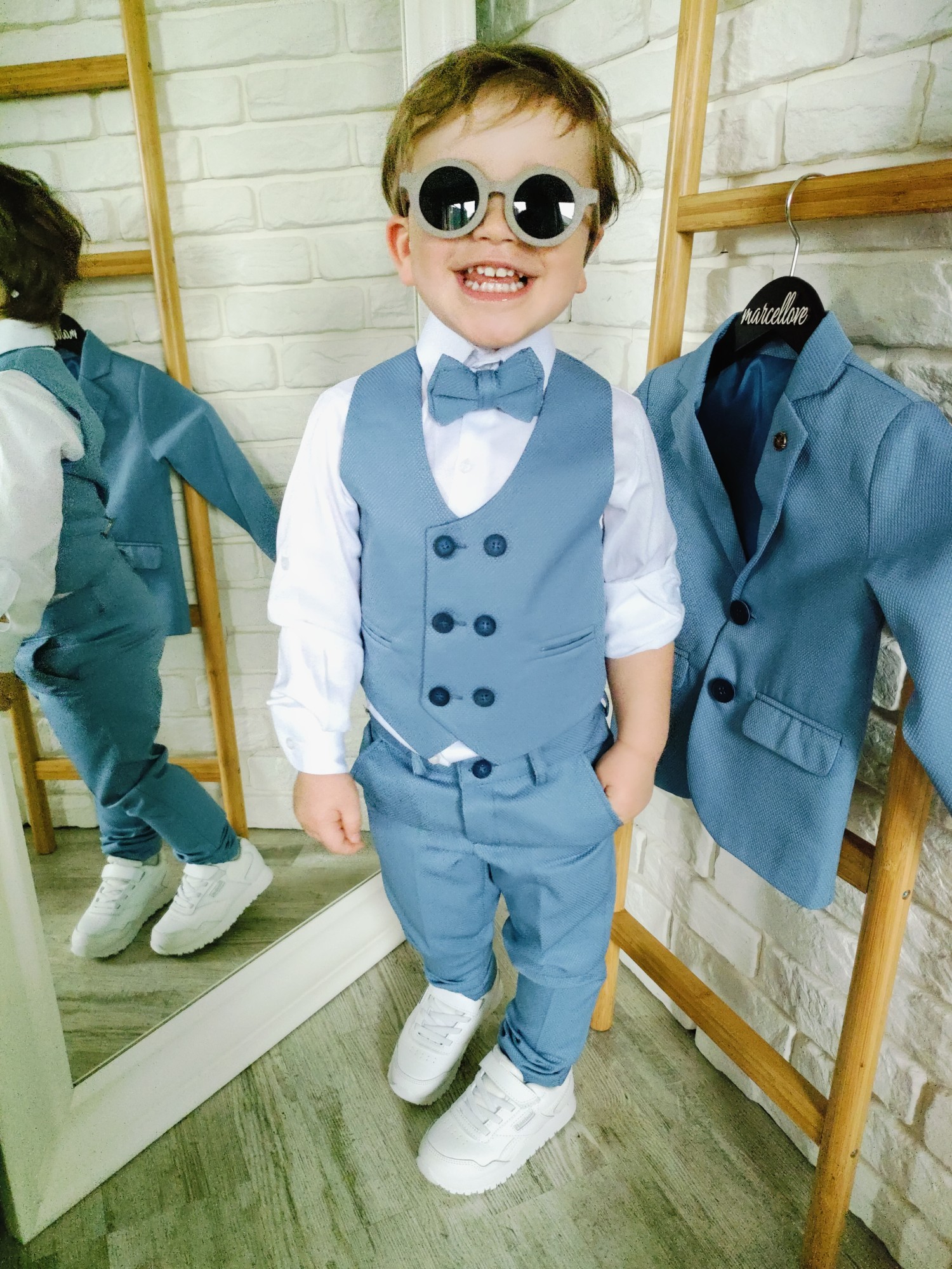 To garnitur do zadań specjalnych - akademie, komunie, śluby, ważne wyjścia - ale bez „sztywnej” aury. Materiał trzyma kształt, nie kaprysi w noszeniu i wygląda czysto od początku do końca. Rozmiar wybierasz po realnych wymiarach z tabeli - jeśli jesteś na granicy, wybierz większy, żeby kamizelka i koszula miały oddech. Kolor blue gra z brązowymi półbutami i białą koszulą, ale złapie też klimat z delikatnym beżem.