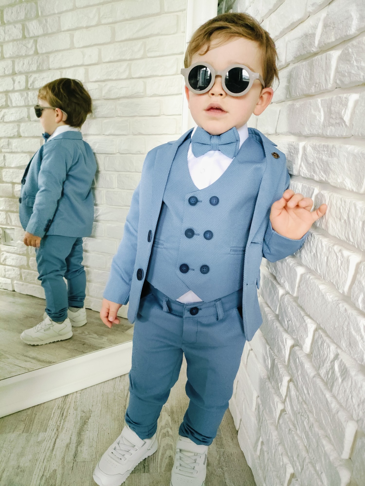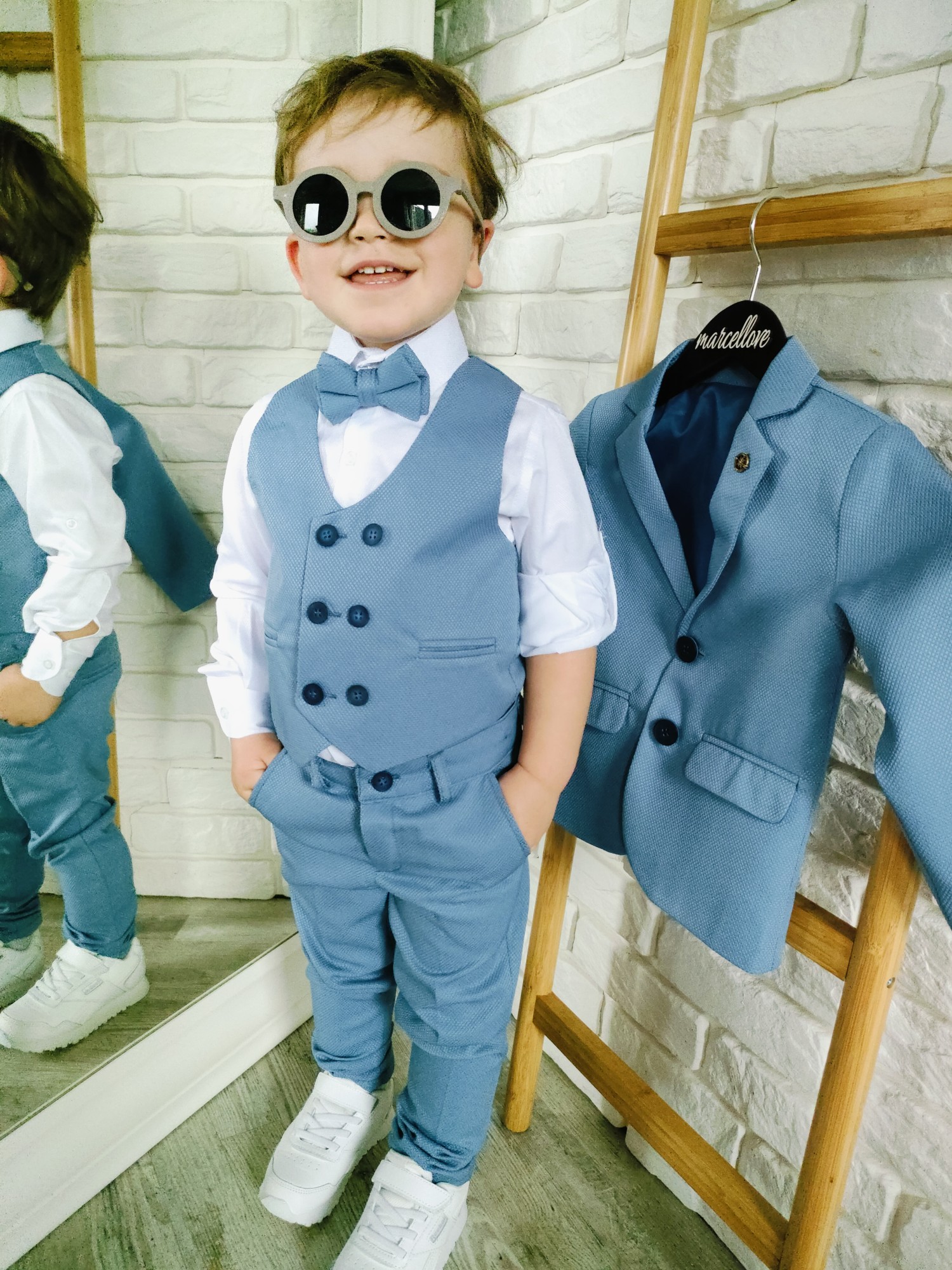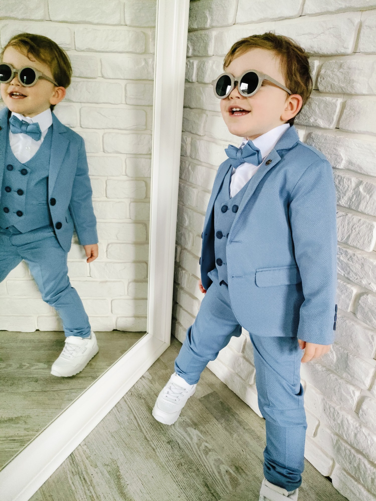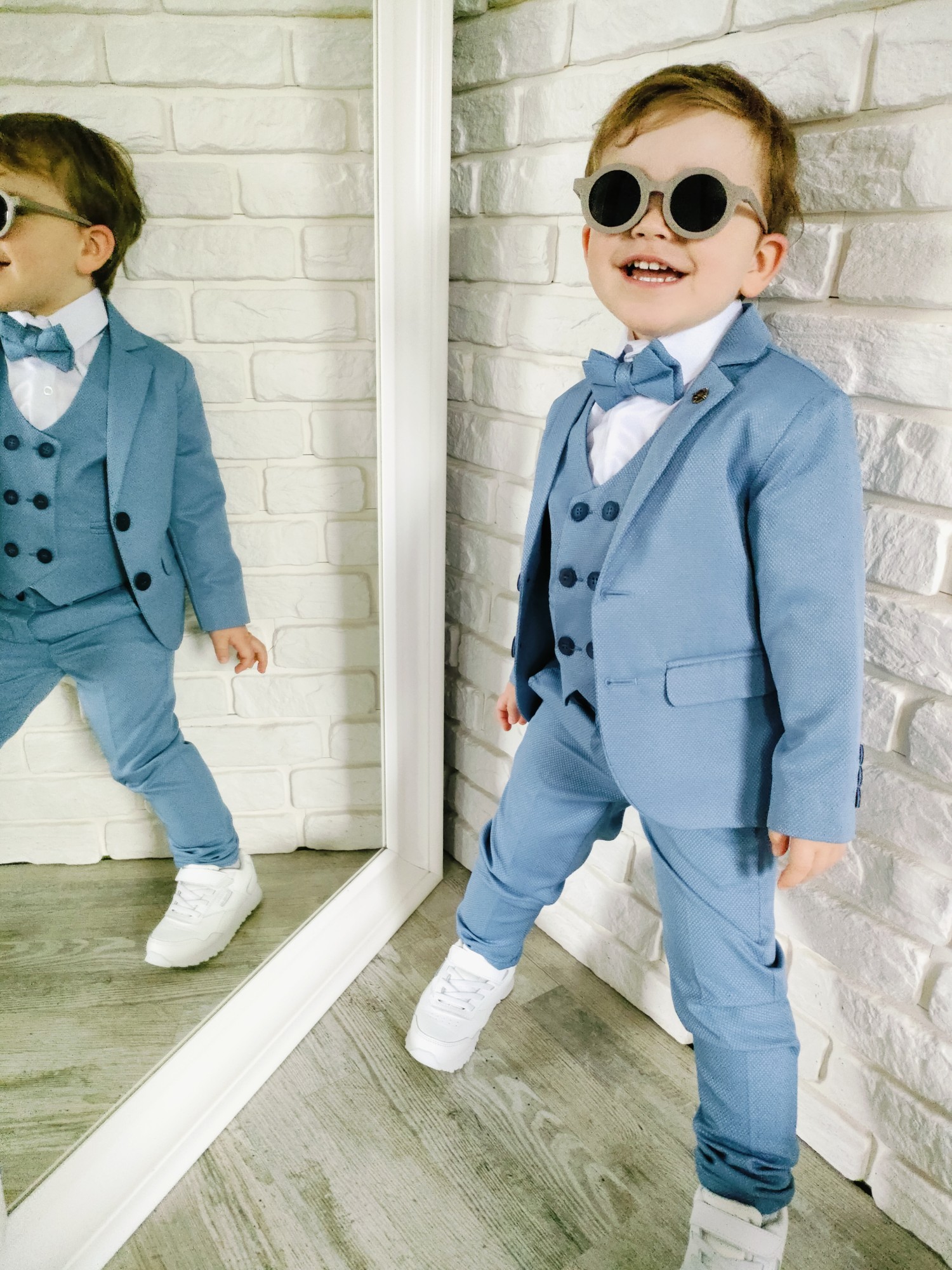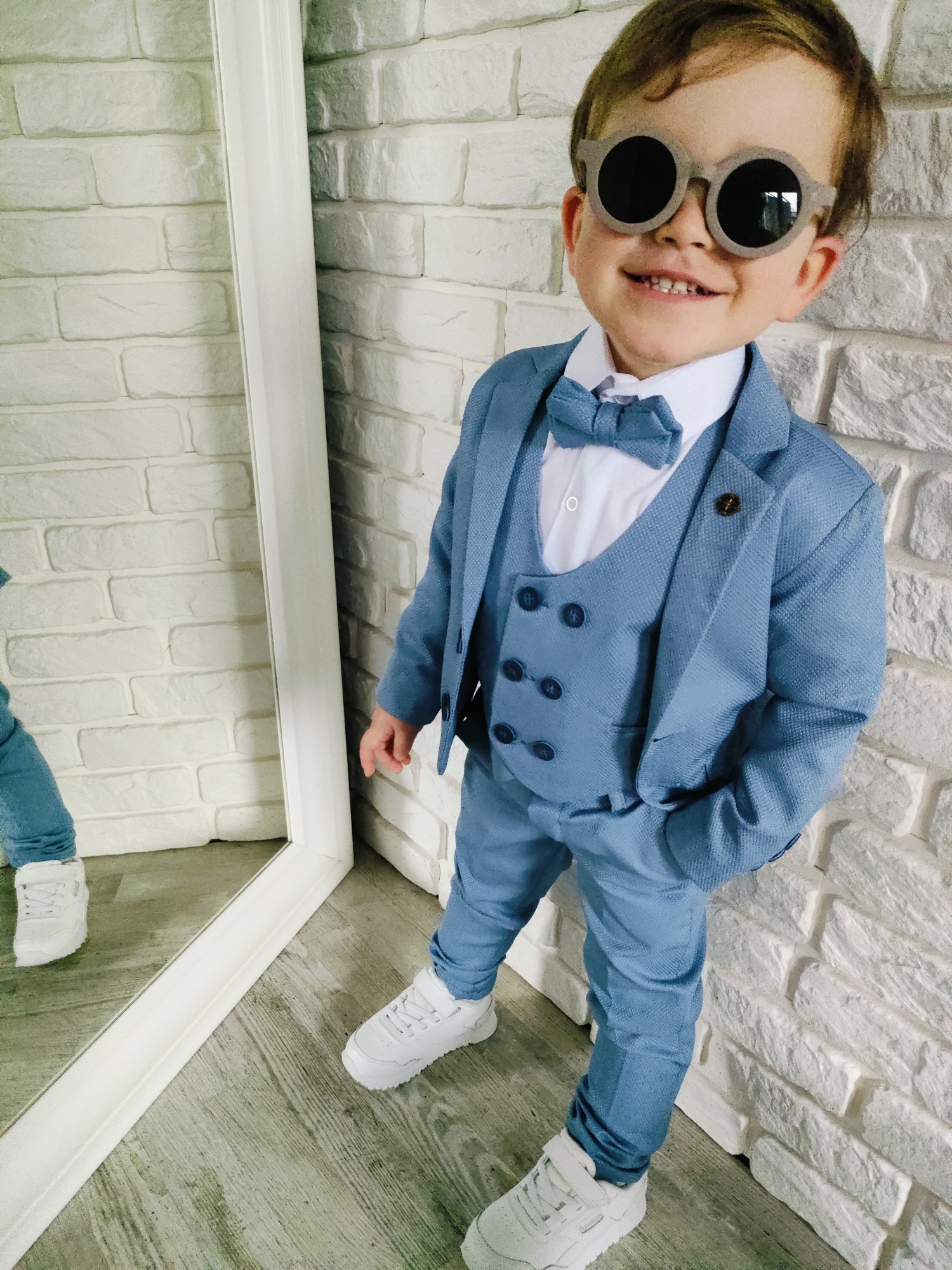 To garnitur do zadań specjalnych - akademie, komunie, śluby, ważne wyjścia - ale bez „sztywnej” aury. Materiał trzyma kształt, nie kaprysi w noszeniu i wygląda czysto od początku do końca. Rozmiar wybierasz po realnych wymiarach z tabeli - jeśli jesteś na granicy, wybierz większy, żeby kamizelka i koszula miały oddech. Kolor blue gra z brązowymi półbutami i białą koszulą, ale złapie też klimat z delikatnym beżem.