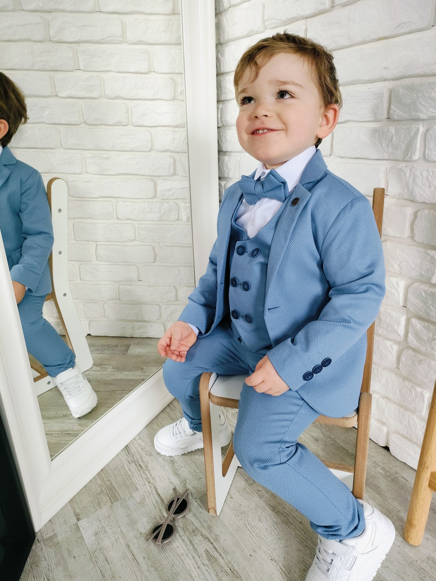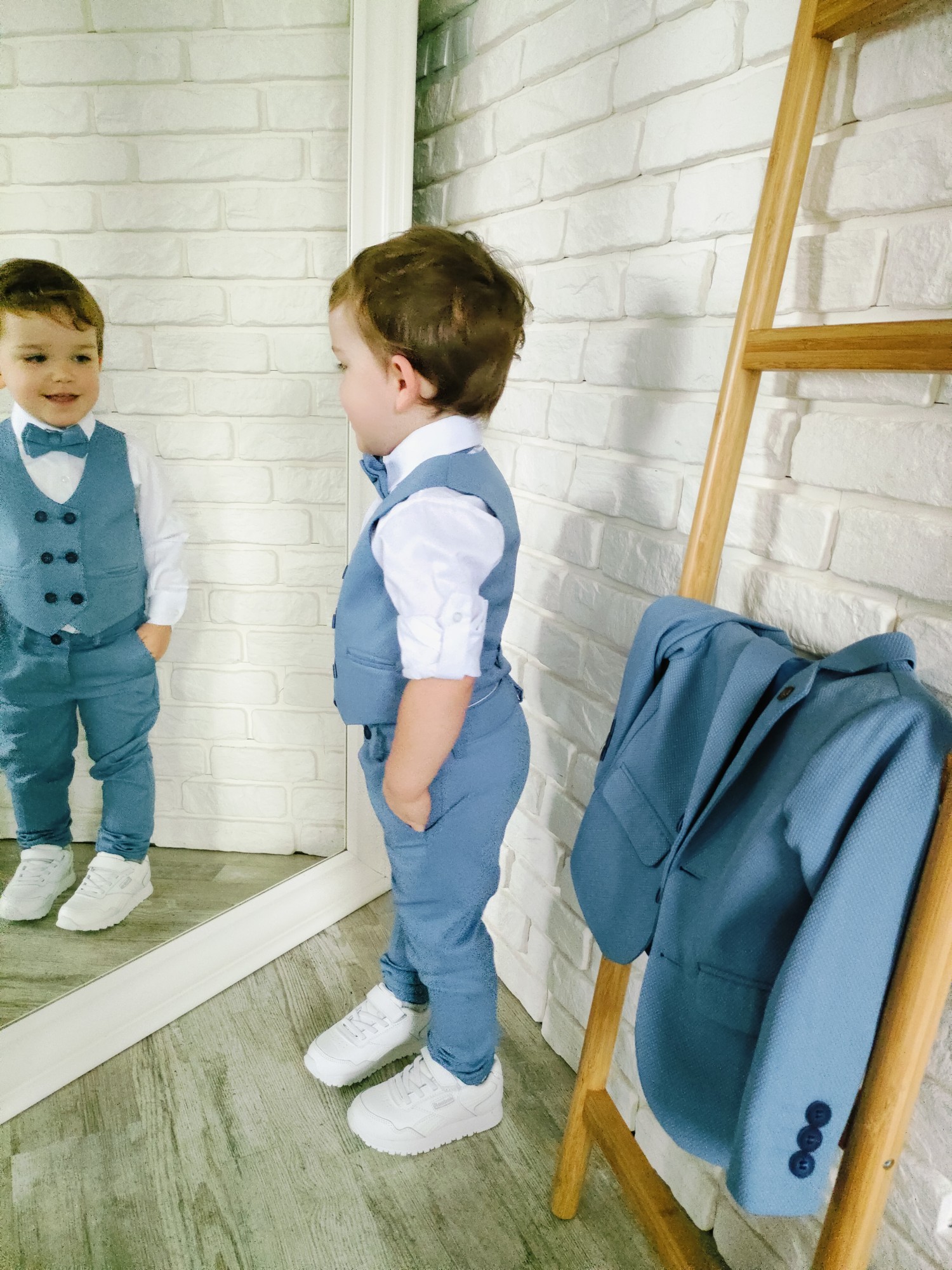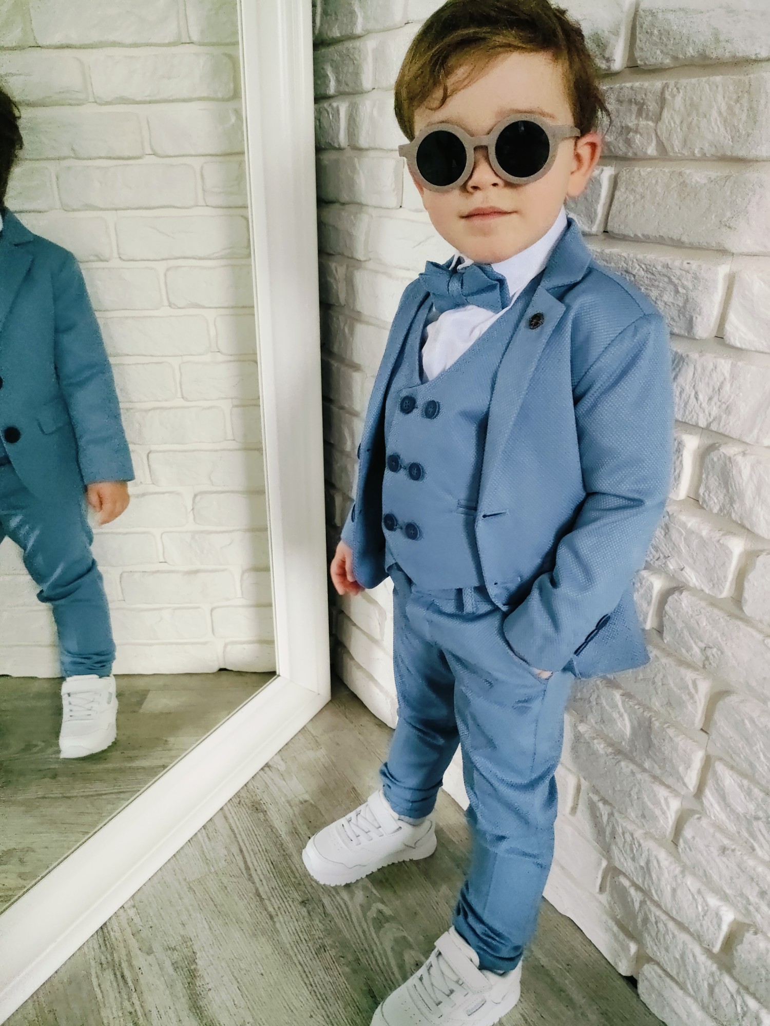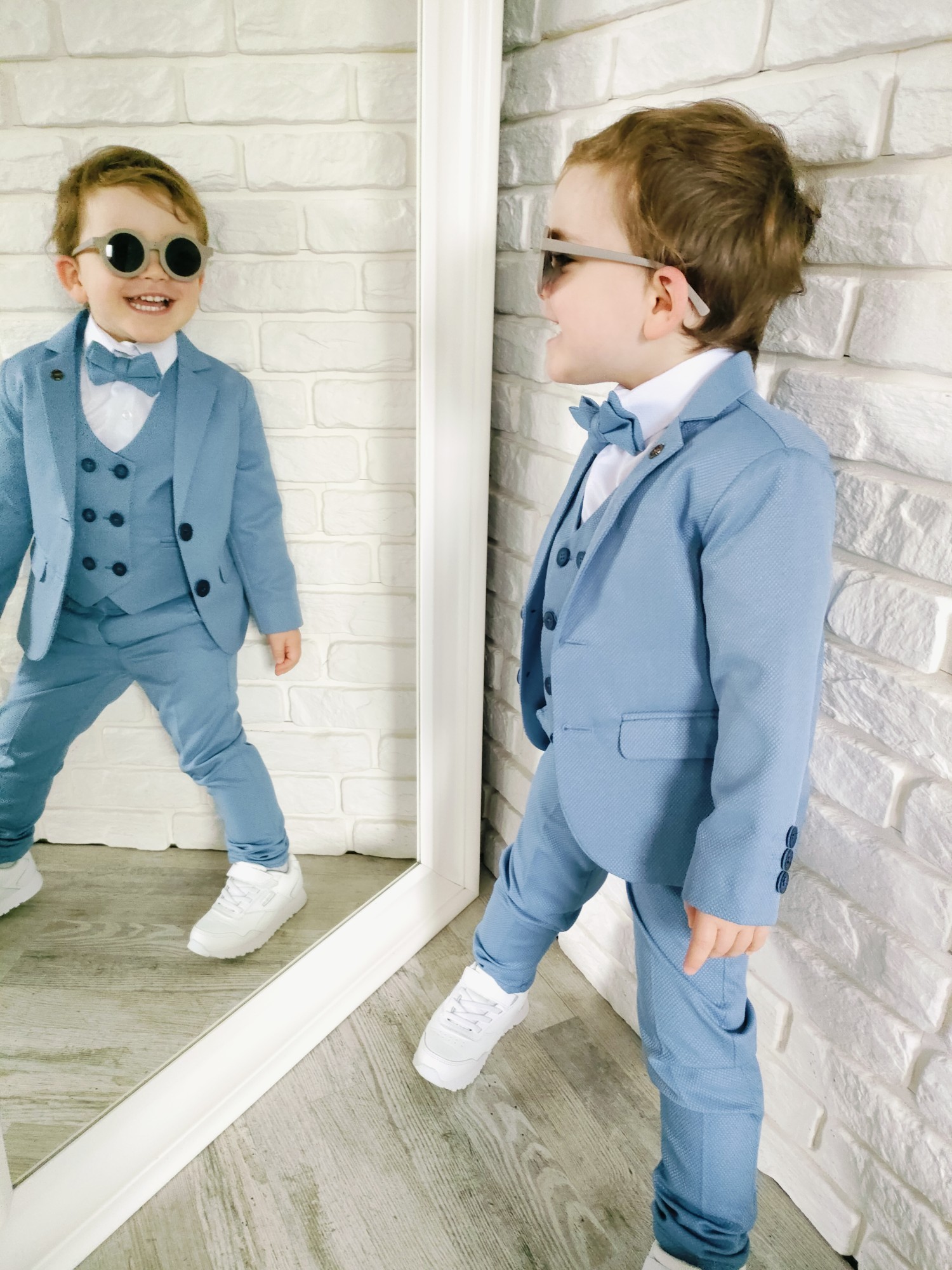 To garnitur do zadań specjalnych - akademie, komunie, śluby, ważne wyjścia - ale bez „sztywnej” aury. Materiał trzyma kształt, nie kaprysi w noszeniu i wygląda czysto od początku do końca. Rozmiar wybierasz po realnych wymiarach z tabeli - jeśli jesteś na granicy, wybierz większy, żeby kamizelka i koszula miały oddech. Kolor blue gra z brązowymi półbutami i białą koszulą, ale złapie też klimat z delikatnym beżem.