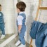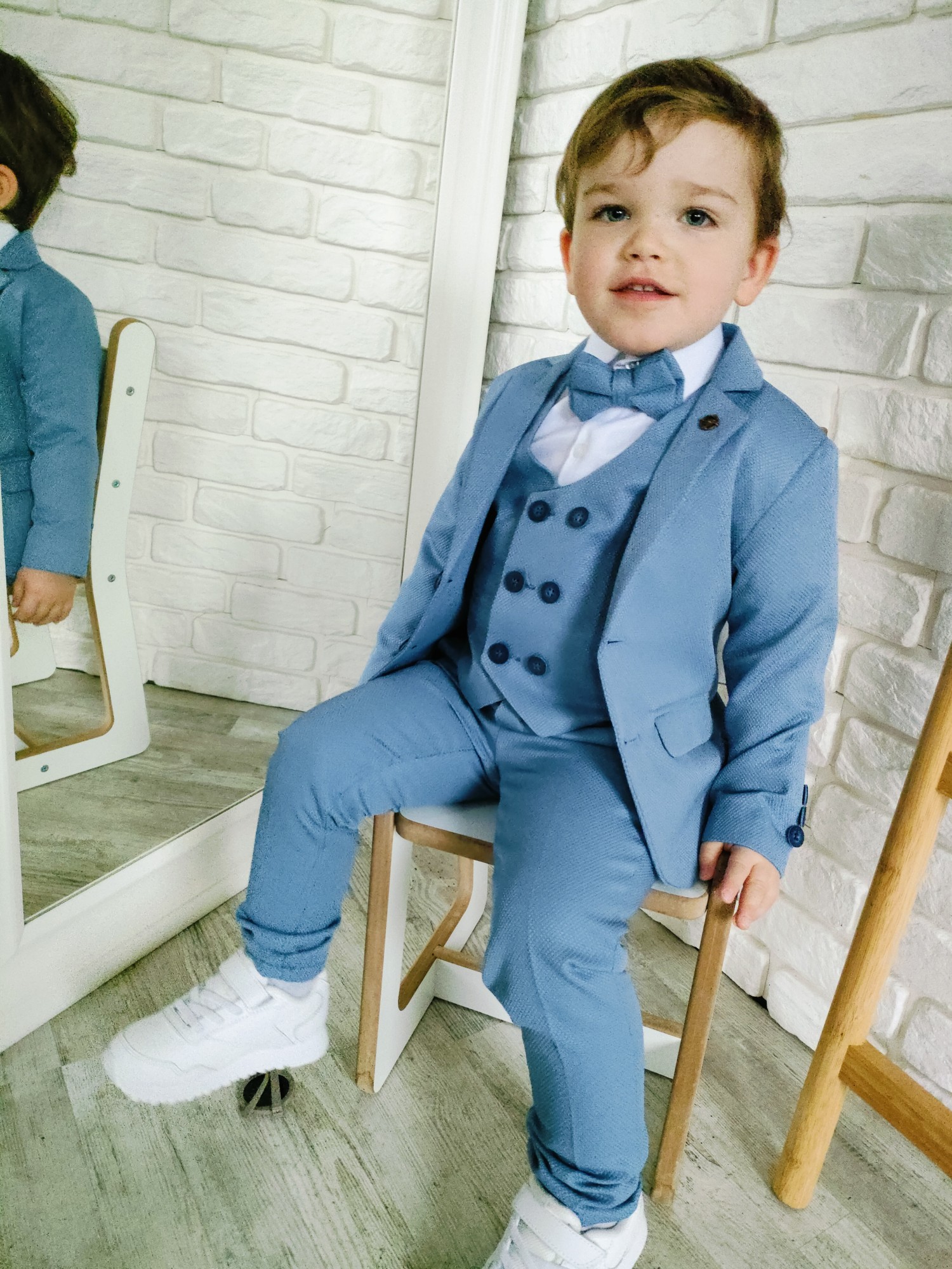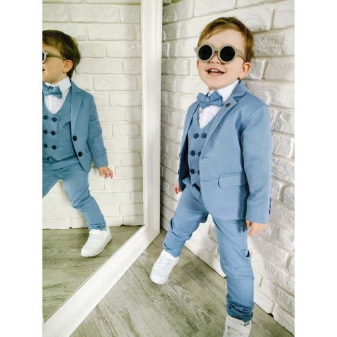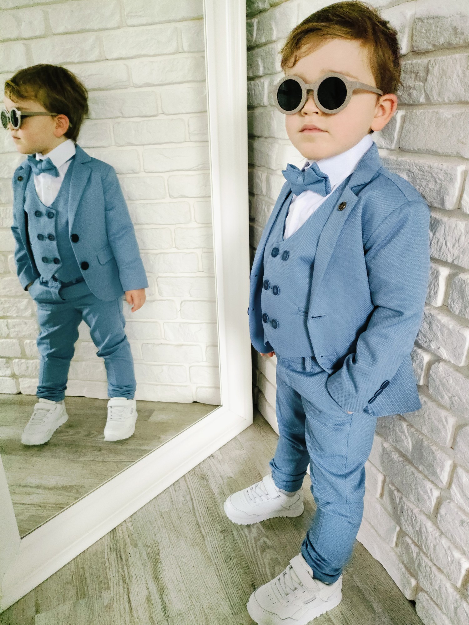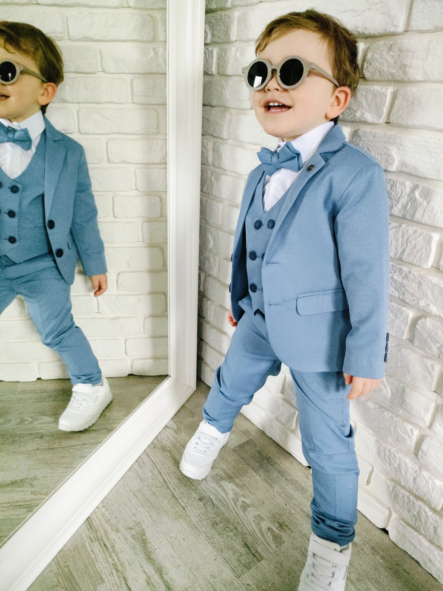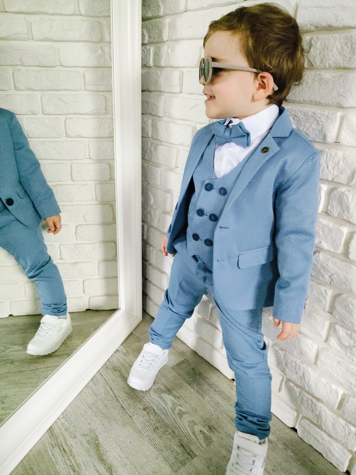 To garnitur do zadań specjalnych - akademie, komunie, śluby, ważne wyjścia - ale bez „sztywnej” aury. Materiał trzyma kształt, nie kaprysi w noszeniu i wygląda czysto od początku do końca. Rozmiar wybierasz po realnych wymiarach z tabeli - jeśli jesteś na granicy, wybierz większy, żeby kamizelka i koszula miały oddech. Kolor blue gra z brązowymi półbutami i białą koszulą, ale złapie też klimat z delikatnym beżem.
