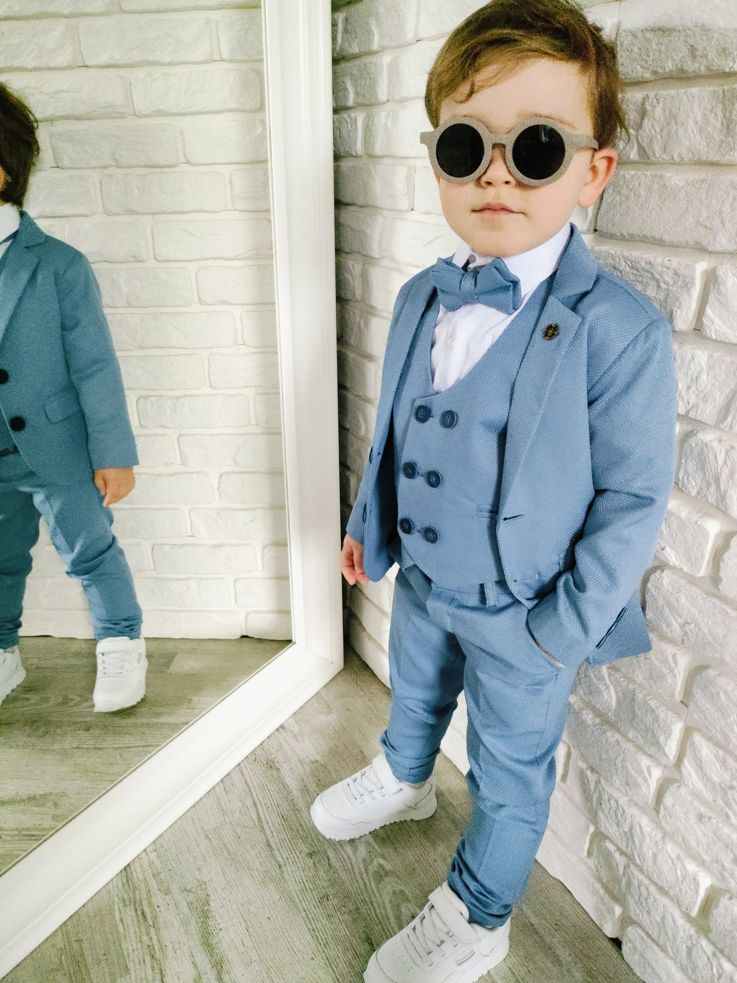 To garnitur do zadań specjalnych - akademie, komunie, śluby, ważne wyjścia - ale bez „sztywnej” aury. Materiał trzyma kształt, nie kaprysi w noszeniu i wygląda czysto od początku do końca. Rozmiar wybierasz po realnych wymiarach z tabeli - jeśli jesteś na granicy, wybierz większy, żeby kamizelka i koszula miały oddech. Kolor blue gra z brązowymi półbutami i białą koszulą, ale złapie też klimat z delikatnym beżem.