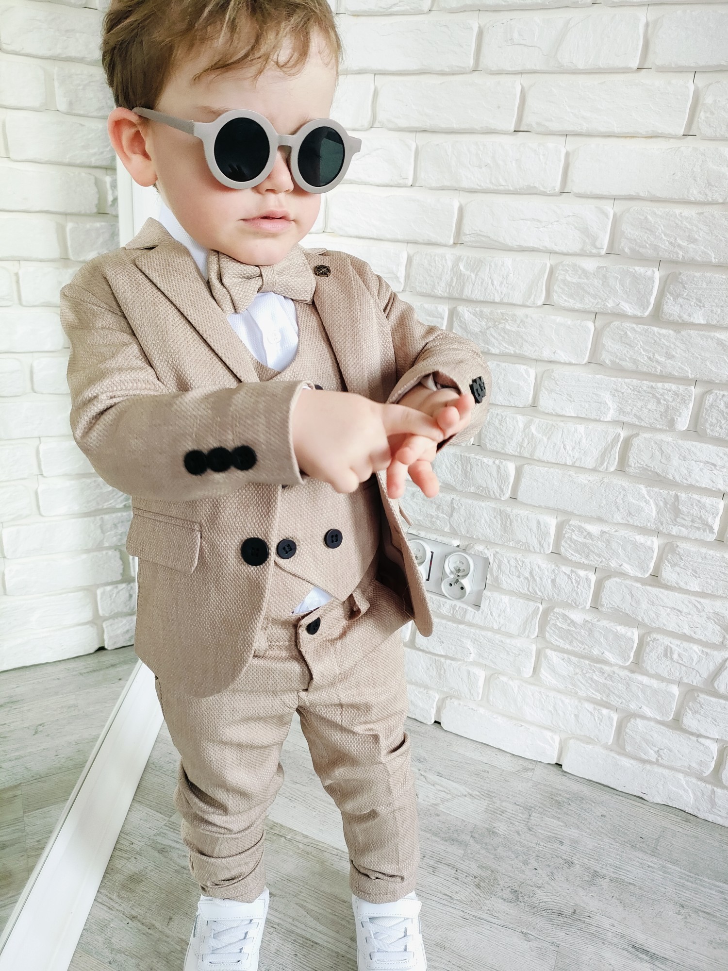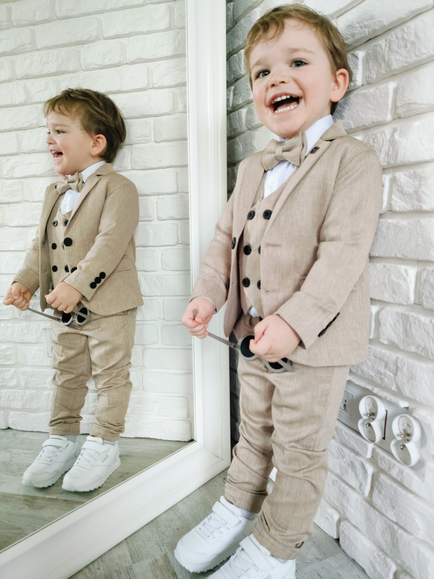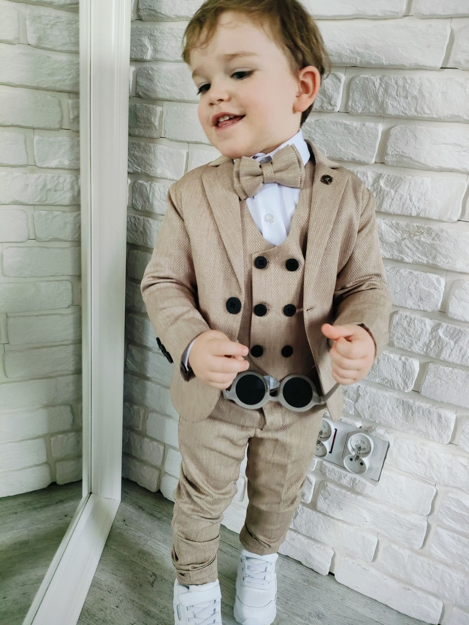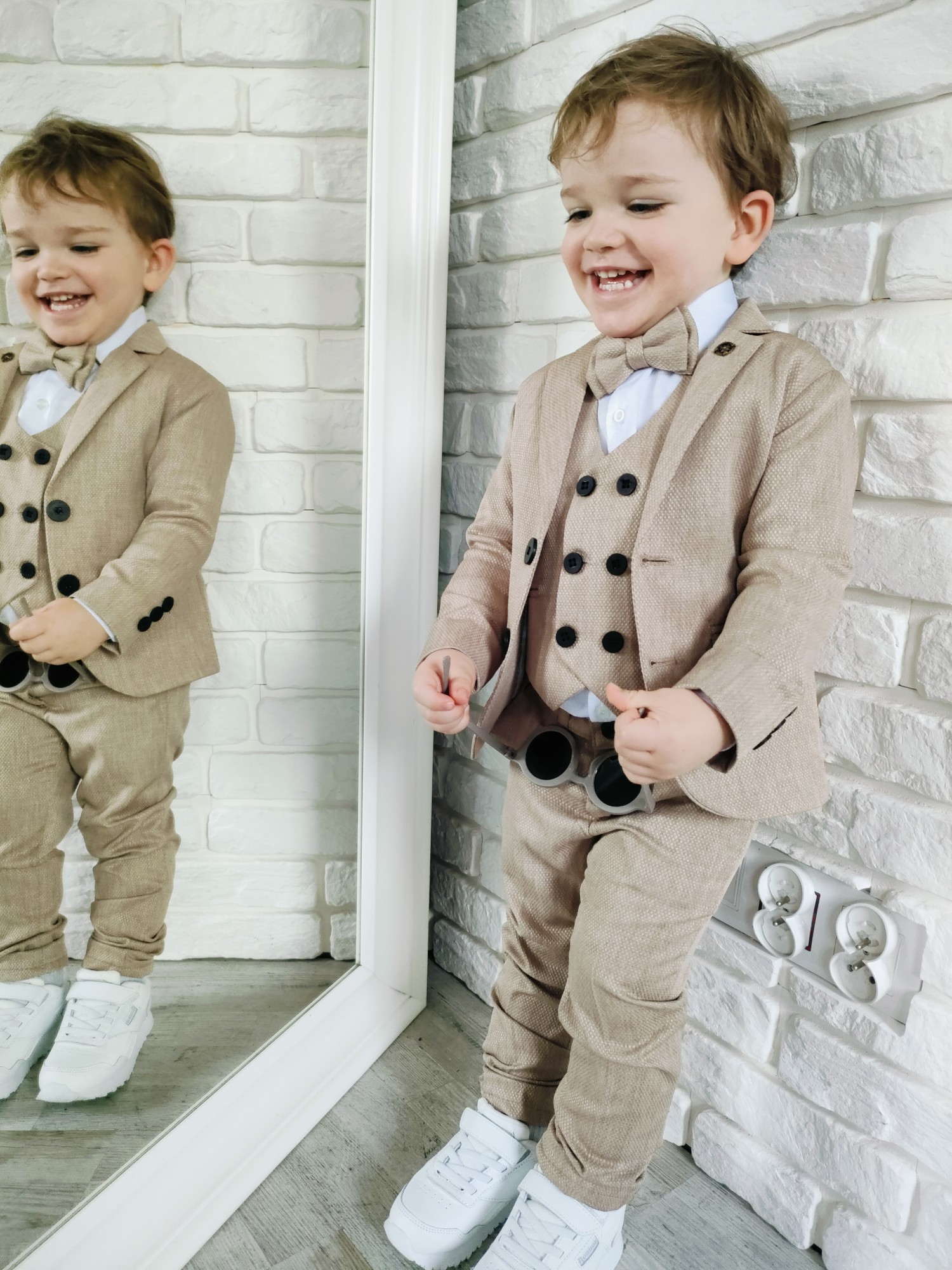 Kolor latte - miękki jak niedzielne światło, elegancki bez zadęcia. Ten komplet to pełne wyjściowe abc: marynarka układa się równo, kamizelka podkreśla linię dzięki tylnemu ściągaczowi, a spodnie trzymają formę kantem i mają dwustronną regulację, więc rosną z młodym dżentelmenem o pół rozmiaru. Koszula? Ma spryt - rękaw możesz podpiąć „na krótki”, kiedy zrobi się ciepło. Mucha na regulowanym pasku siada idealnie i nie ucieka. W komplecie dostajesz też przypinkę w kształcie róży wiatrów - mały detal, duży efekt.