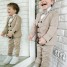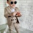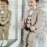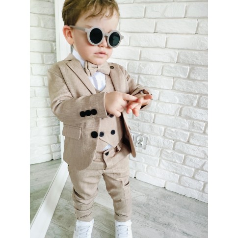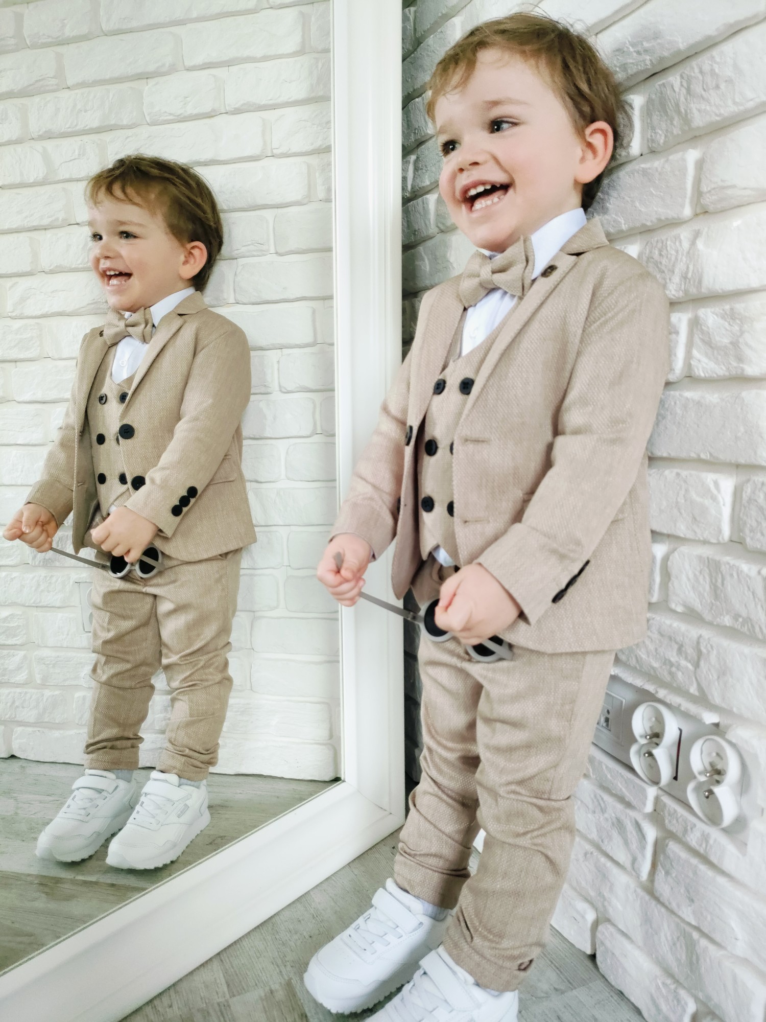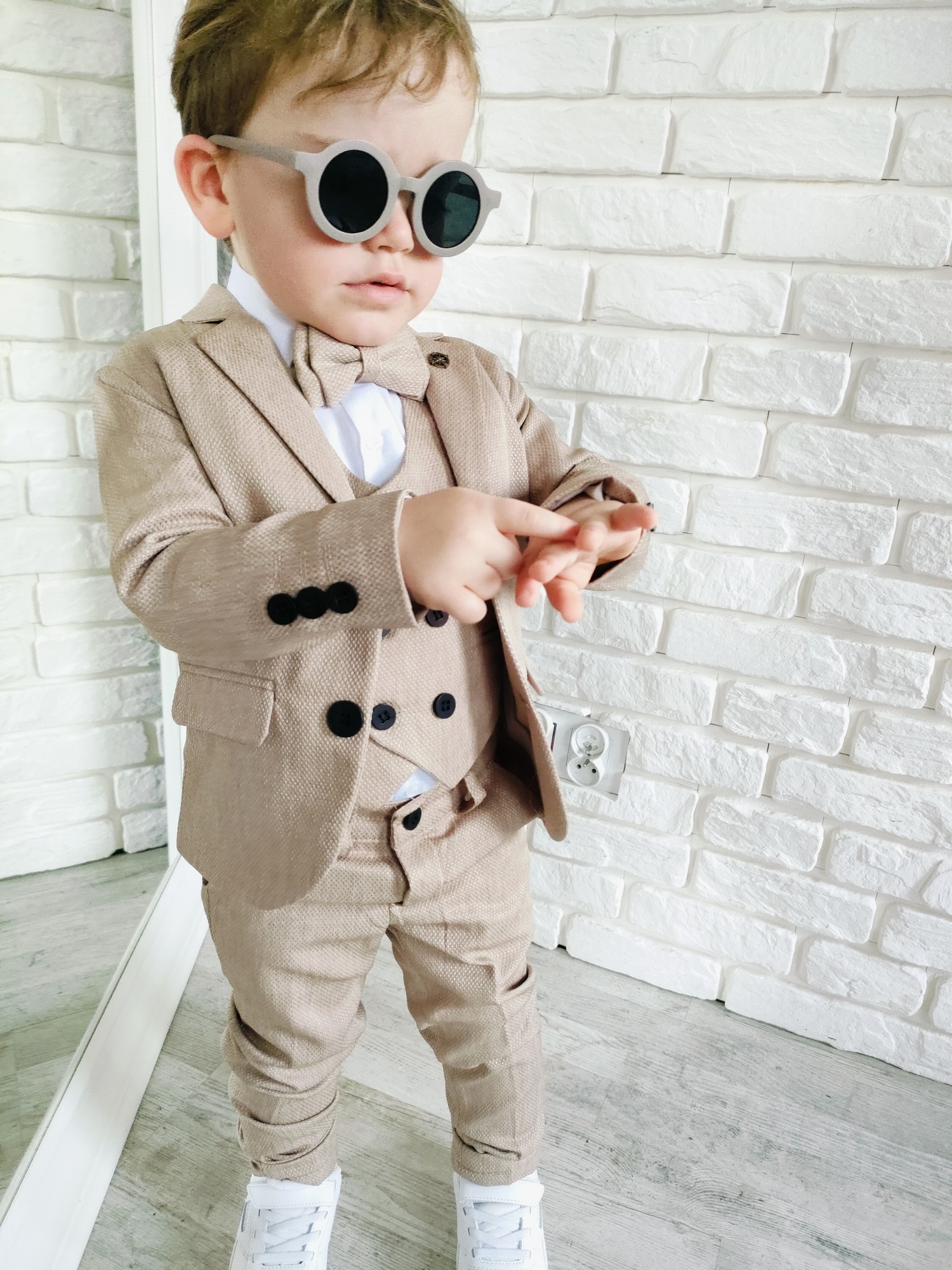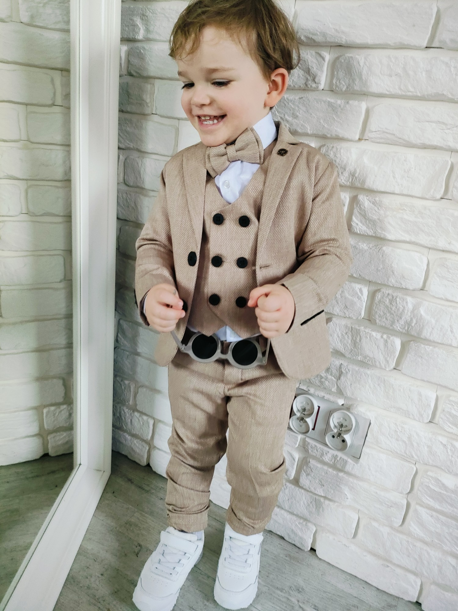 Kolor latte - miękki jak niedzielne światło, elegancki bez zadęcia. Ten komplet to pełne wyjściowe abc: marynarka układa się równo, kamizelka podkreśla linię dzięki tylnemu ściągaczowi, a spodnie trzymają formę kantem i mają dwustronną regulację, więc rosną z młodym dżentelmenem o pół rozmiaru. Koszula? Ma spryt - rękaw możesz podpiąć „na krótki”, kiedy zrobi się ciepło. Mucha na regulowanym pasku siada idealnie i nie ucieka. W komplecie dostajesz też przypinkę w kształcie róży wiatrów - mały detal, duży efekt.
