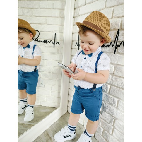 Zestaw składa się z koszuli, muchy, szelek i spodenek– całość tworzy spójny look na wielkie okazje i rodzinne święta.