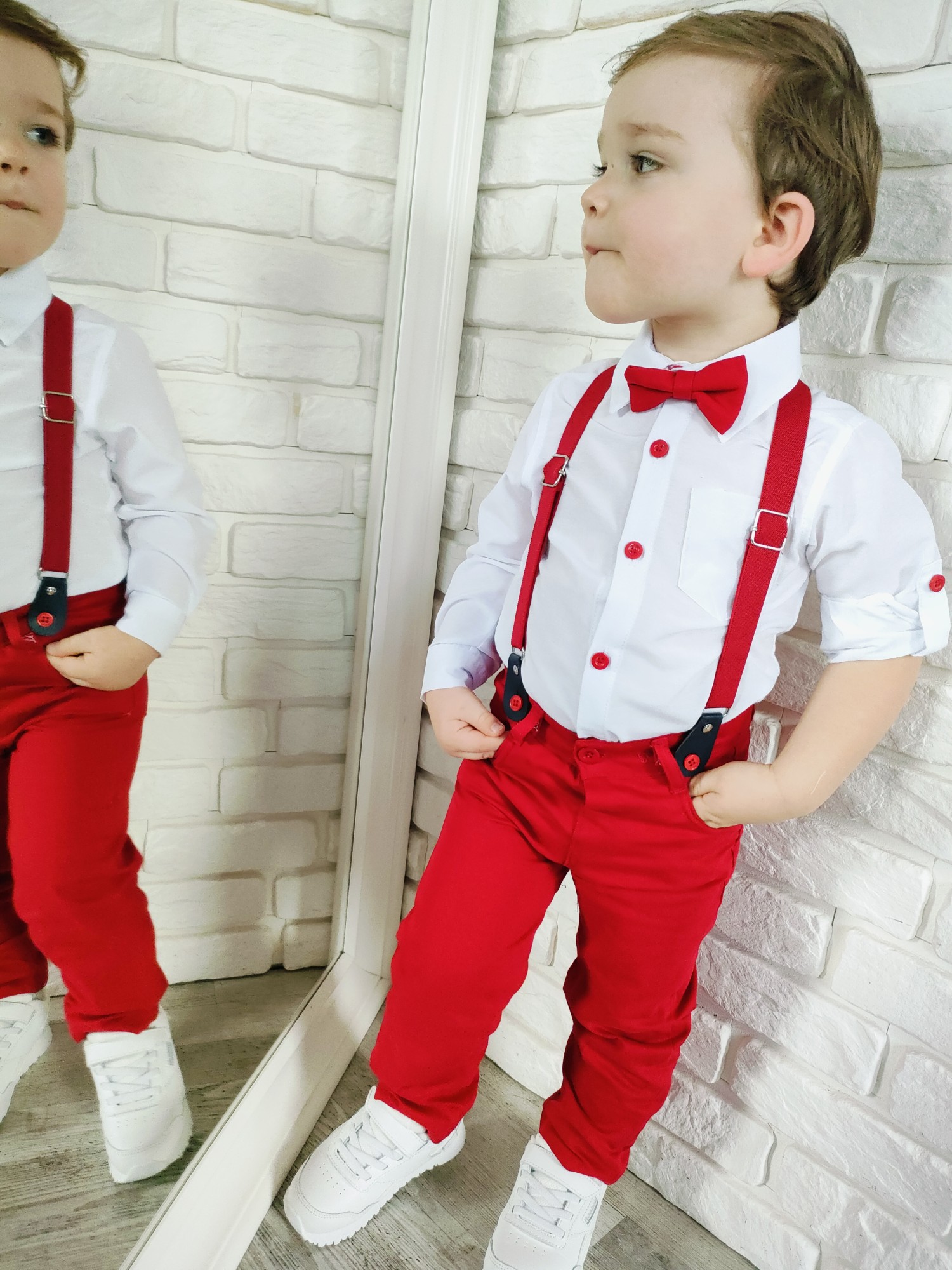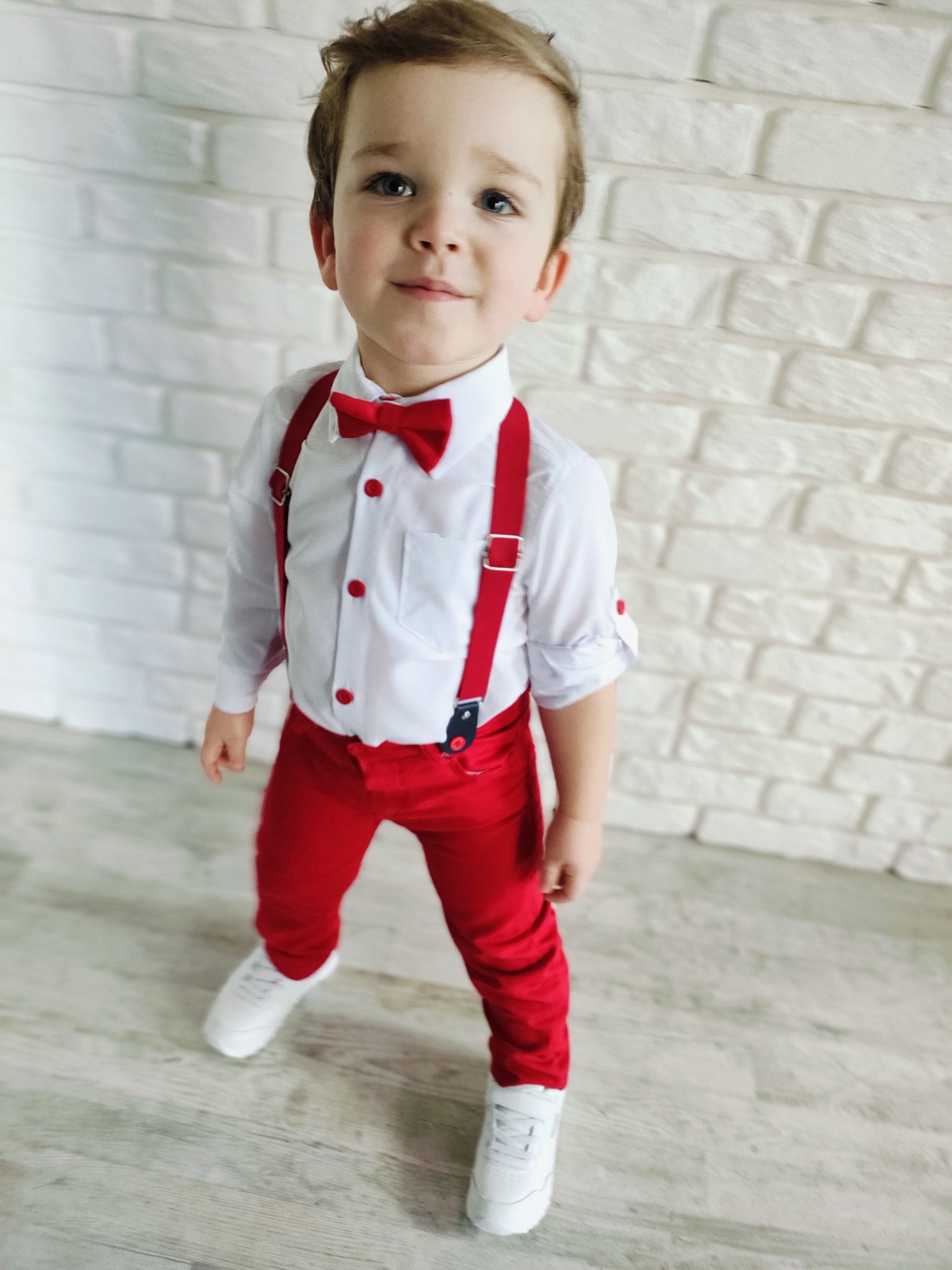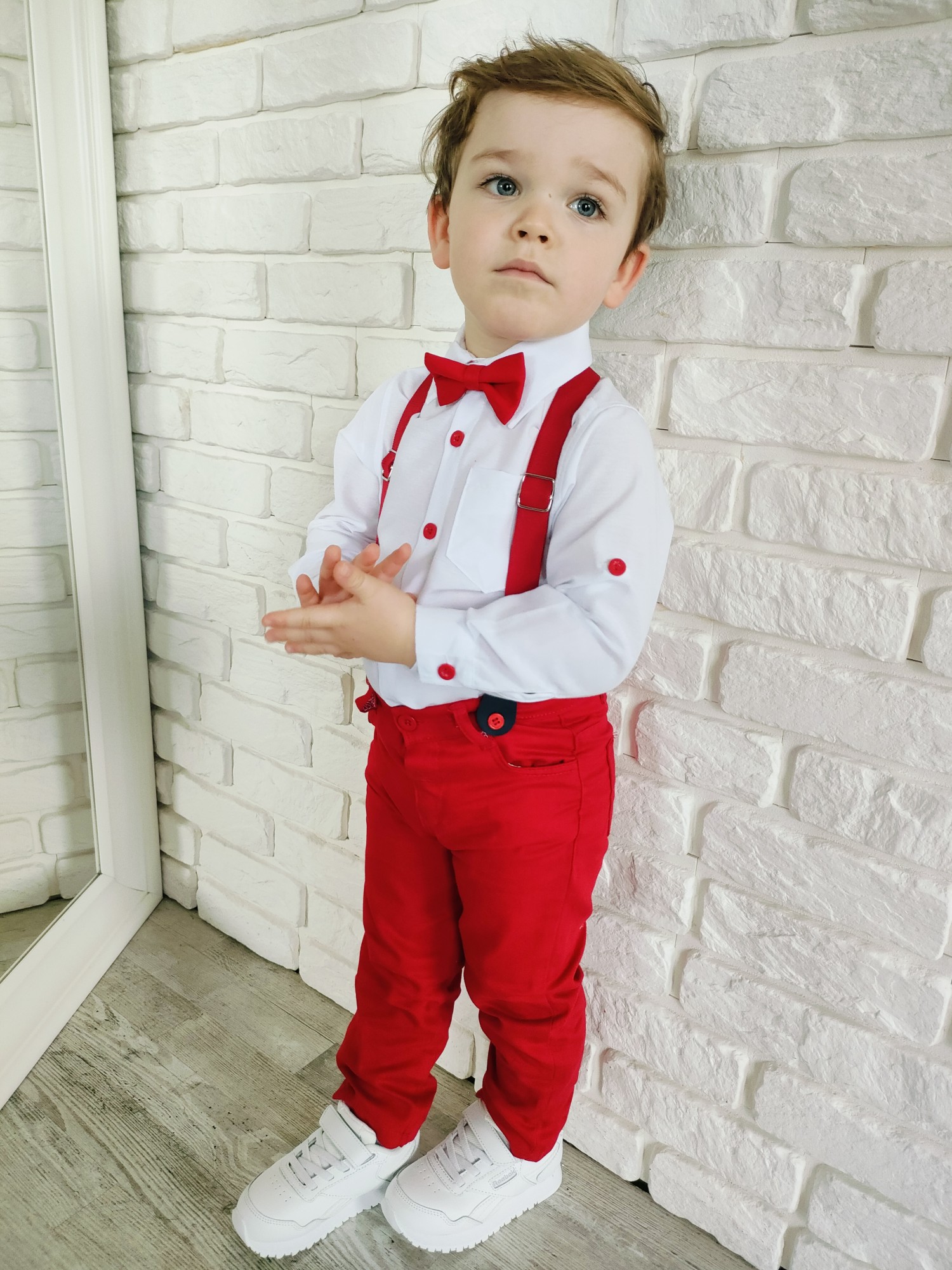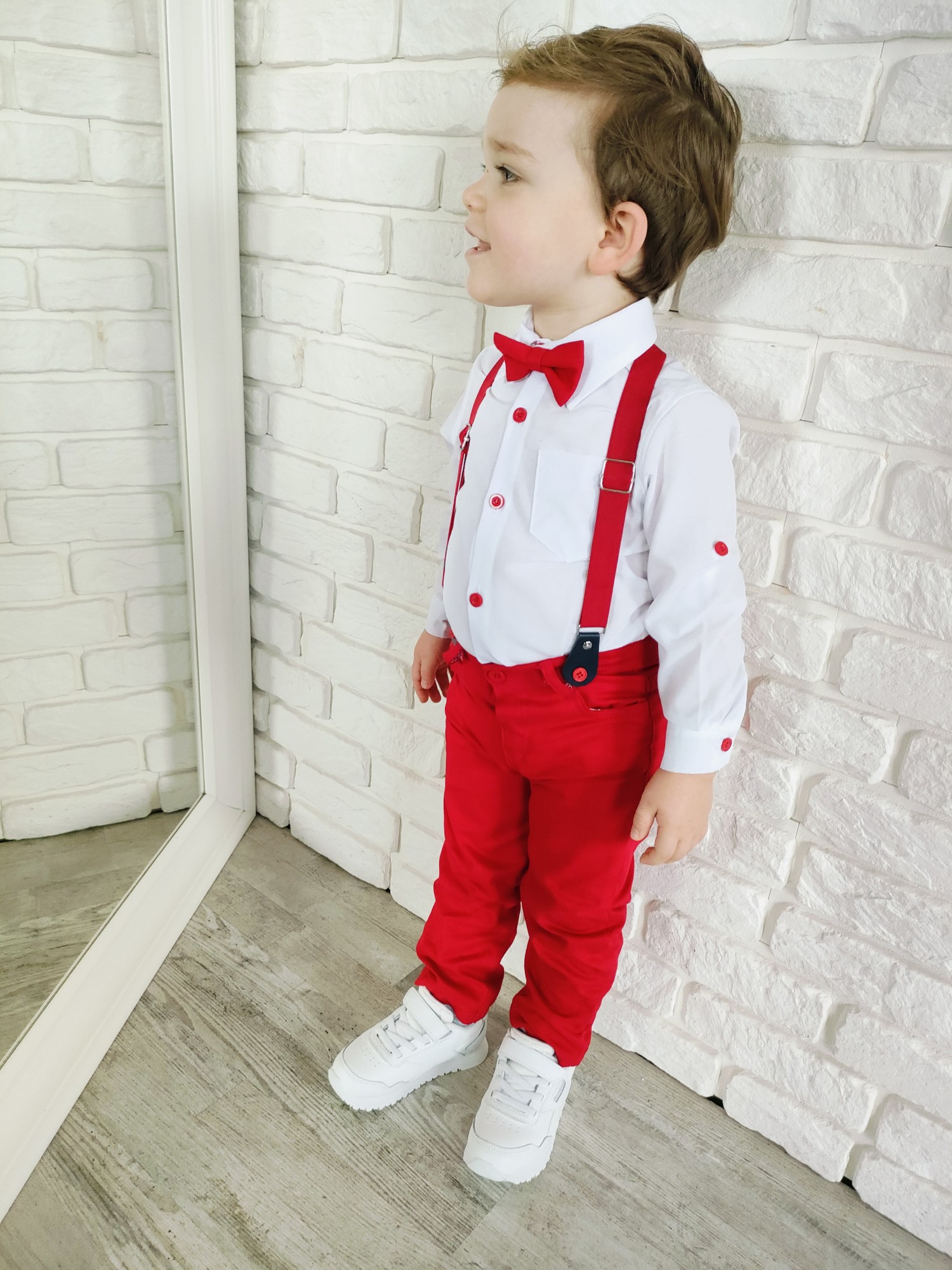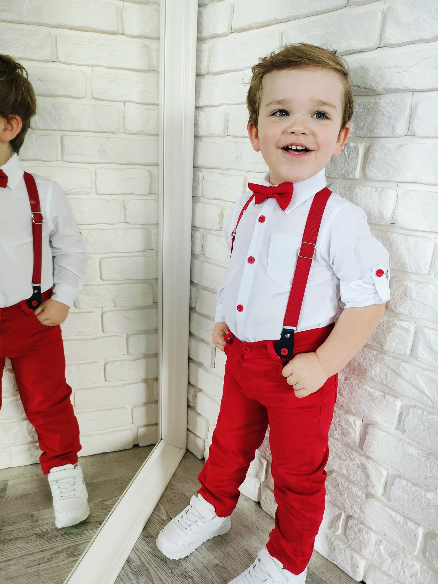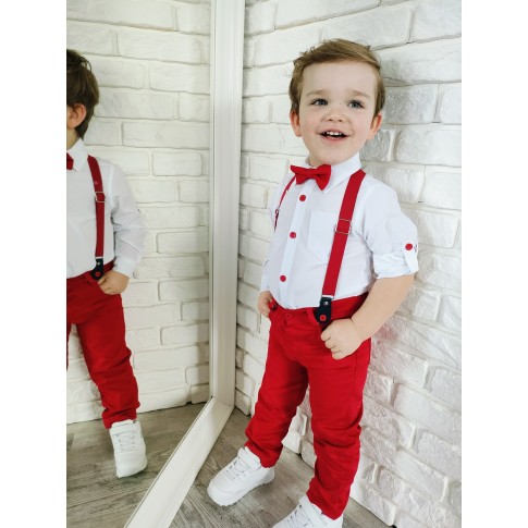 Komplet elegancki z szelkami i muszką biała koszula i czerwone spodnie