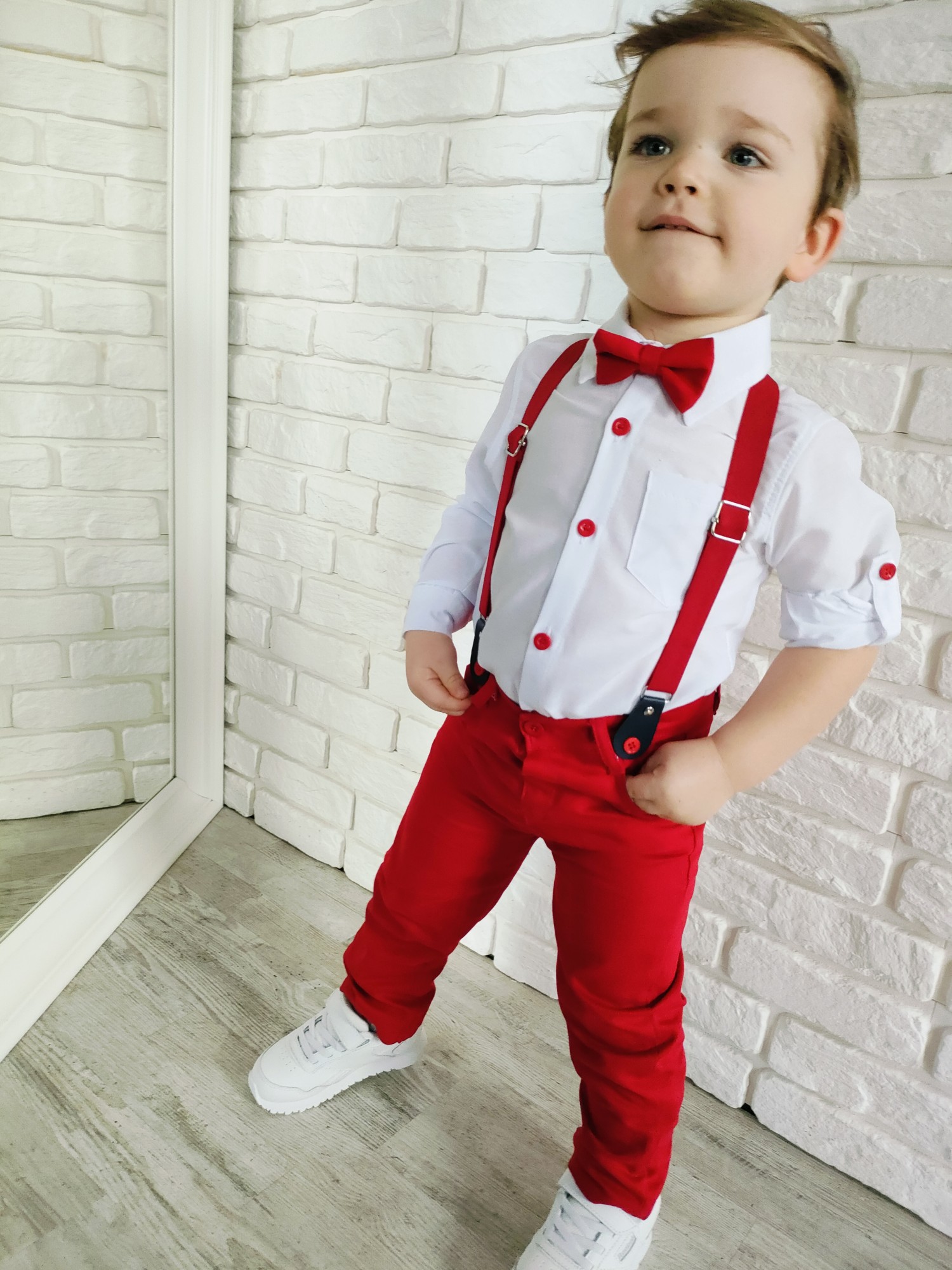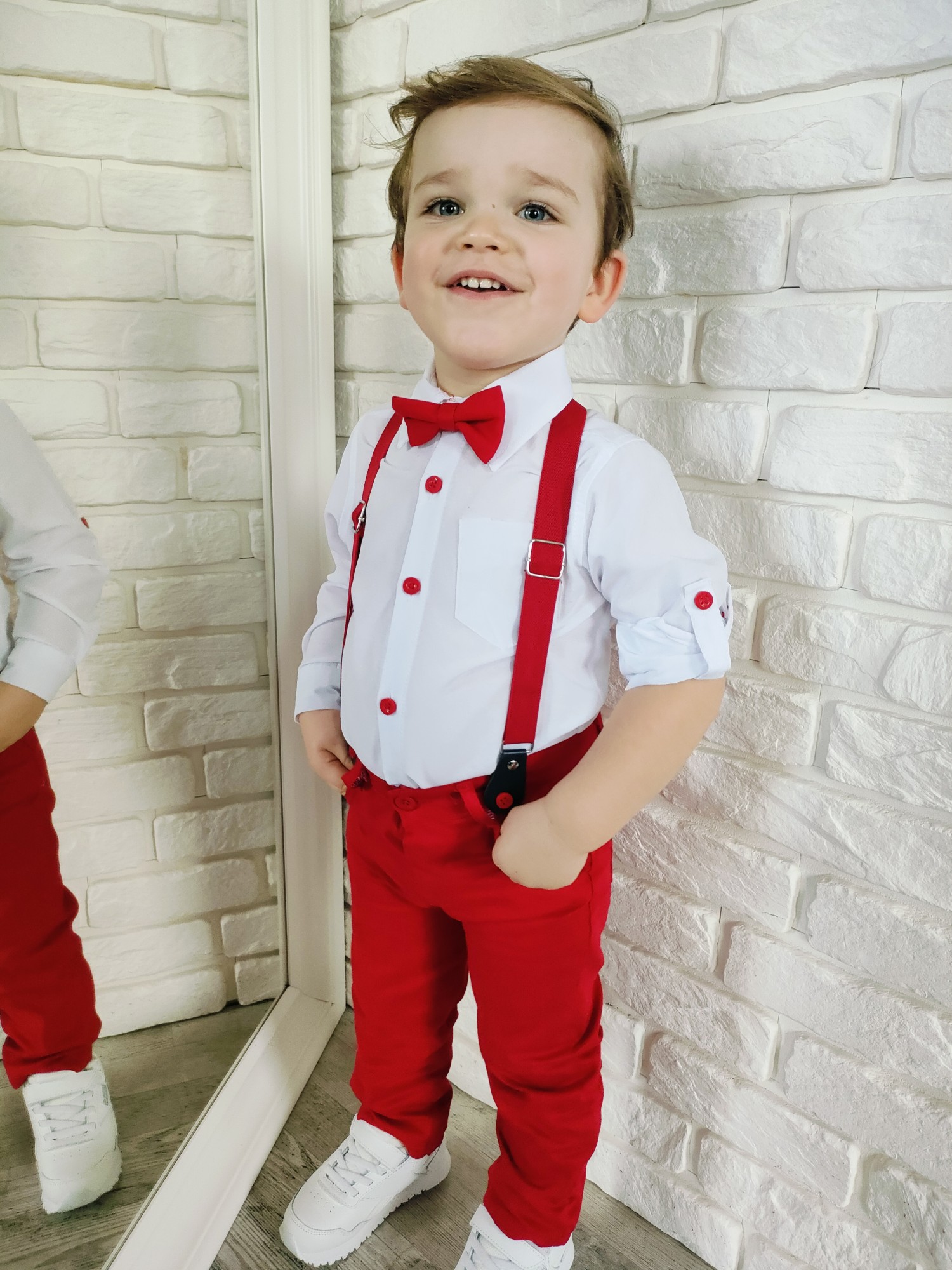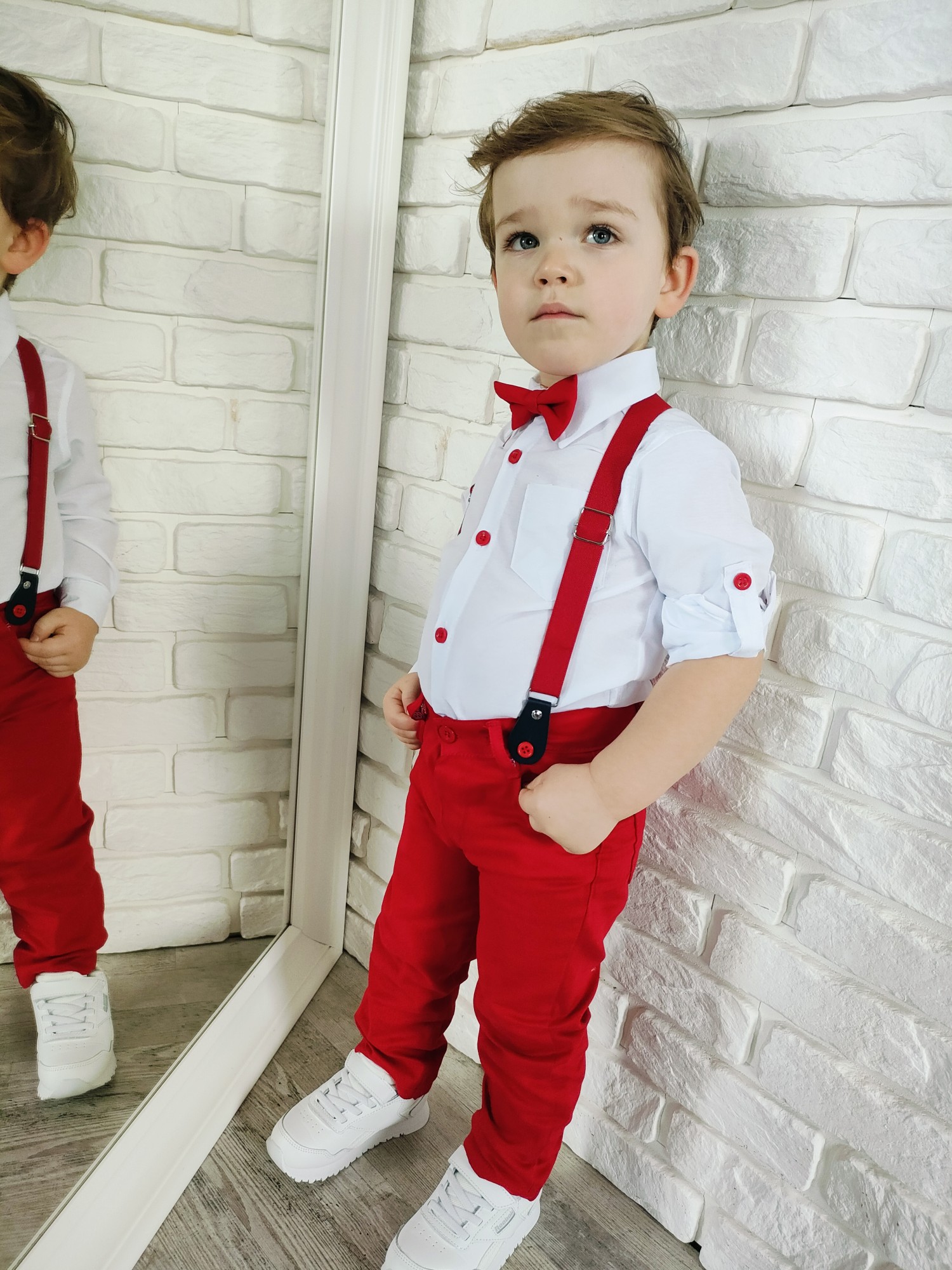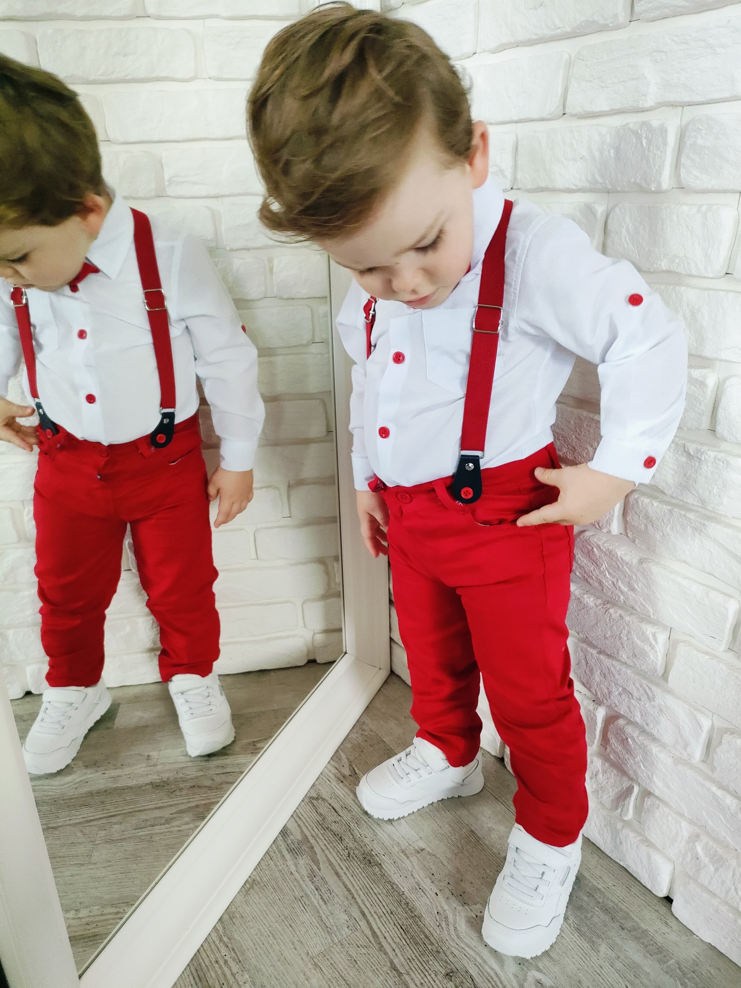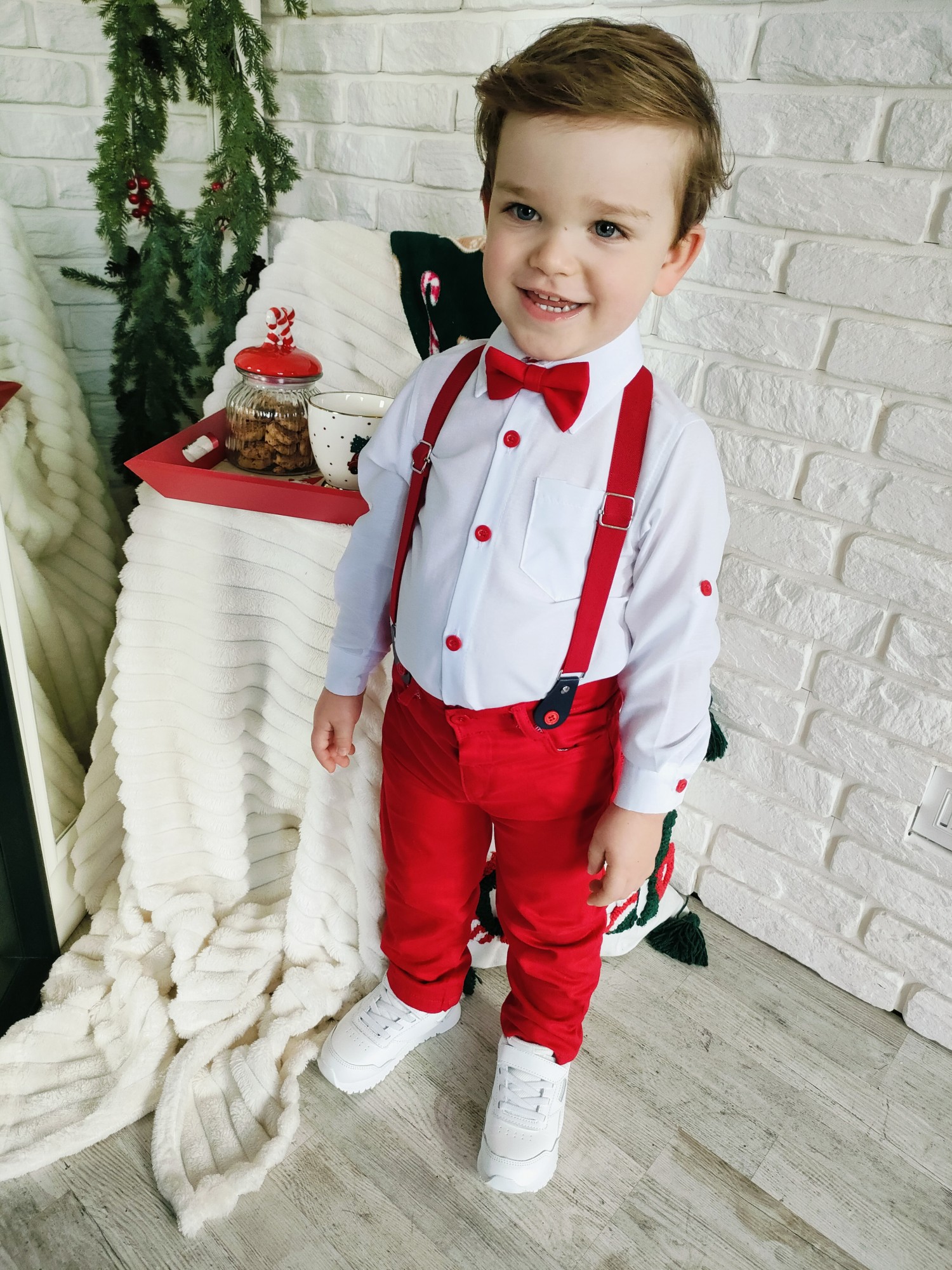 Komplet elegancki z szelkami i muszką biała koszula i czerwone spodnie