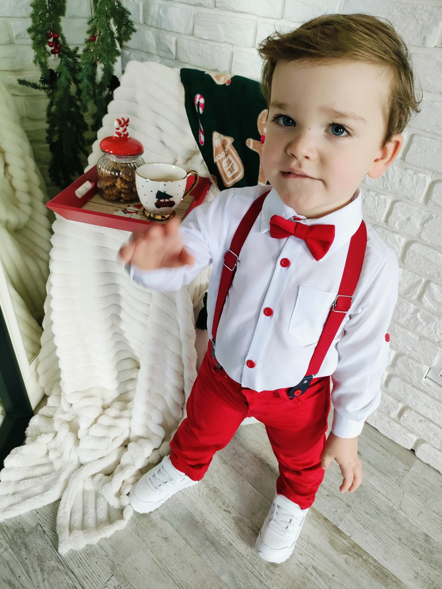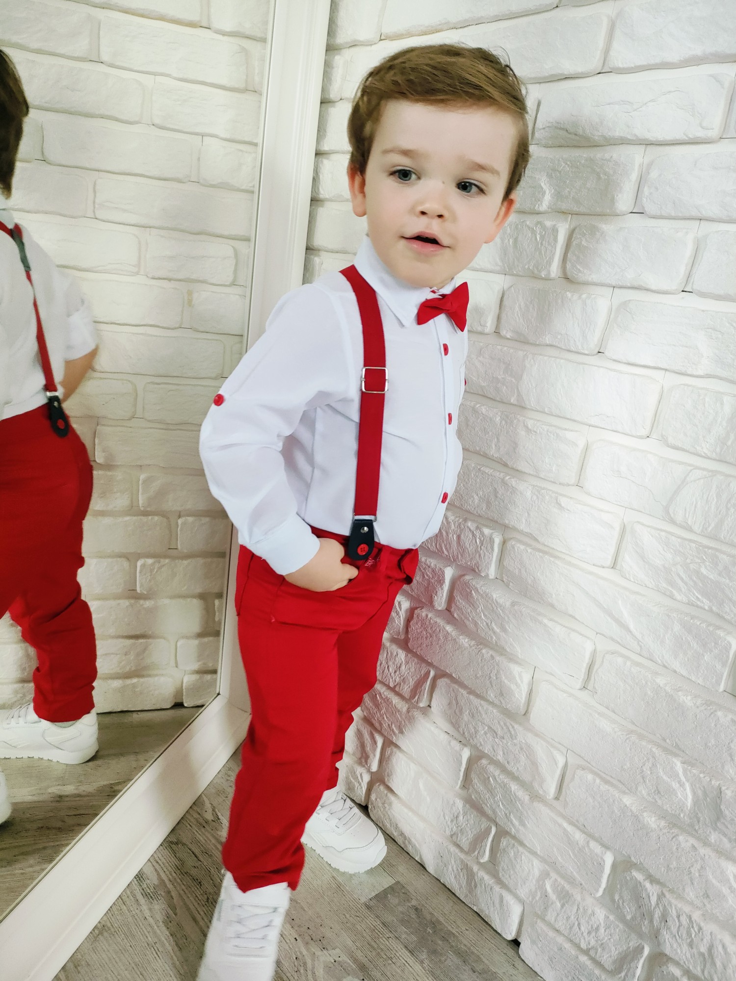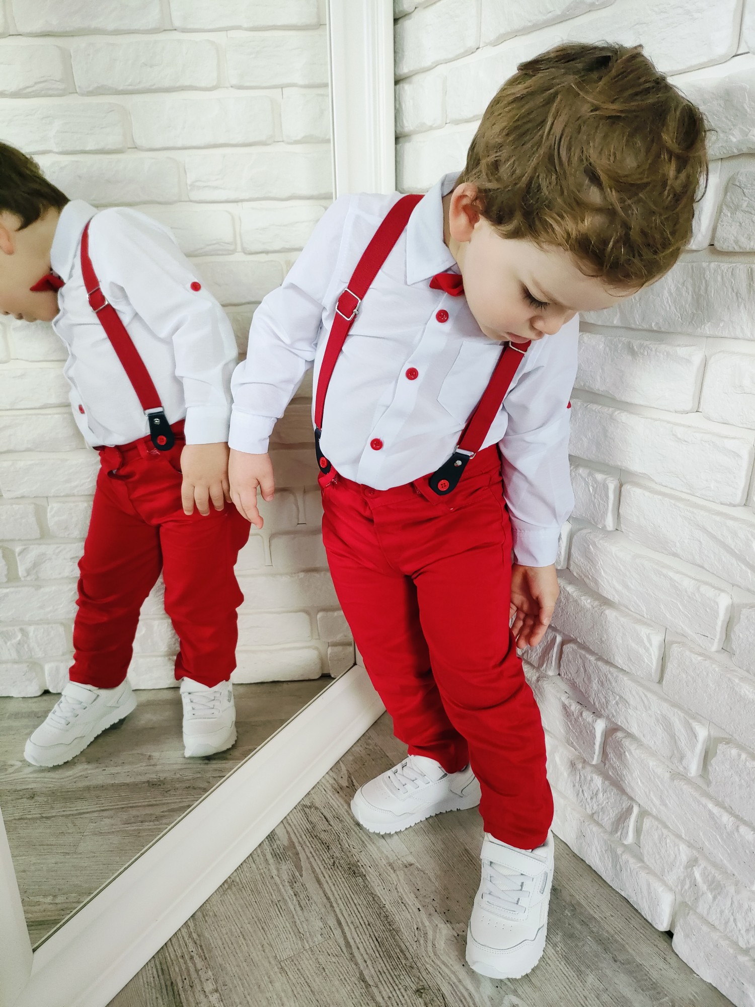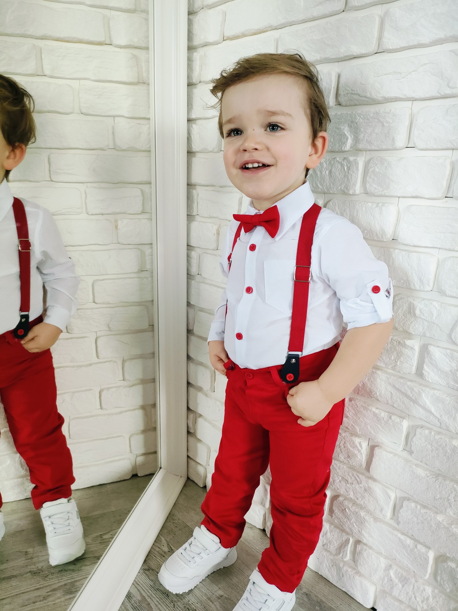 Komplet elegancki z szelkami i muszką biała koszula i czerwone spodnie