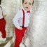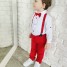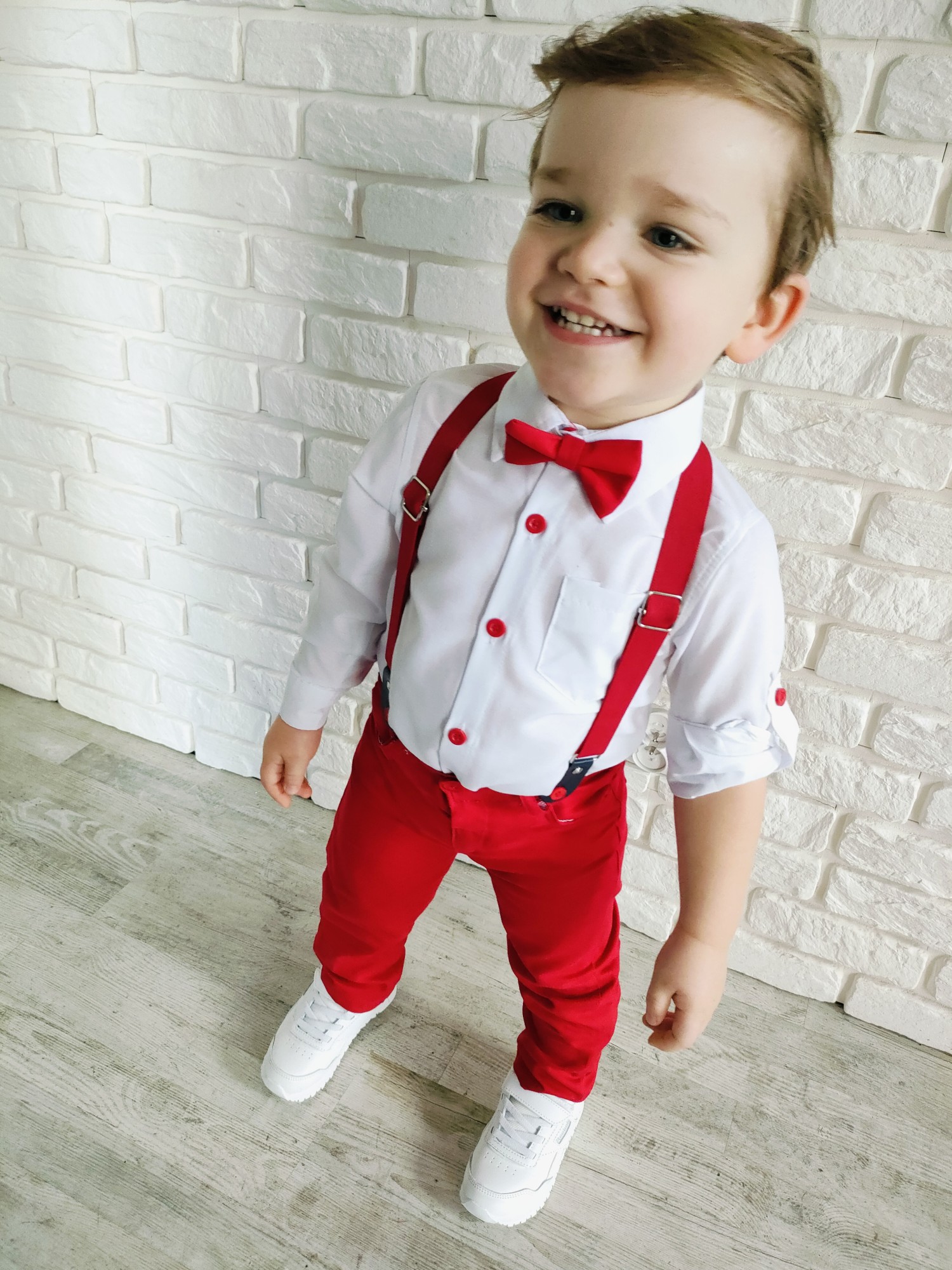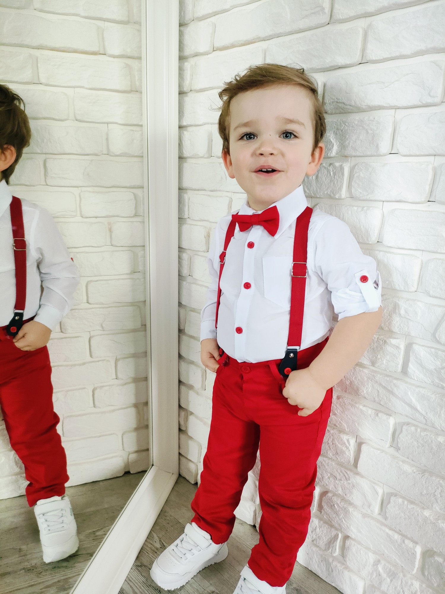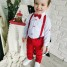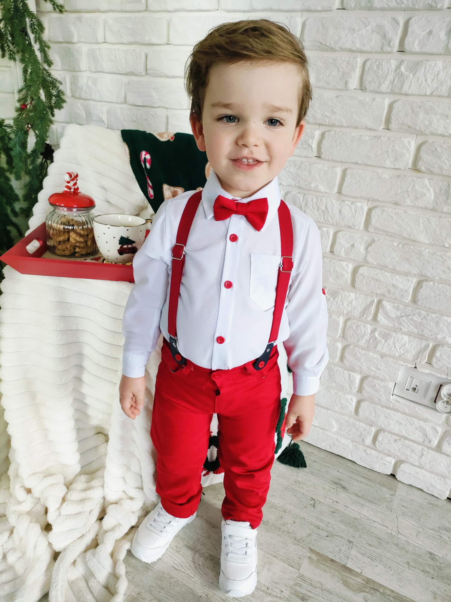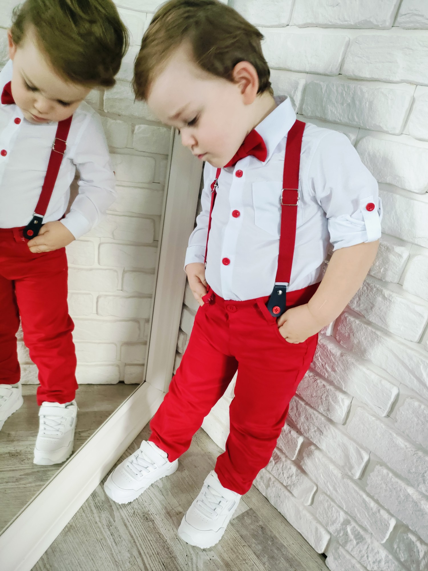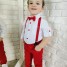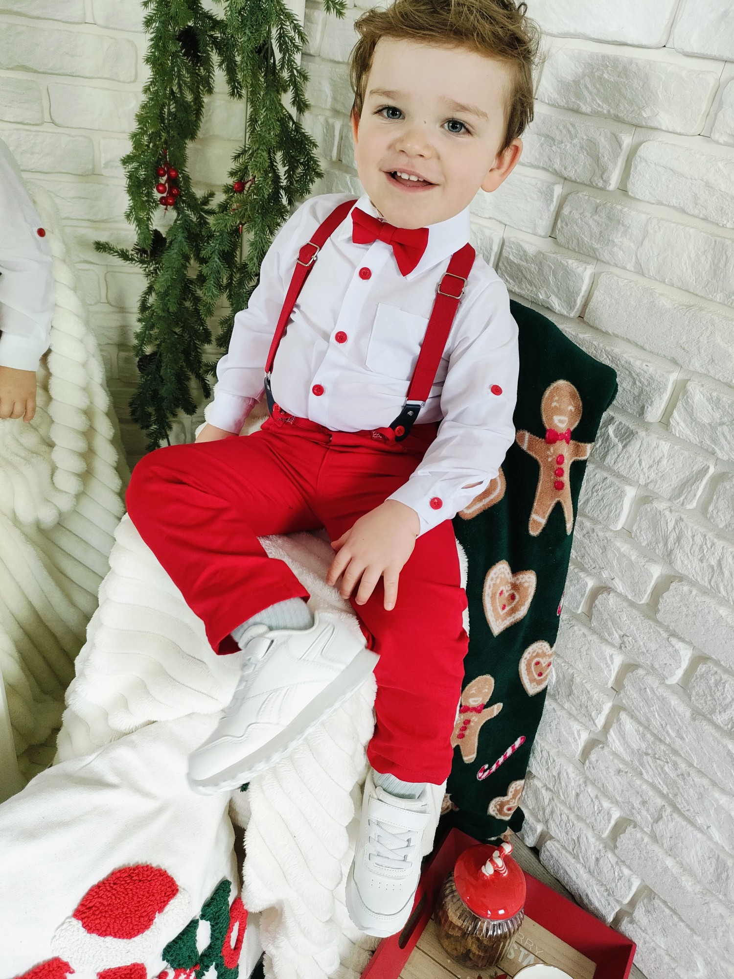 Komplet elegancki z szelkami i muszką biała koszula i czerwone spodnie