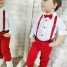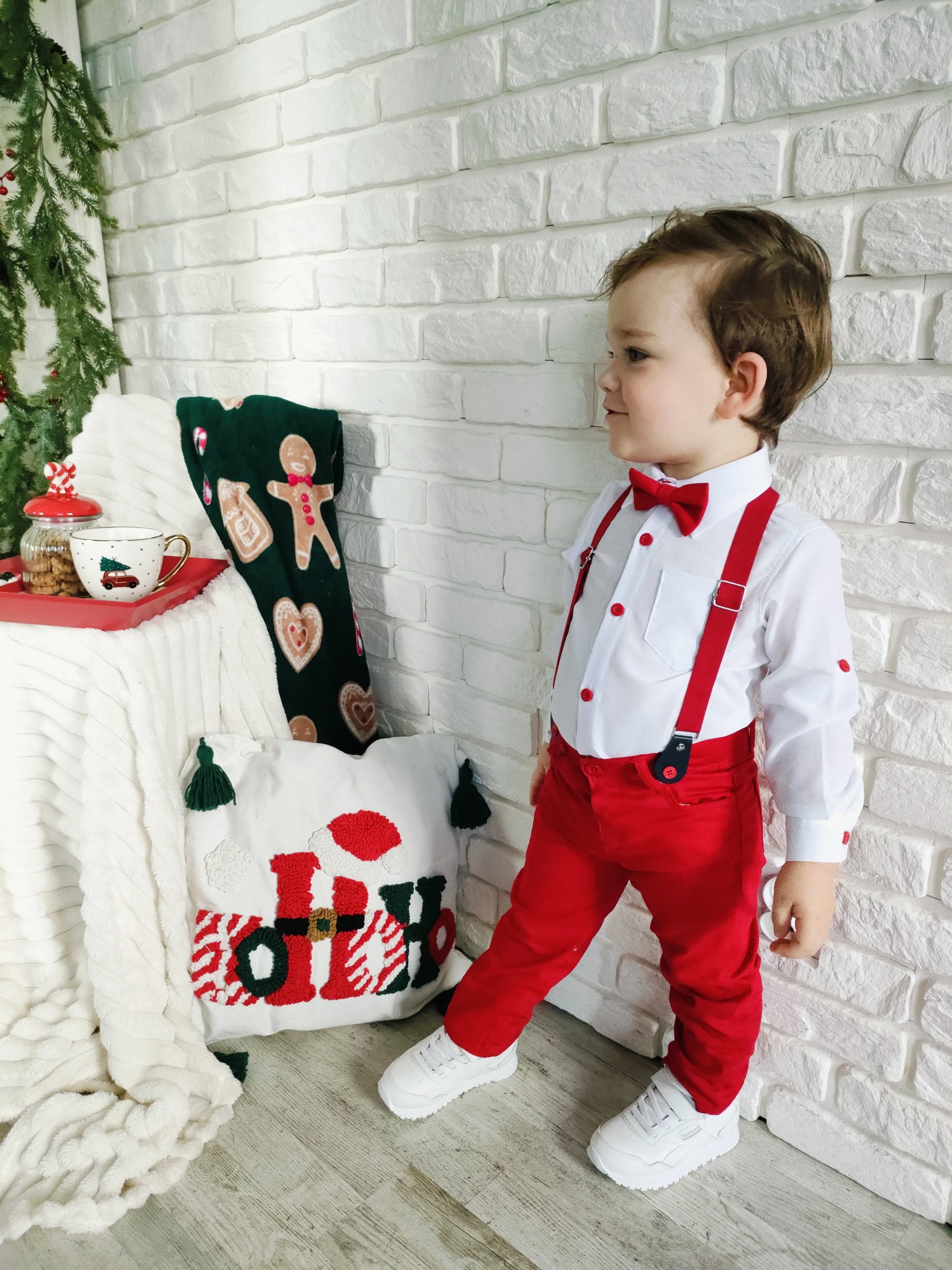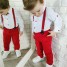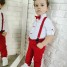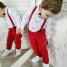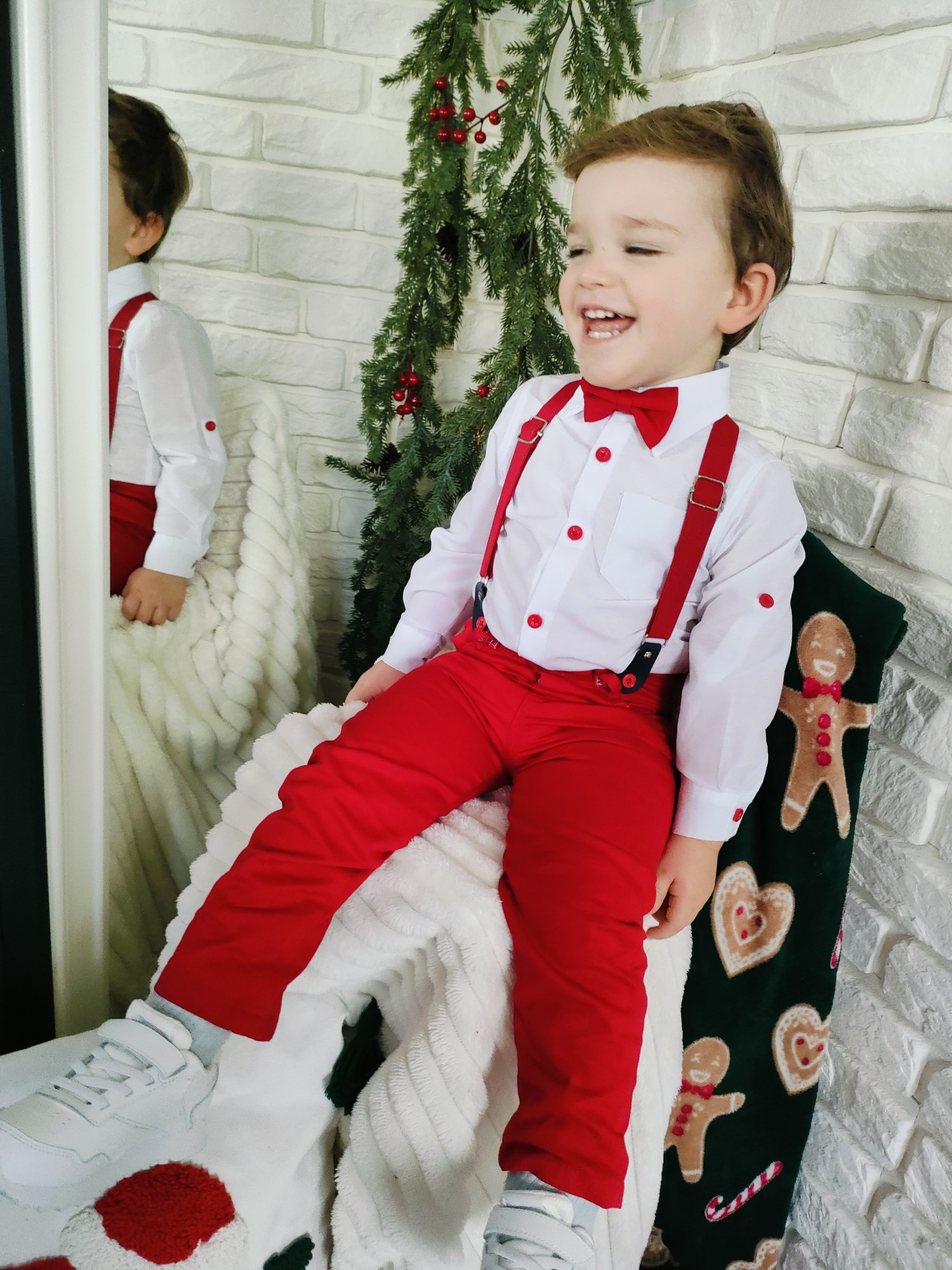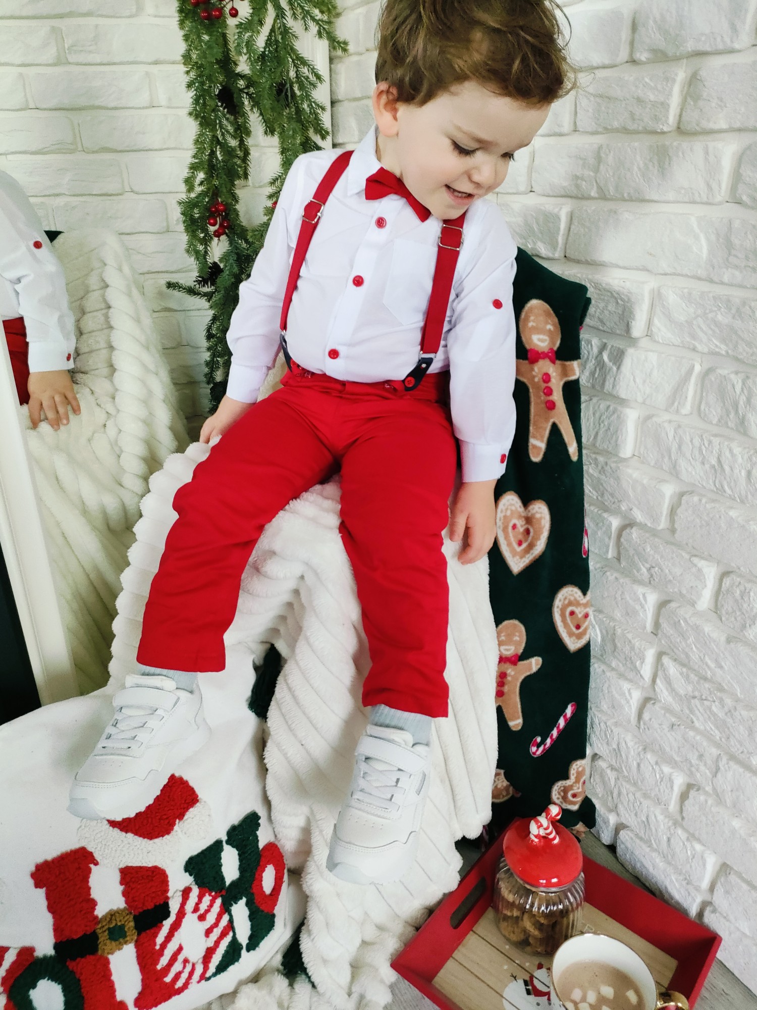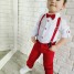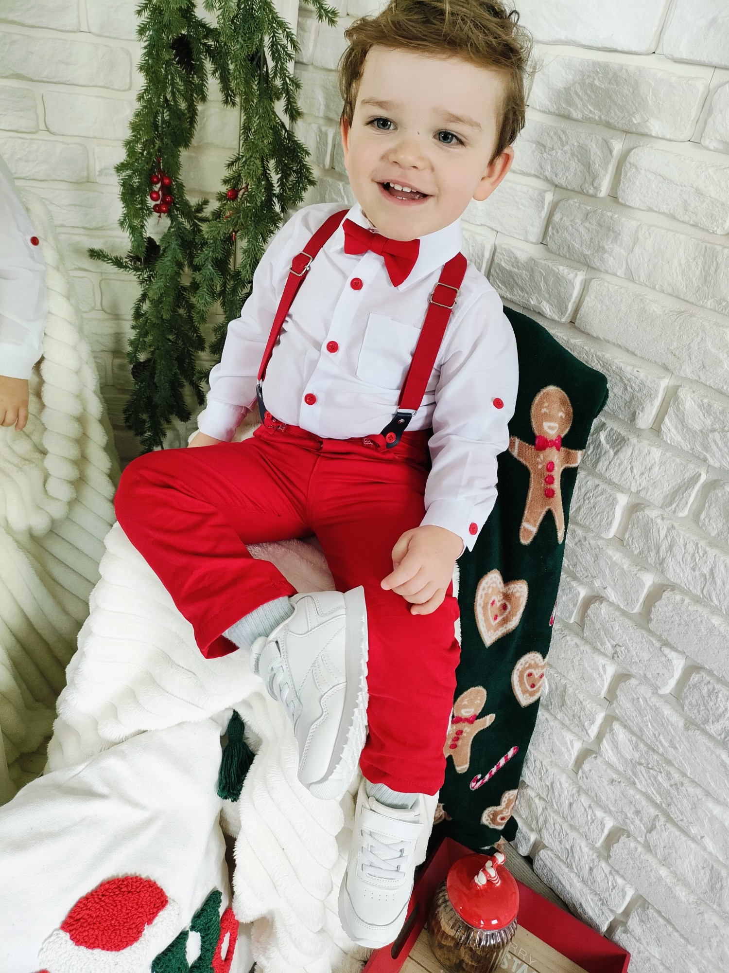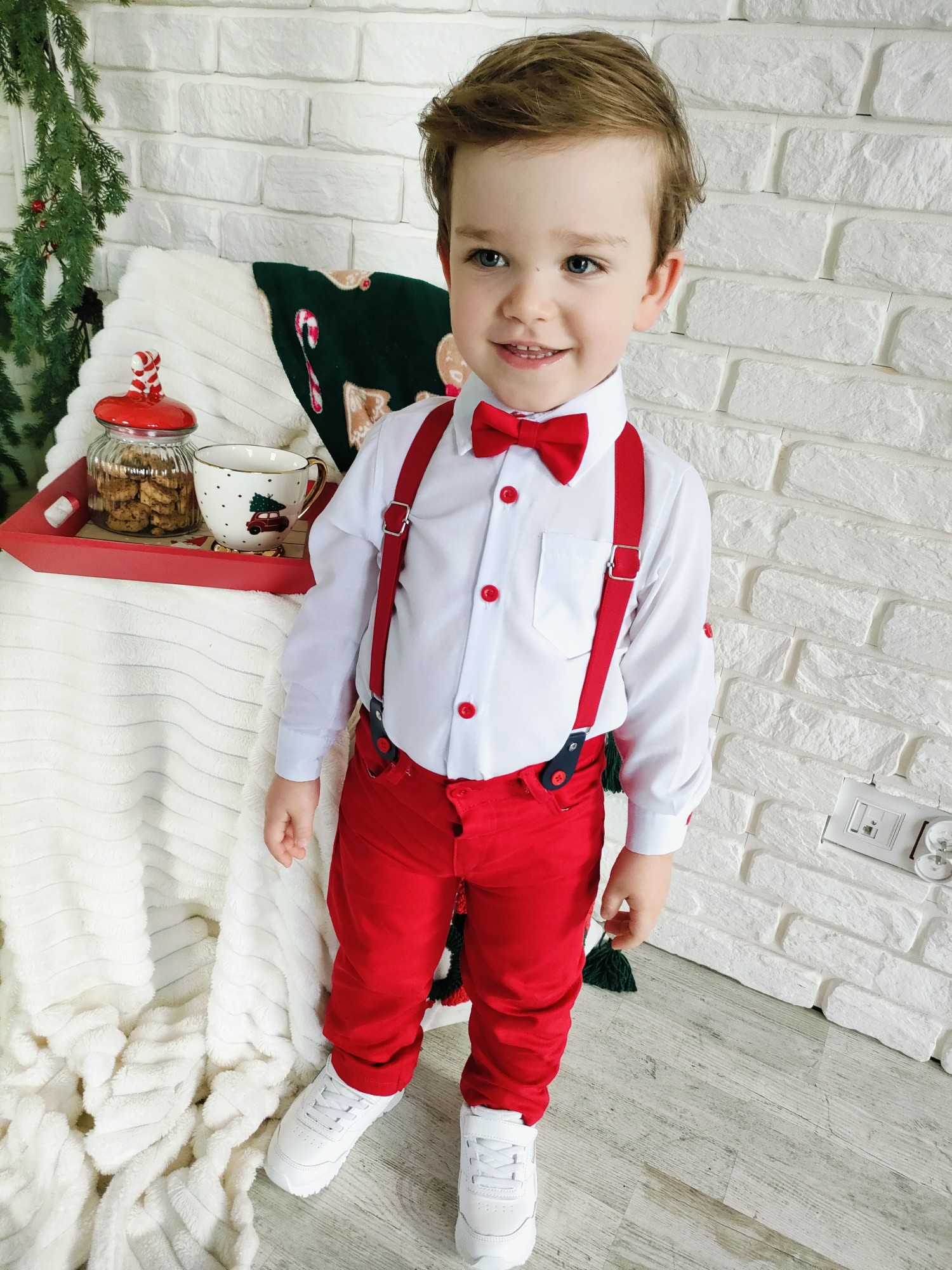Komplet elegancki z szelkami i muszką biała koszula i czerwone spodnie
