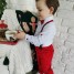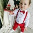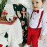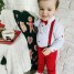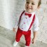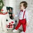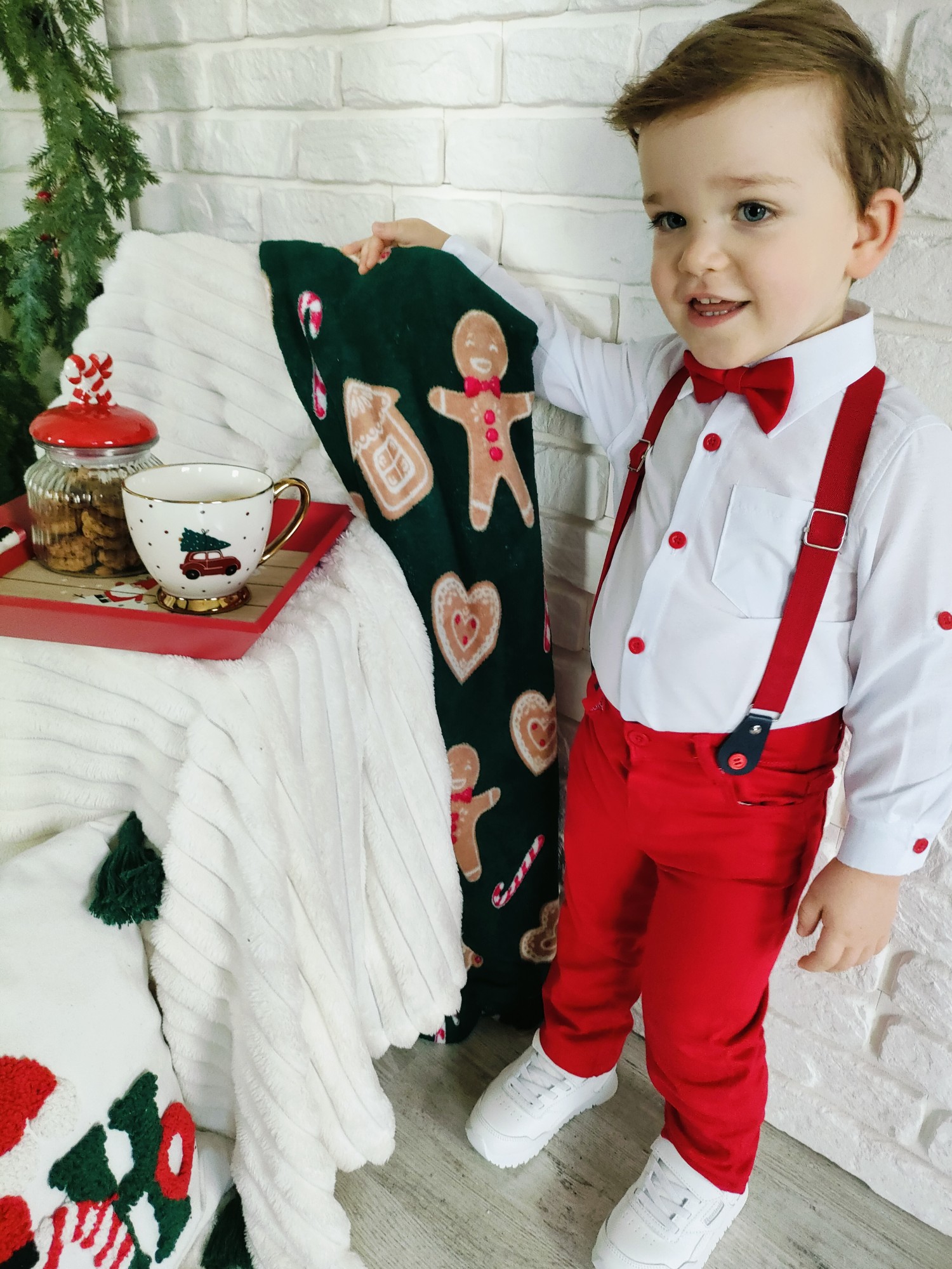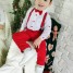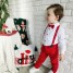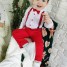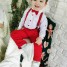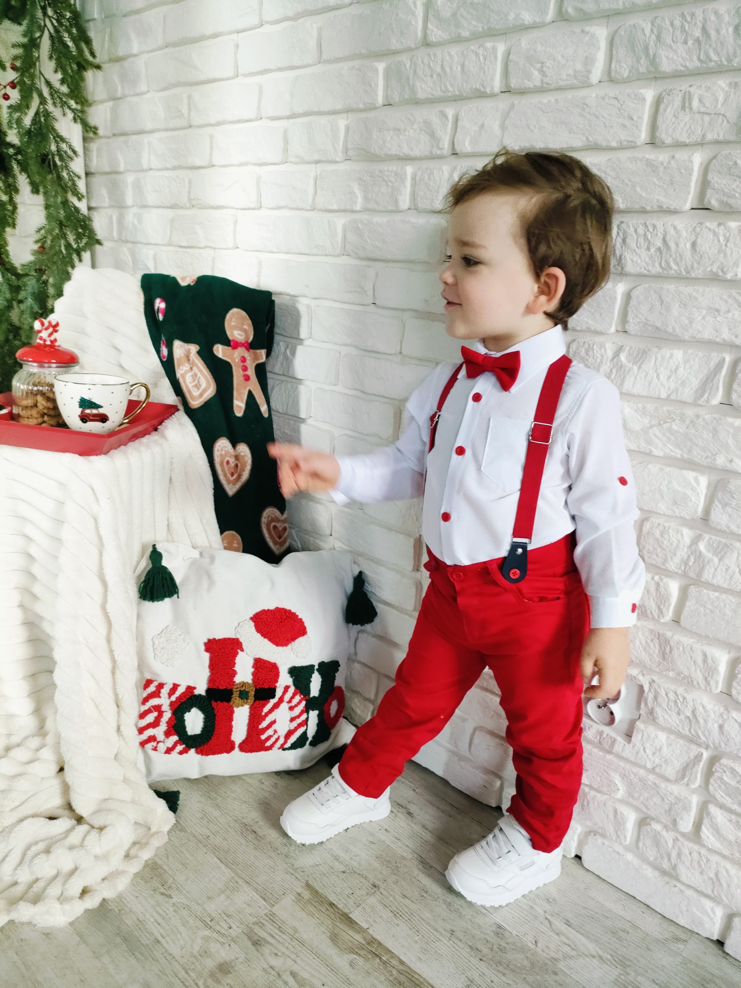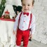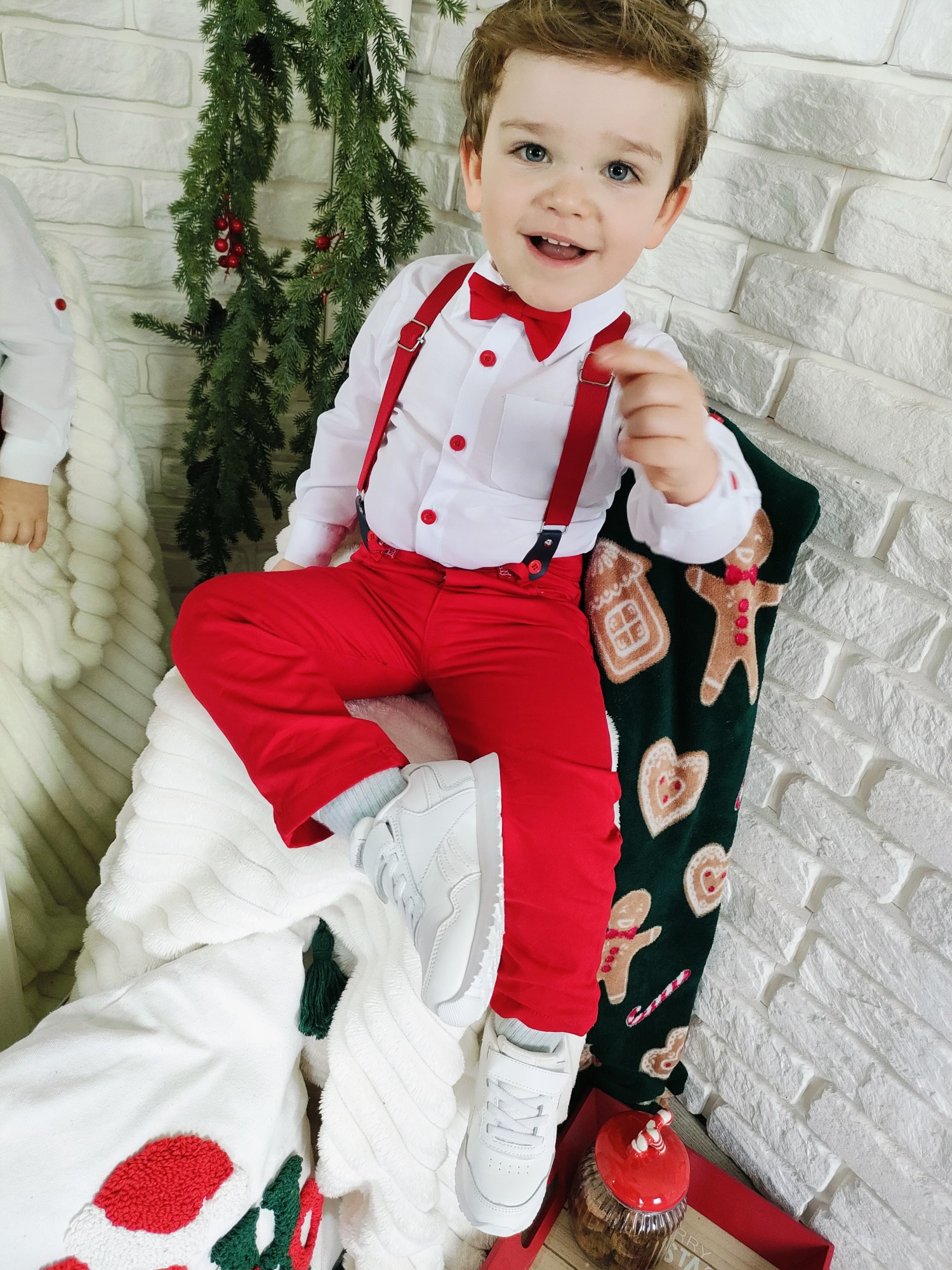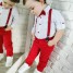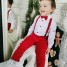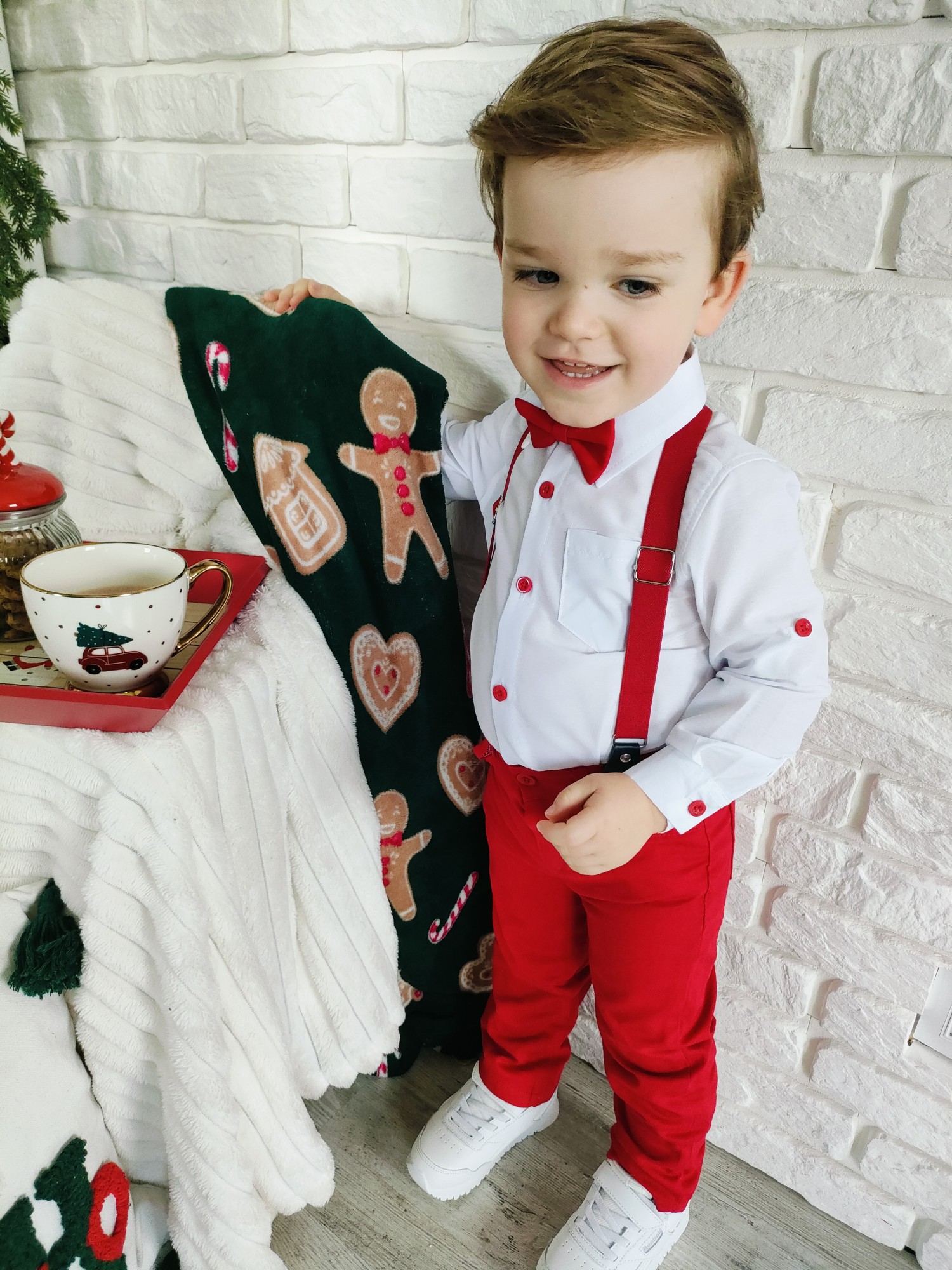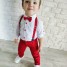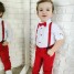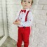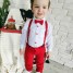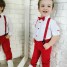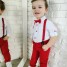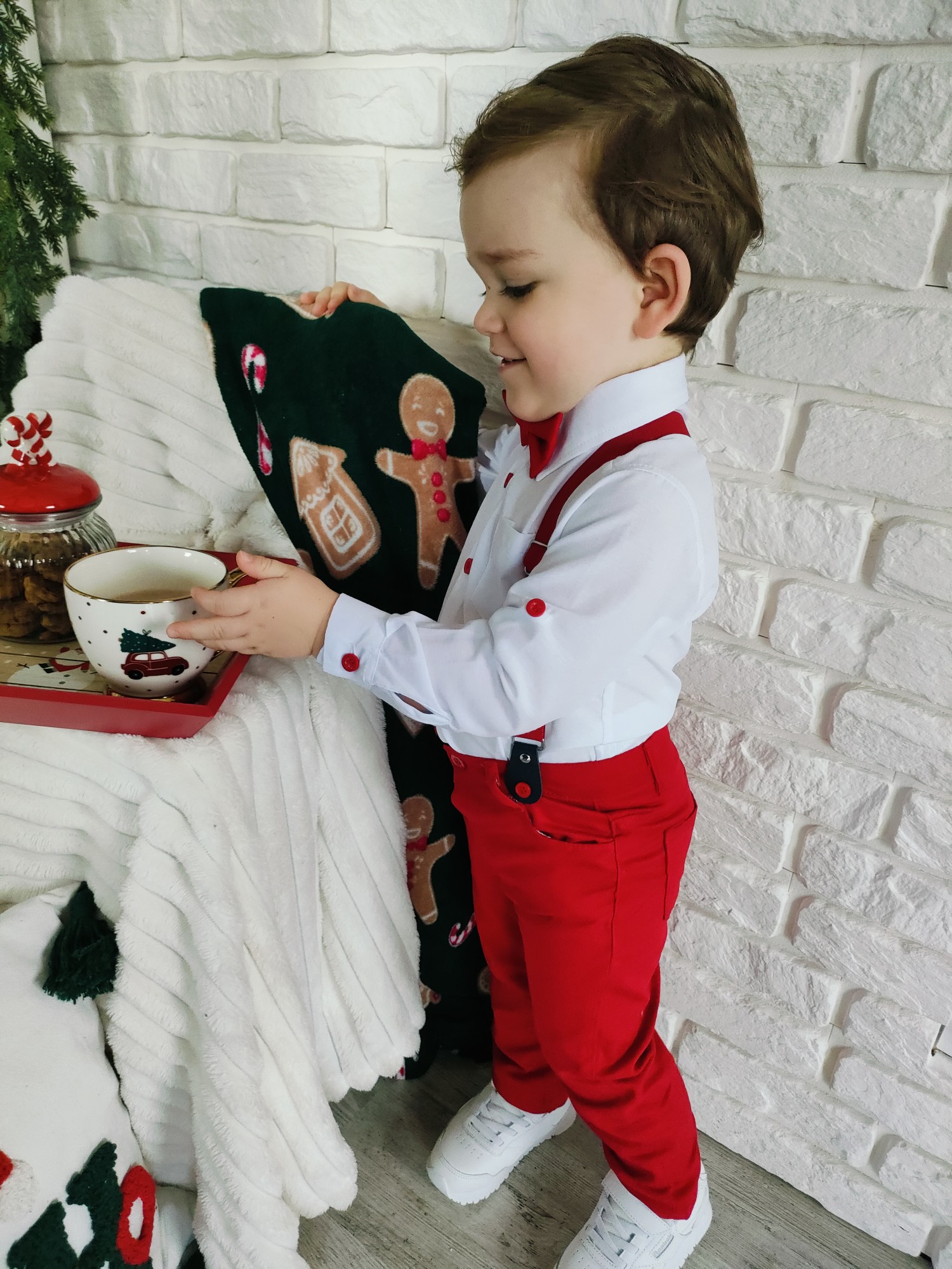 Komplet elegancki z szelkami i muszką biała koszula i czerwone spodnie
