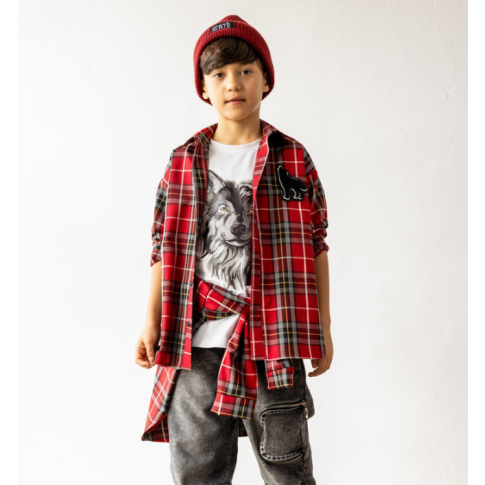 Koszula flanelowa w kratę czerwona z naszywką MashMnie "With Wolves" Drop 3 to absolutny must-have tej kolekcji – klasyczna krata w intensywnej czerwieni z czarnym, białym i beżem robi młodzieżowy luz z charakterem, haftowana naszywka wilka na piersi nawiązuje do symboliki całej linii, a miękka flanela daje ciepło i komfort przez cały dzień. Luźny krój pozwala nosić ją na wiele sposobów: rozpiętą jako warstwę na białą koszulkę z grafiką wilka (jak na zdjęciu), zapiętą solo, przewiązaną w pasie. To element limitowanej kolekcji "With Wolves" Drop 3, który łączy klasykę flanelowej koszuli z młodzieżową świeżością.