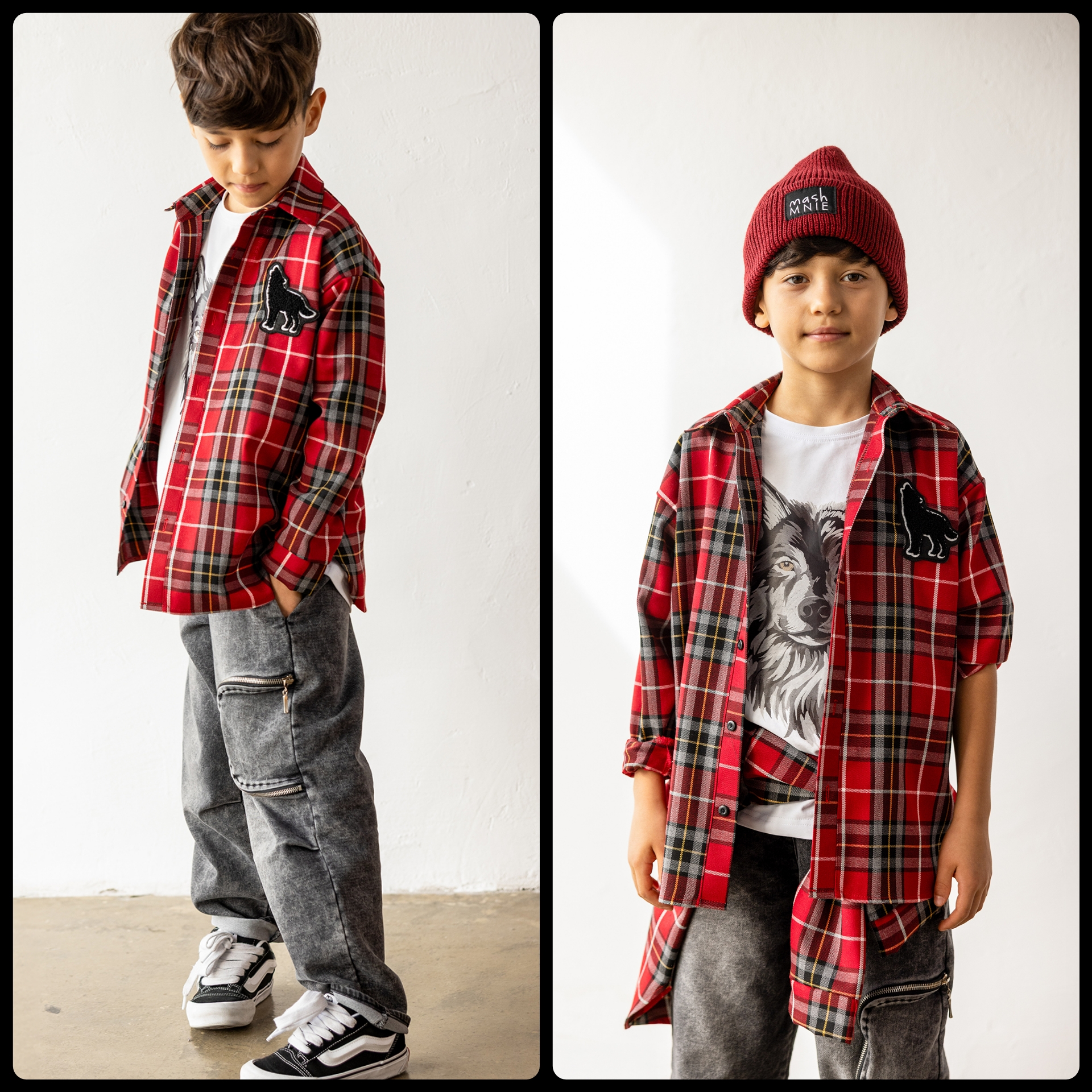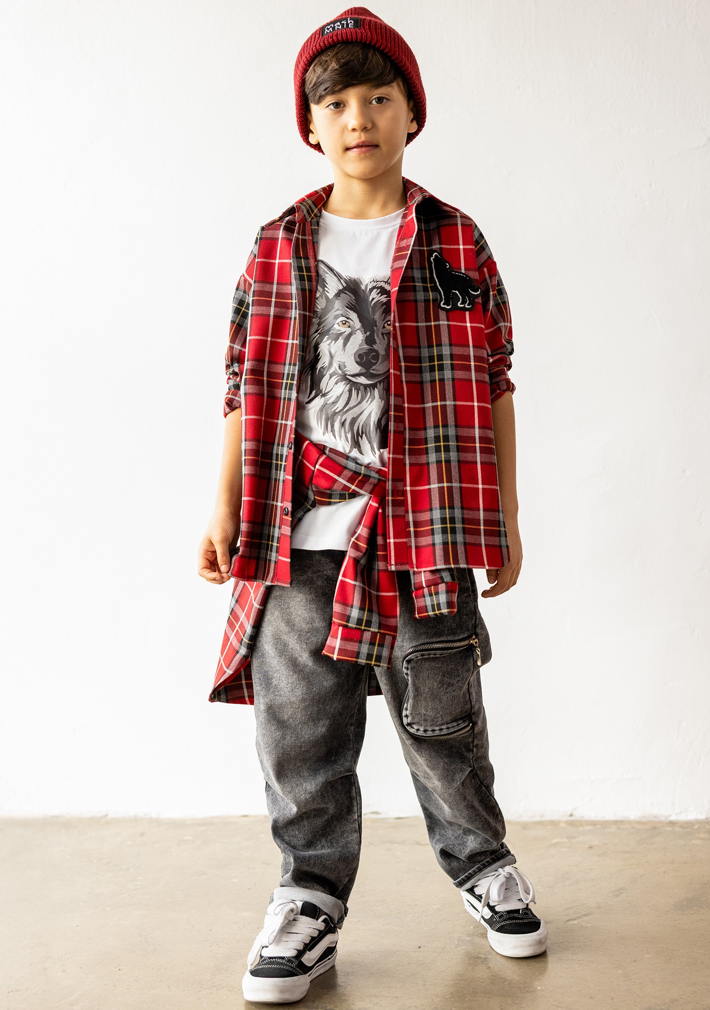 Koszula flanelowa w kratę czerwona z naszywką MashMnie "With Wolves" Drop 3 to absolutny must-have tej kolekcji – klasyczna krata w intensywnej czerwieni z czarnym, białym i beżem robi młodzieżowy luz z charakterem, haftowana naszywka wilka na piersi nawiązuje do symboliki całej linii, a miękka flanela daje ciepło i komfort przez cały dzień. Luźny krój pozwala nosić ją na wiele sposobów: rozpiętą jako warstwę na białą koszulkę z grafiką wilka (jak na zdjęciu), zapiętą solo, przewiązaną w pasie. To element limitowanej kolekcji "With Wolves" Drop 3, który łączy klasykę flanelowej koszuli z młodzieżową świeżością.