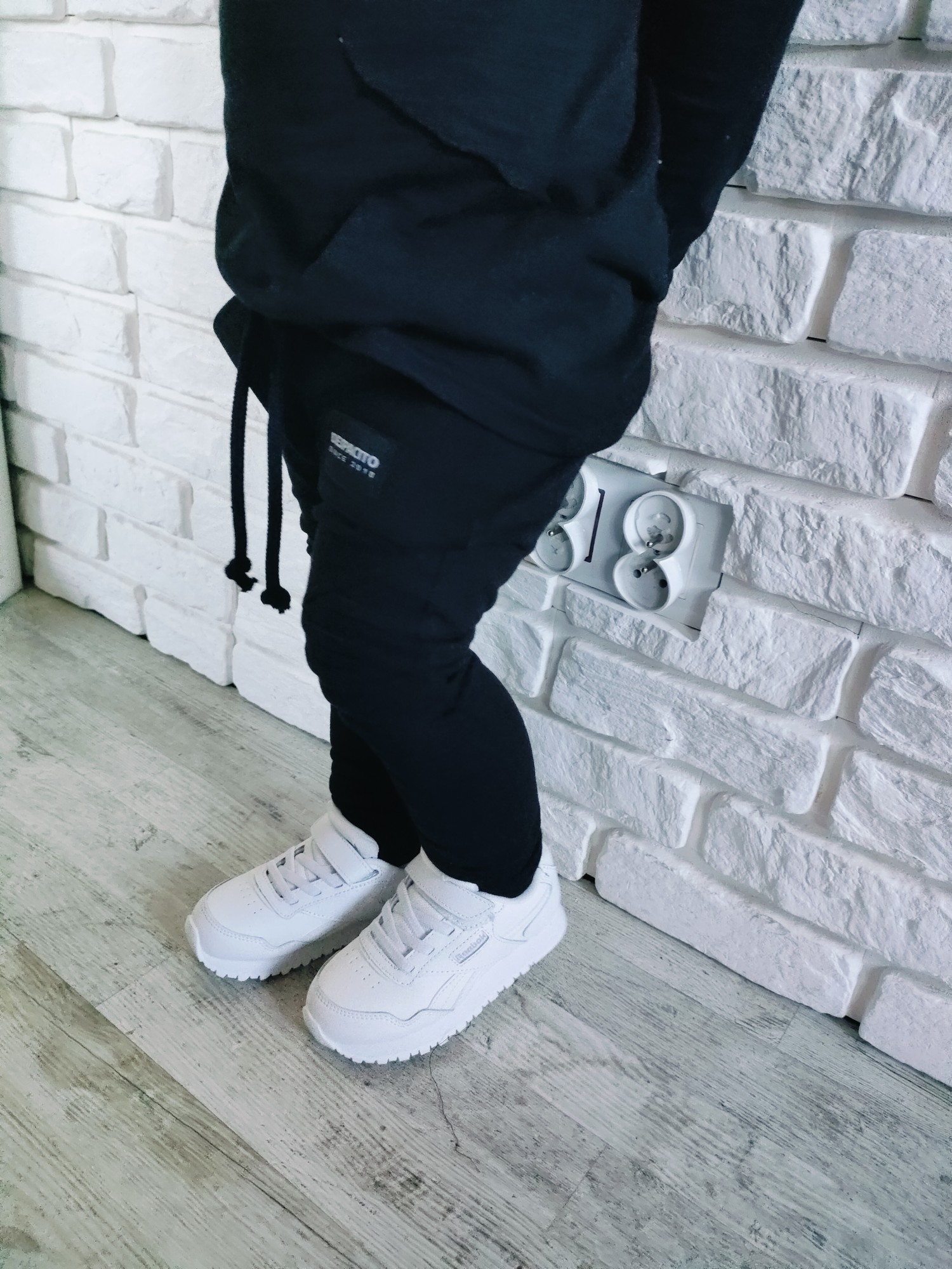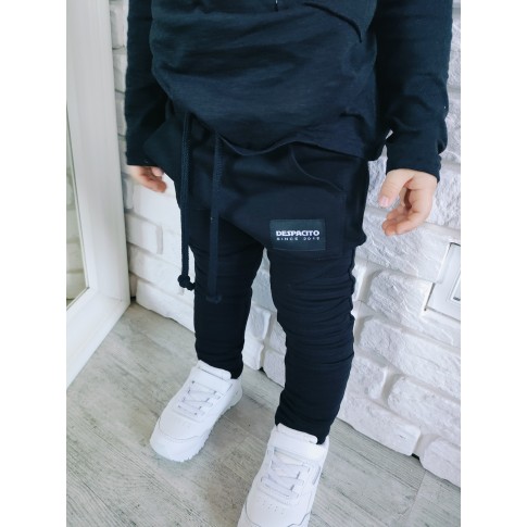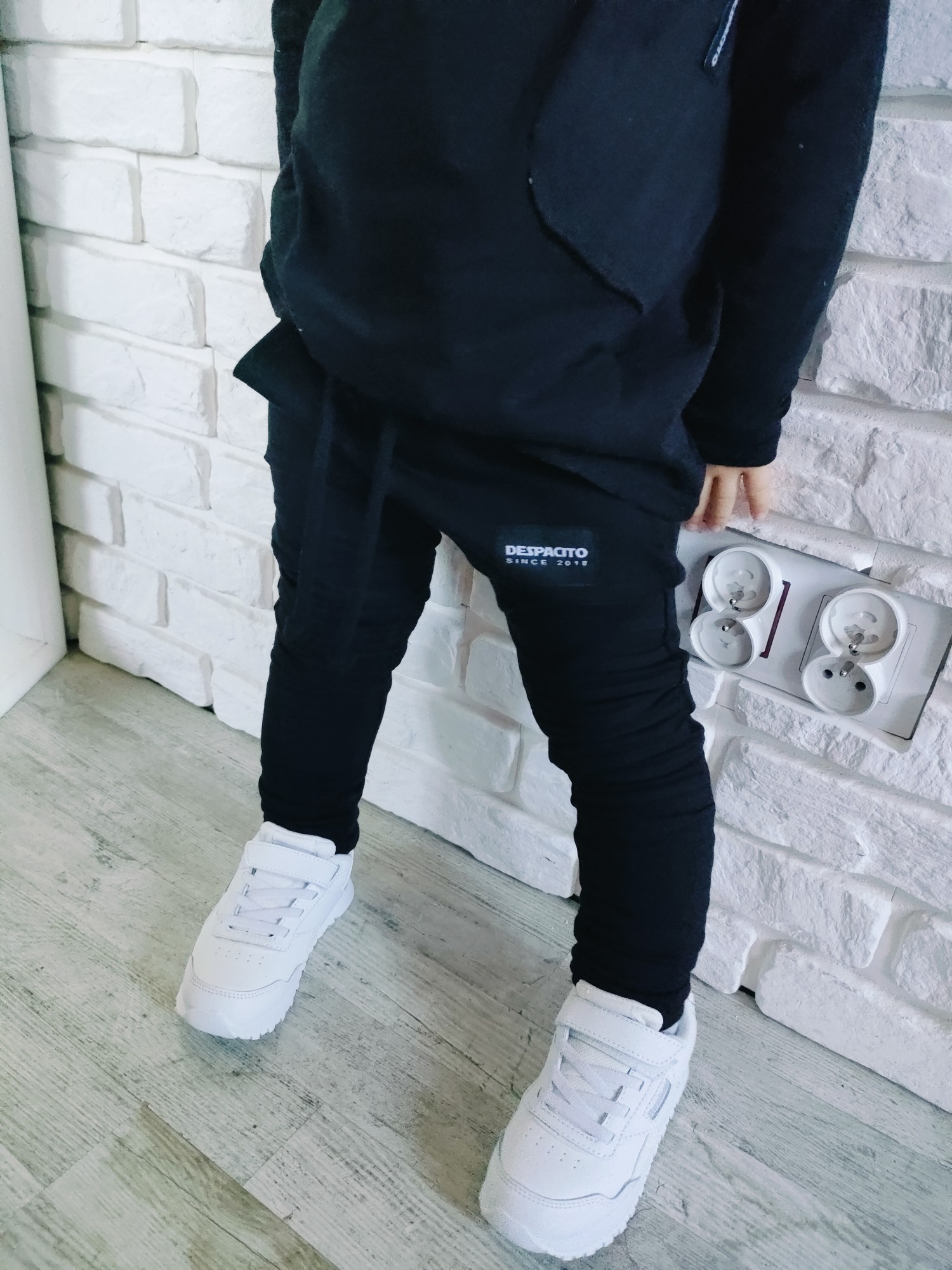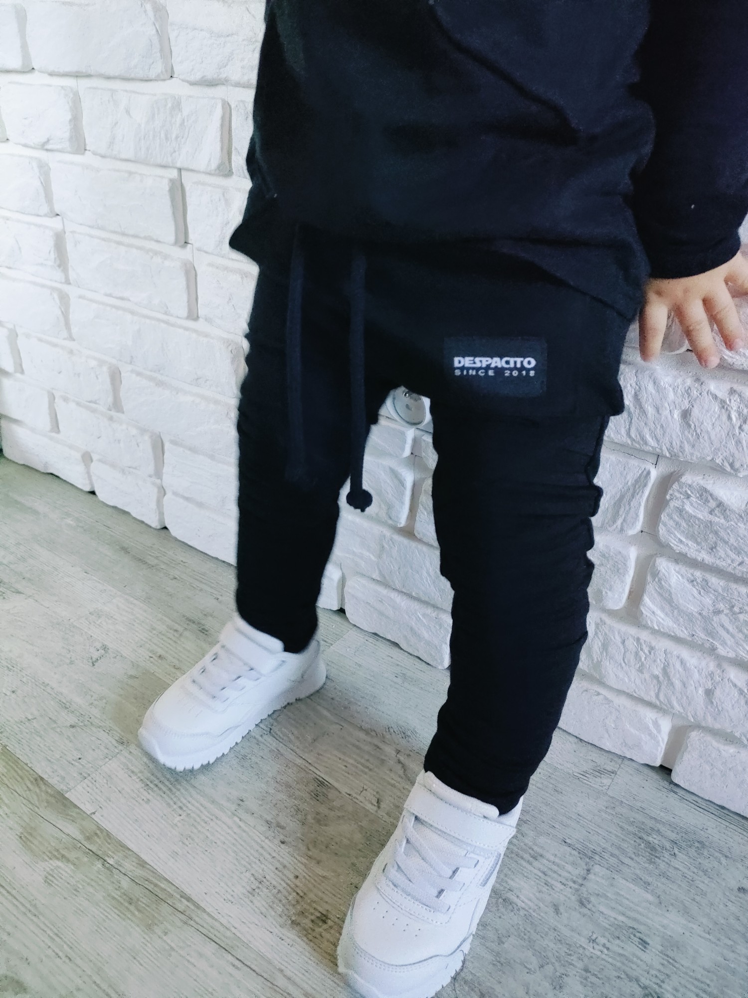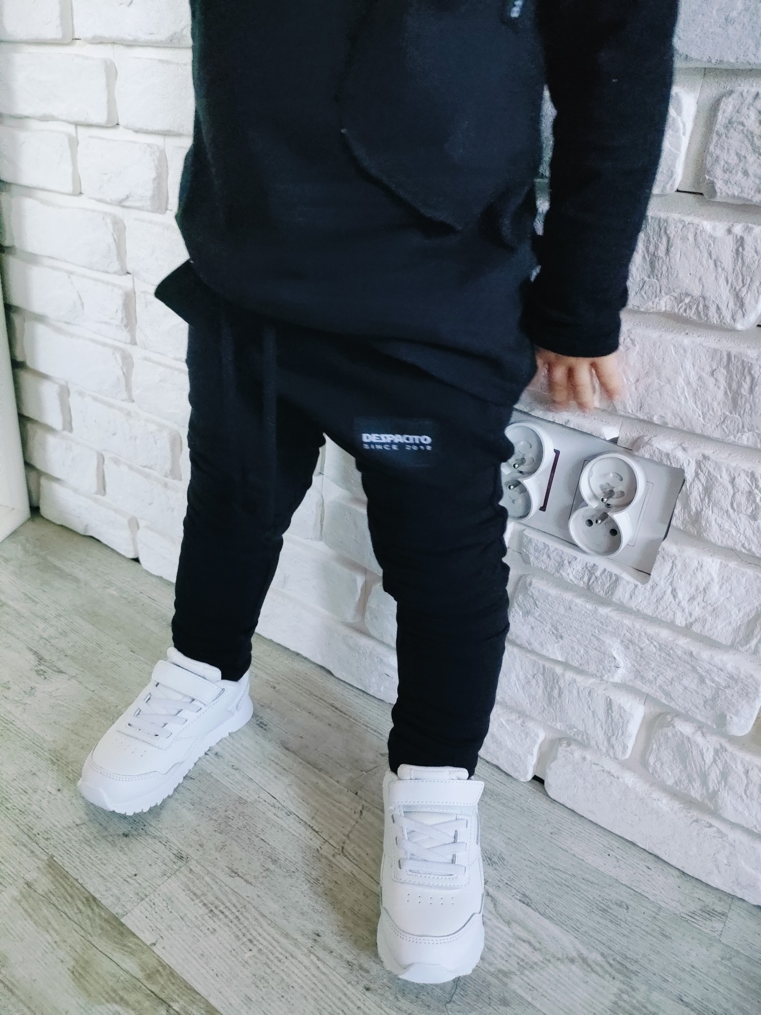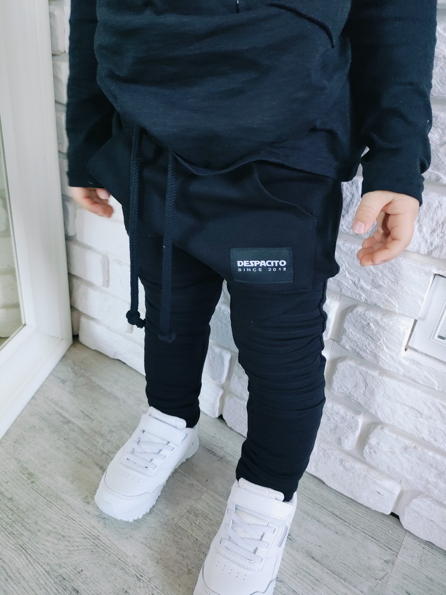 Czarne spodnie dla chłopca Despacito z przeszyciami to miejski minimal z charakterem. Gładka czerń, dekoracyjne przeszycia i zwężana nogawka robią schludną sylwetkę w klimacie streetwear kids, a pas na gumie ze sznurkiem zamyka temat dopasowania w sekundę. To spodnie do szkoły i na weekend: miękka, przyjemna w dotyku dzianina „pracuje” w ruchu i wraca do formy po praniu, a boczne kieszenie biorą na siebie codzienne drobiazgi.