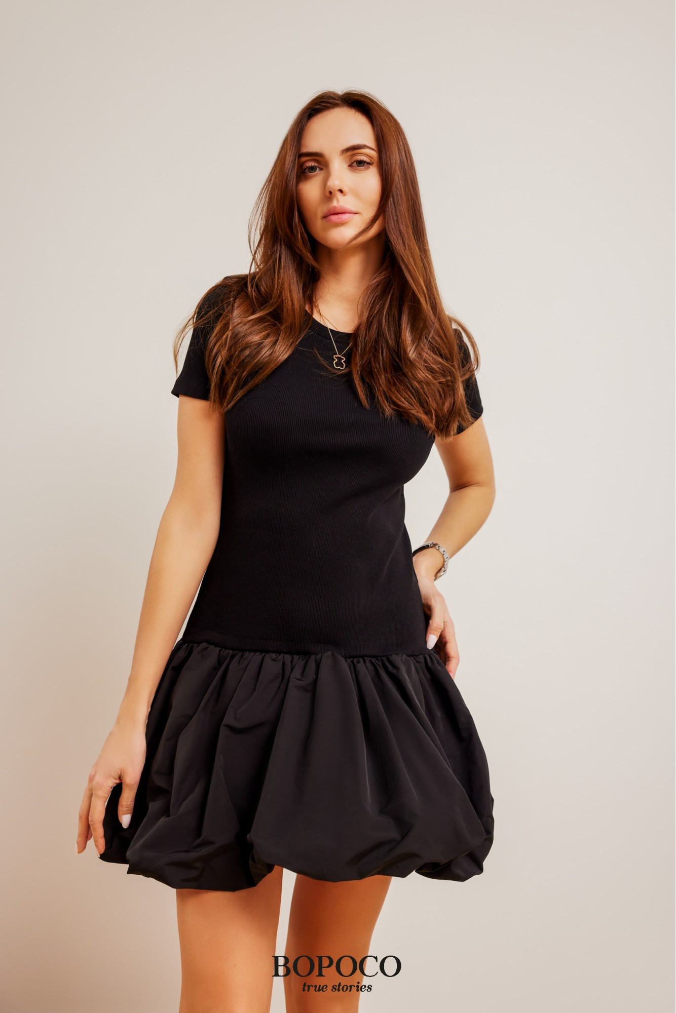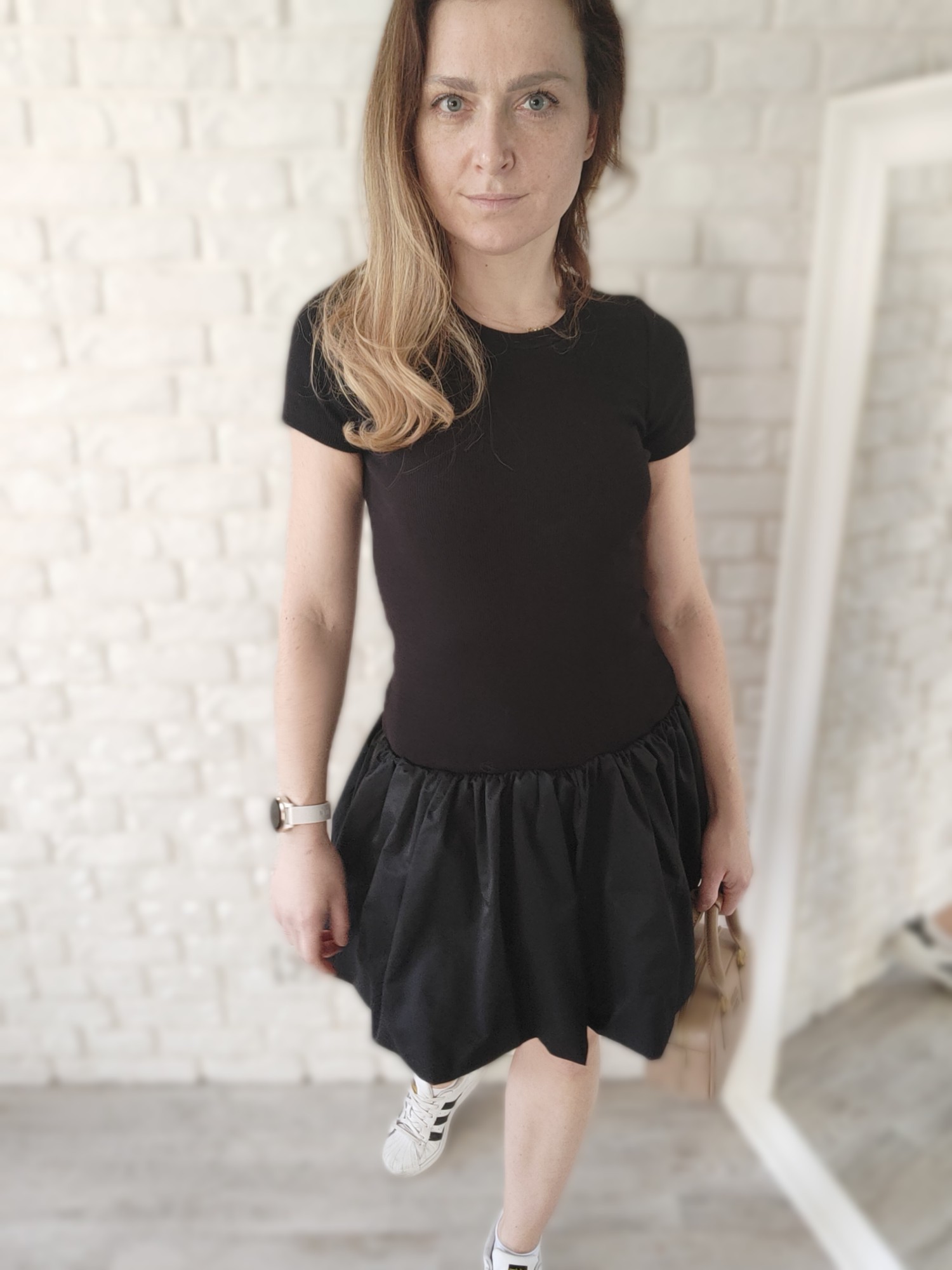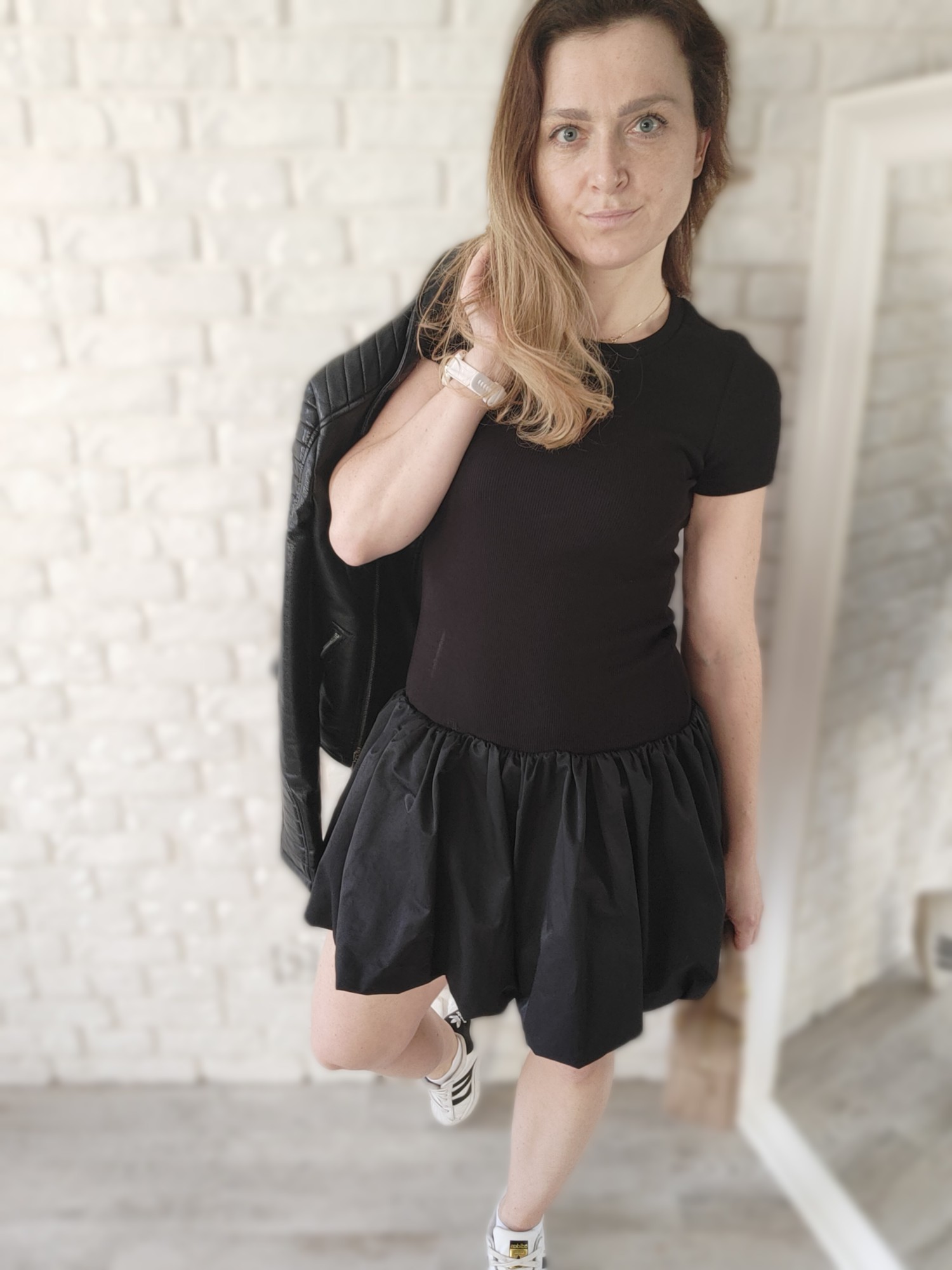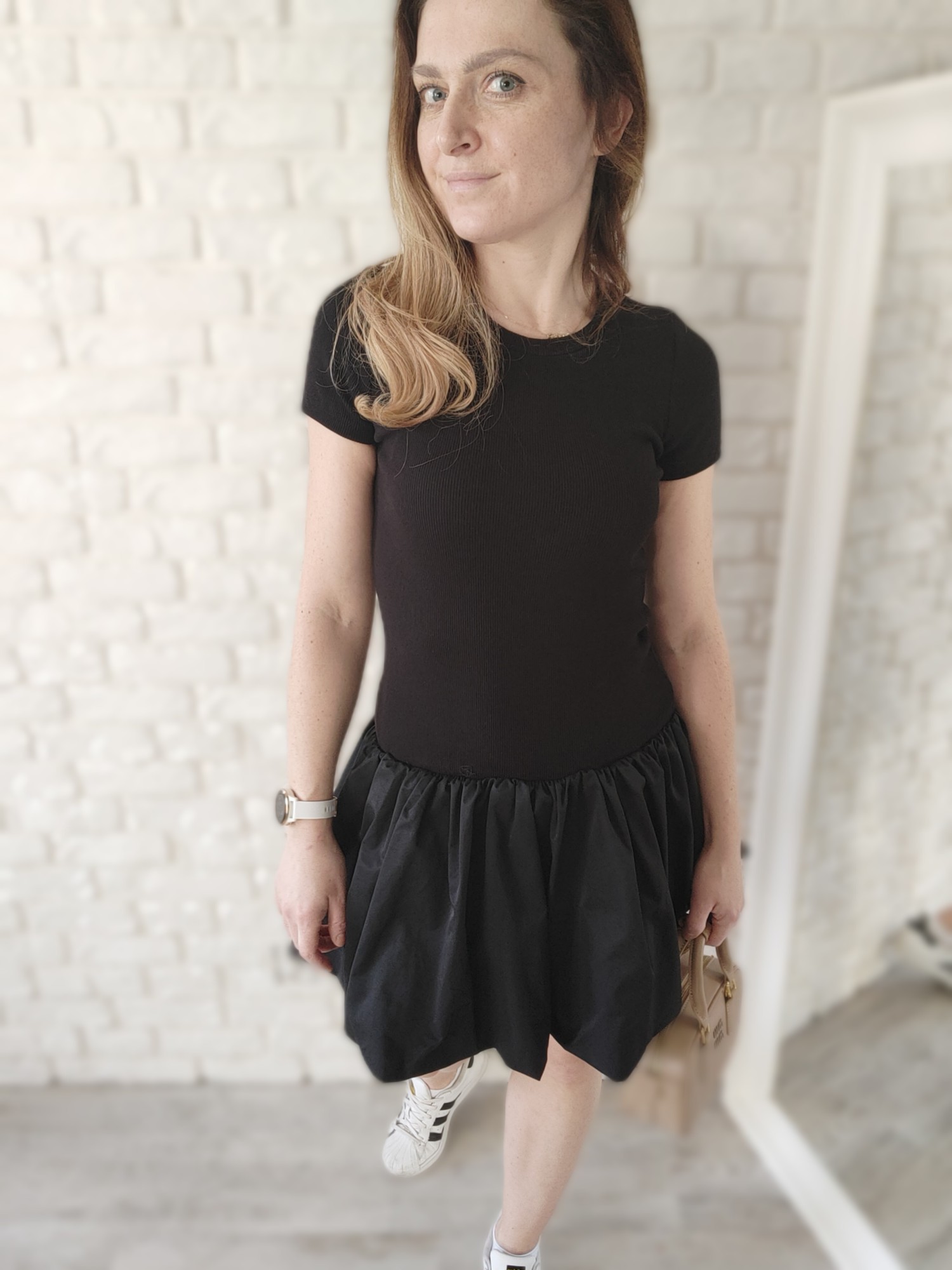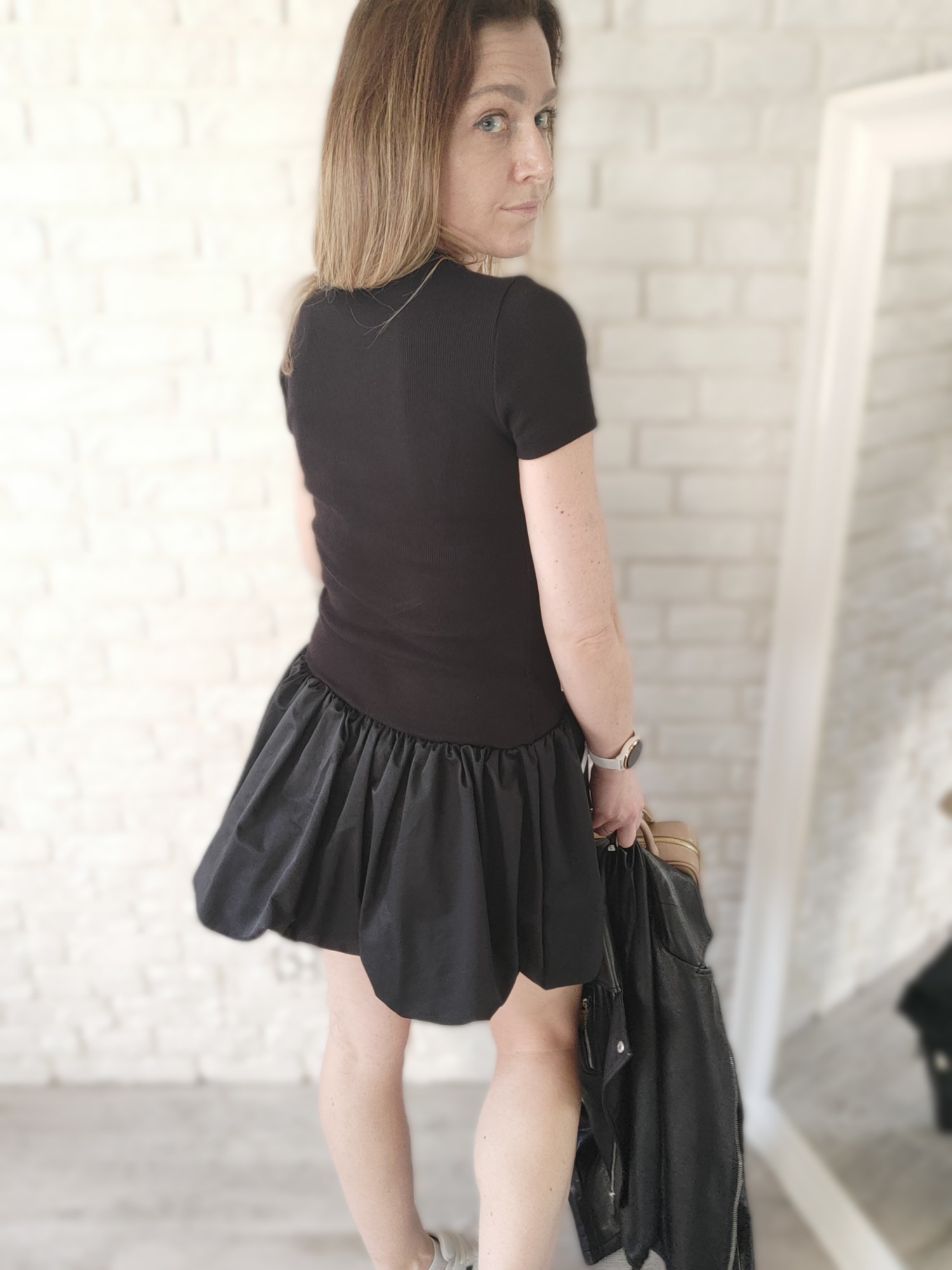 Mała czarna w zupełnie nowym wydaniu. Góra z miękkiej dzianiny otula sylwetkę niczym druga skóra, a dół… robi show. Tafta układa się w efektowny, bańkowy kształt, tworząc nonszalancką objętość i modowy twist. Sukienka balansuje między casualem a nutą elegancji – założysz ją i do białych sneakersów, i do botków na obcasie.
