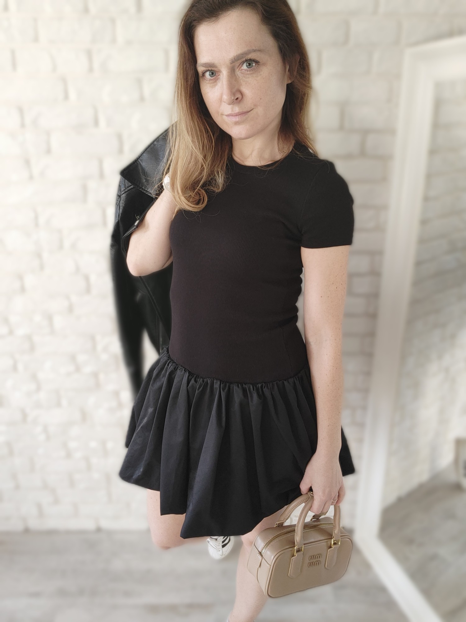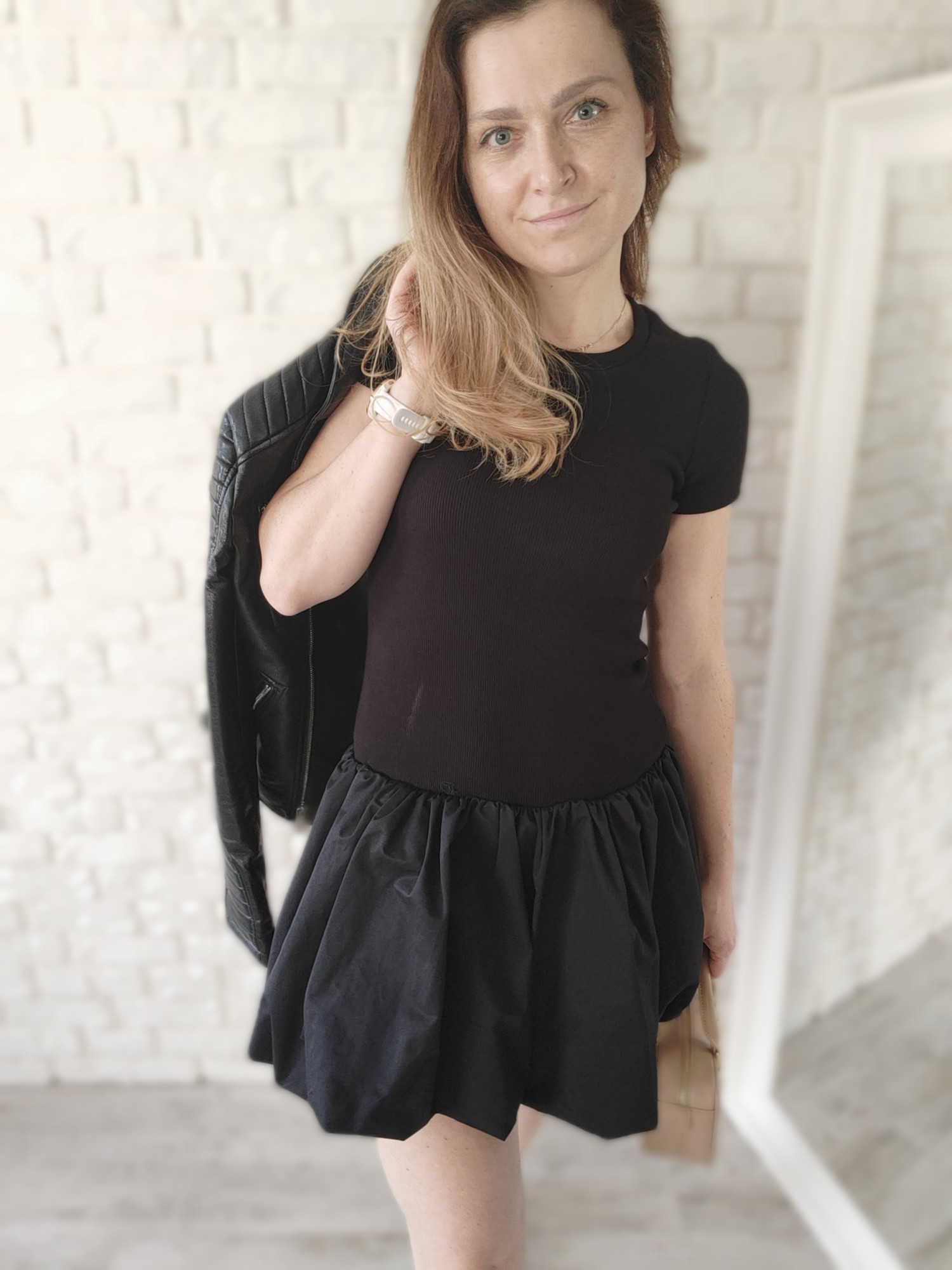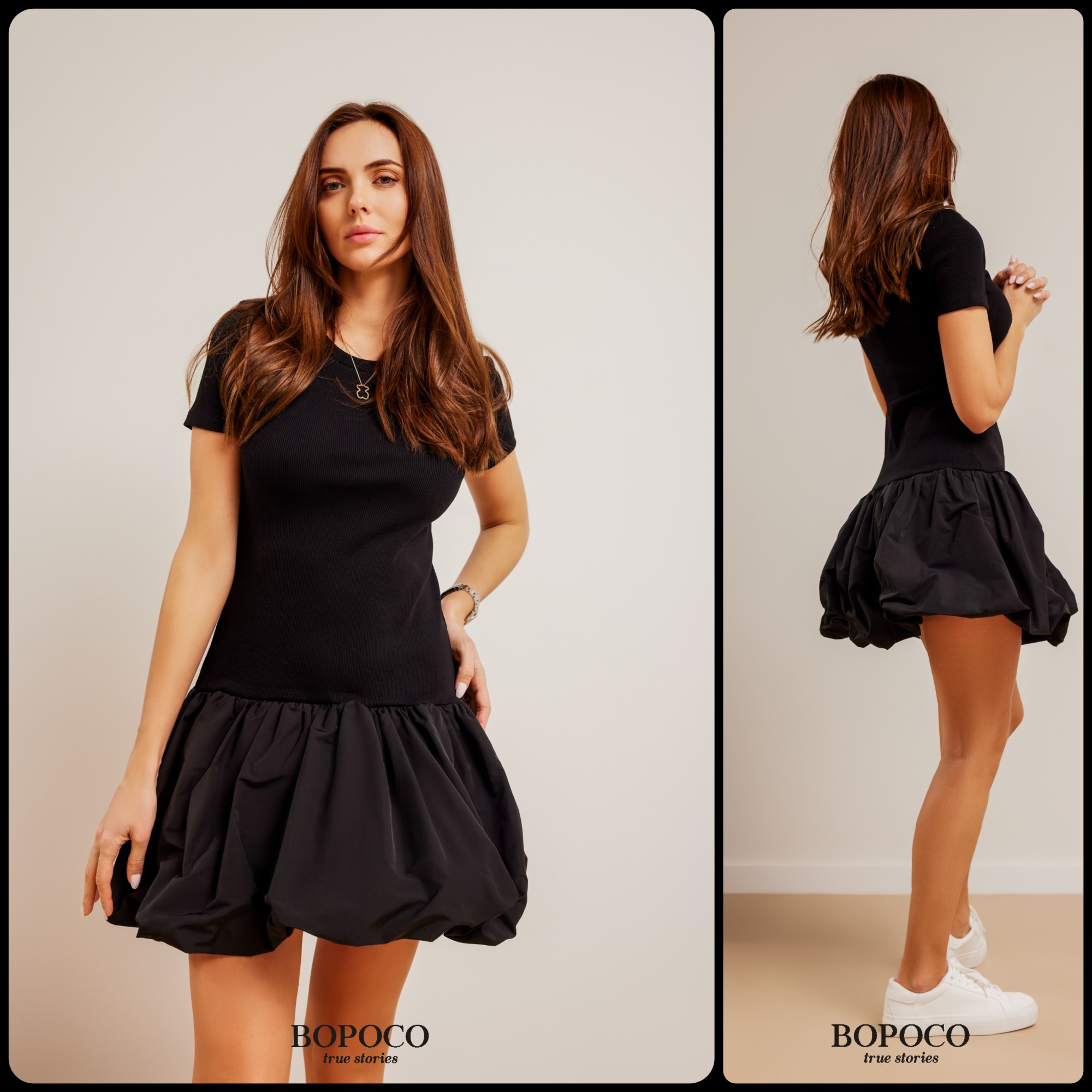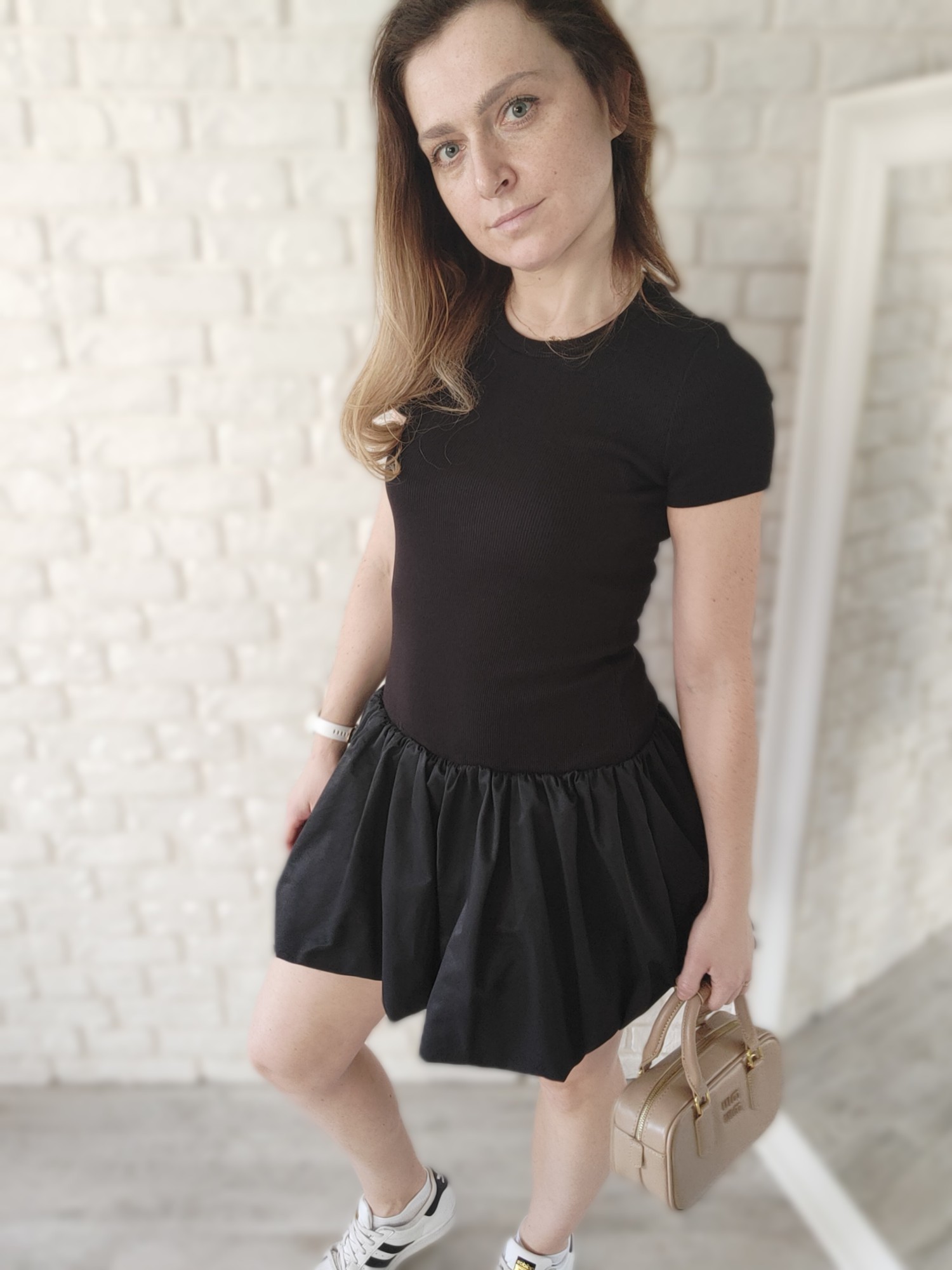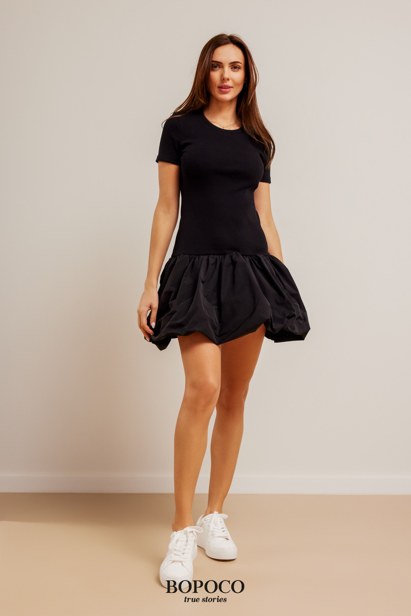 Mała czarna w zupełnie nowym wydaniu. Góra z miękkiej dzianiny otula sylwetkę niczym druga skóra, a dół… robi show. Tafta układa się w efektowny, bańkowy kształt, tworząc nonszalancką objętość i modowy twist. Sukienka balansuje między casualem a nutą elegancji – założysz ją i do białych sneakersów, i do botków na obcasie.