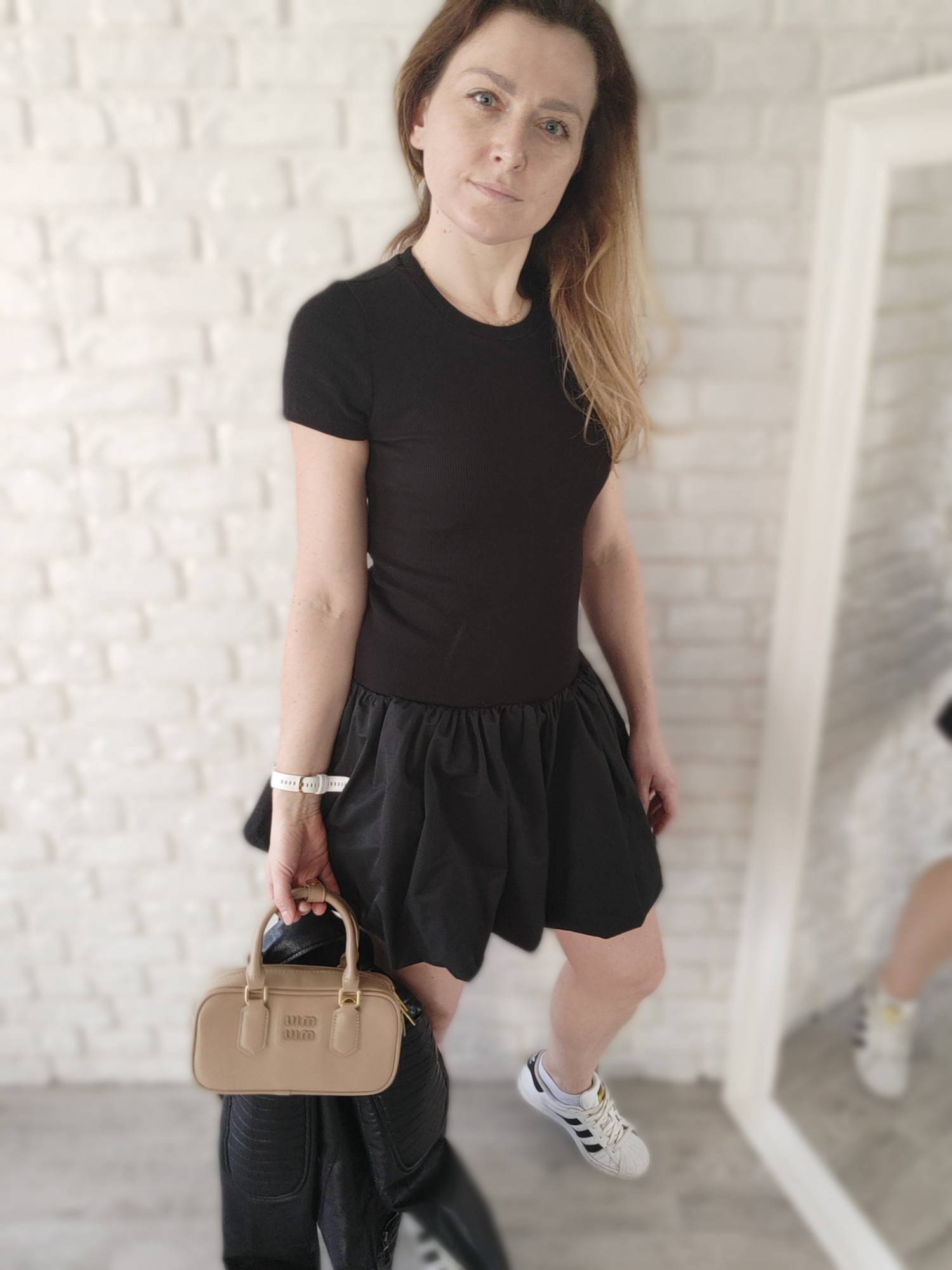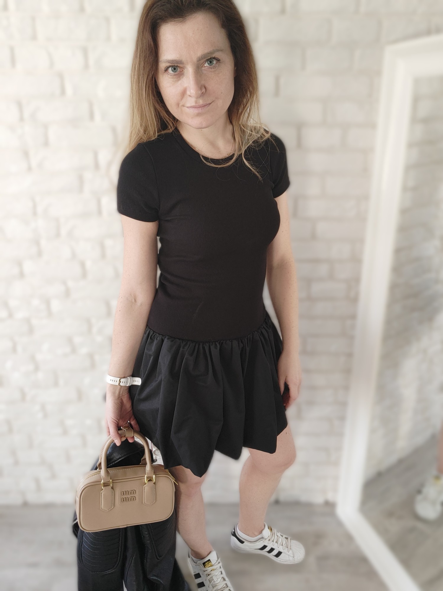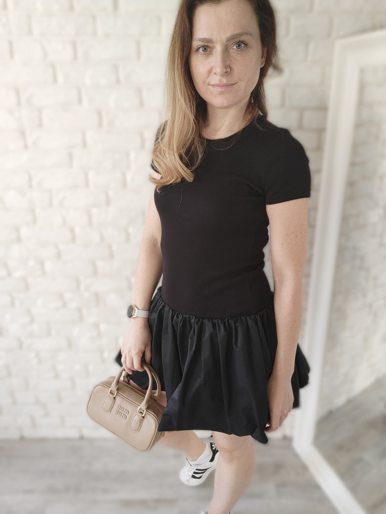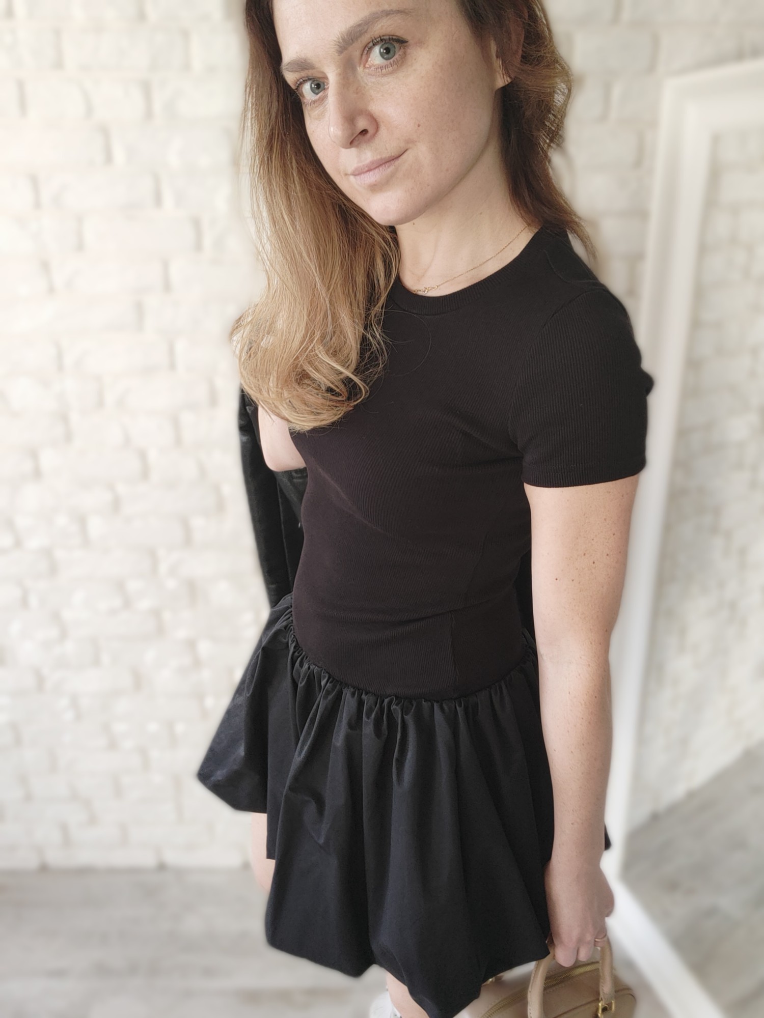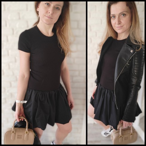 Mała czarna w zupełnie nowym wydaniu. Góra z miękkiej dzianiny otula sylwetkę niczym druga skóra, a dół… robi show. Tafta układa się w efektowny, bańkowy kształt, tworząc nonszalancką objętość i modowy twist. Sukienka balansuje między casualem a nutą elegancji – założysz ją i do białych sneakersów, i do botków na obcasie.