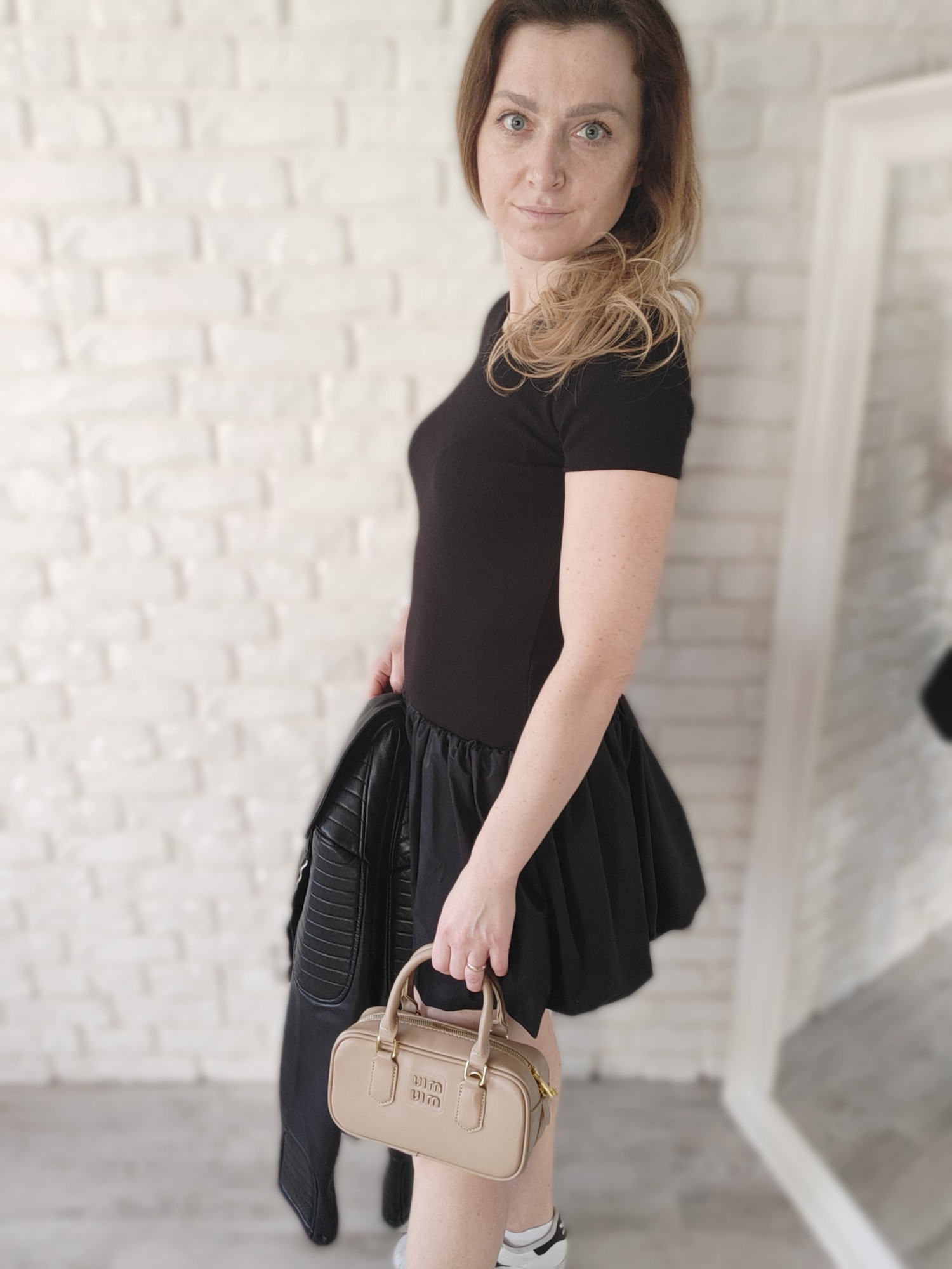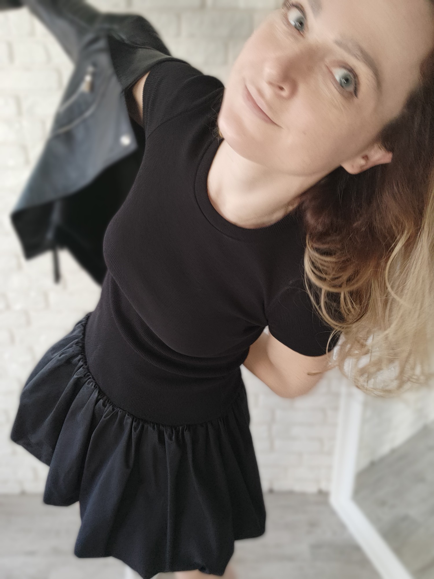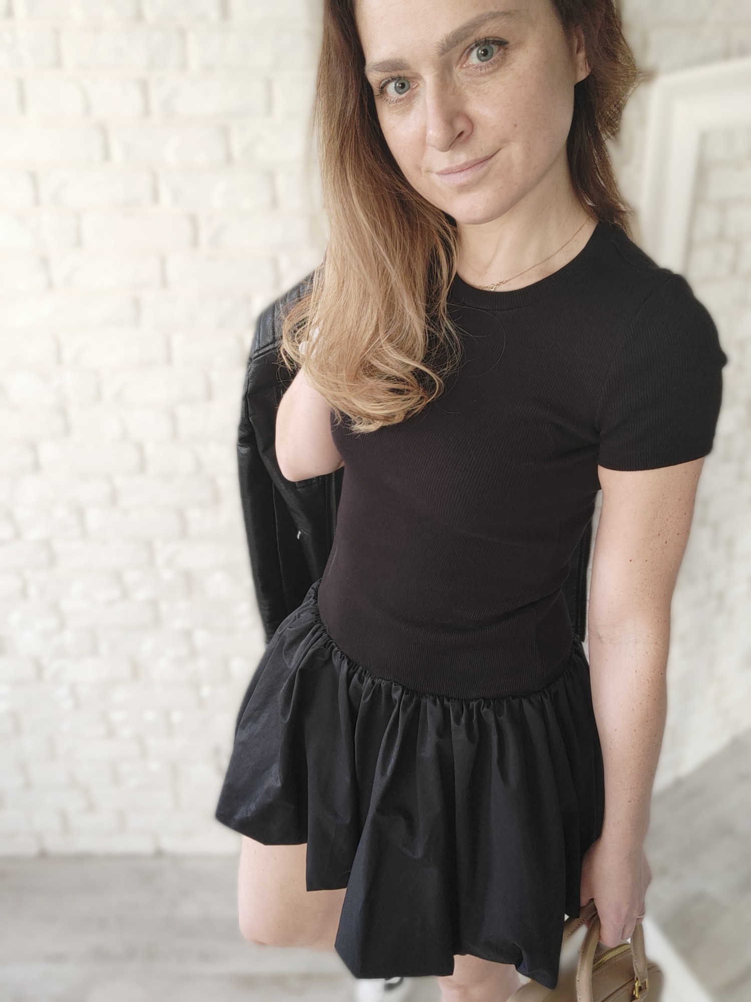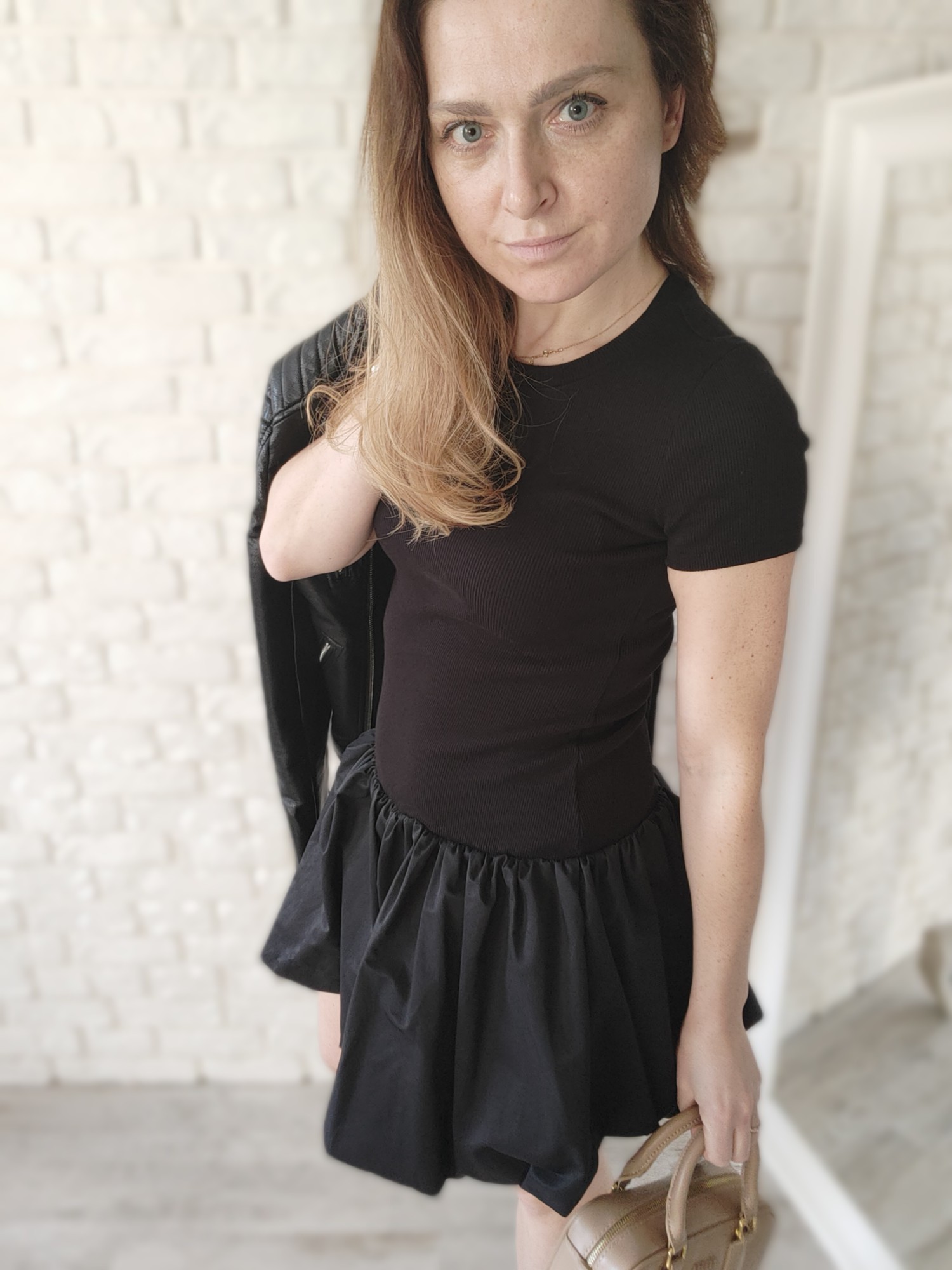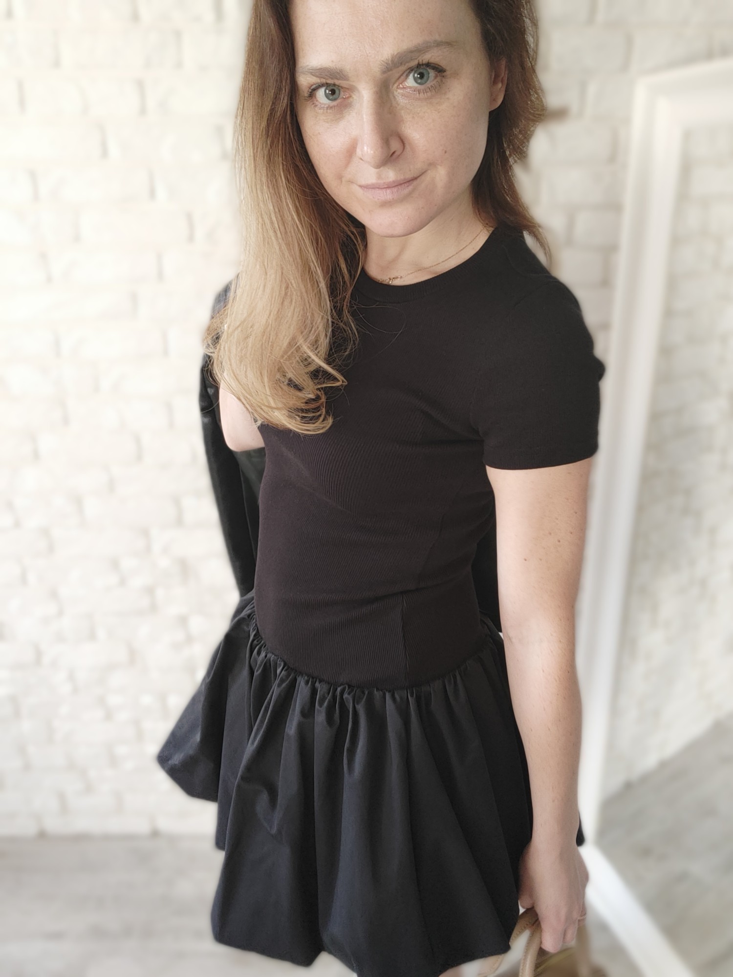 Mała czarna w zupełnie nowym wydaniu. Góra z miękkiej dzianiny otula sylwetkę niczym druga skóra, a dół… robi show. Tafta układa się w efektowny, bańkowy kształt, tworząc nonszalancką objętość i modowy twist. Sukienka balansuje między casualem a nutą elegancji – założysz ją i do białych sneakersów, i do botków na obcasie.