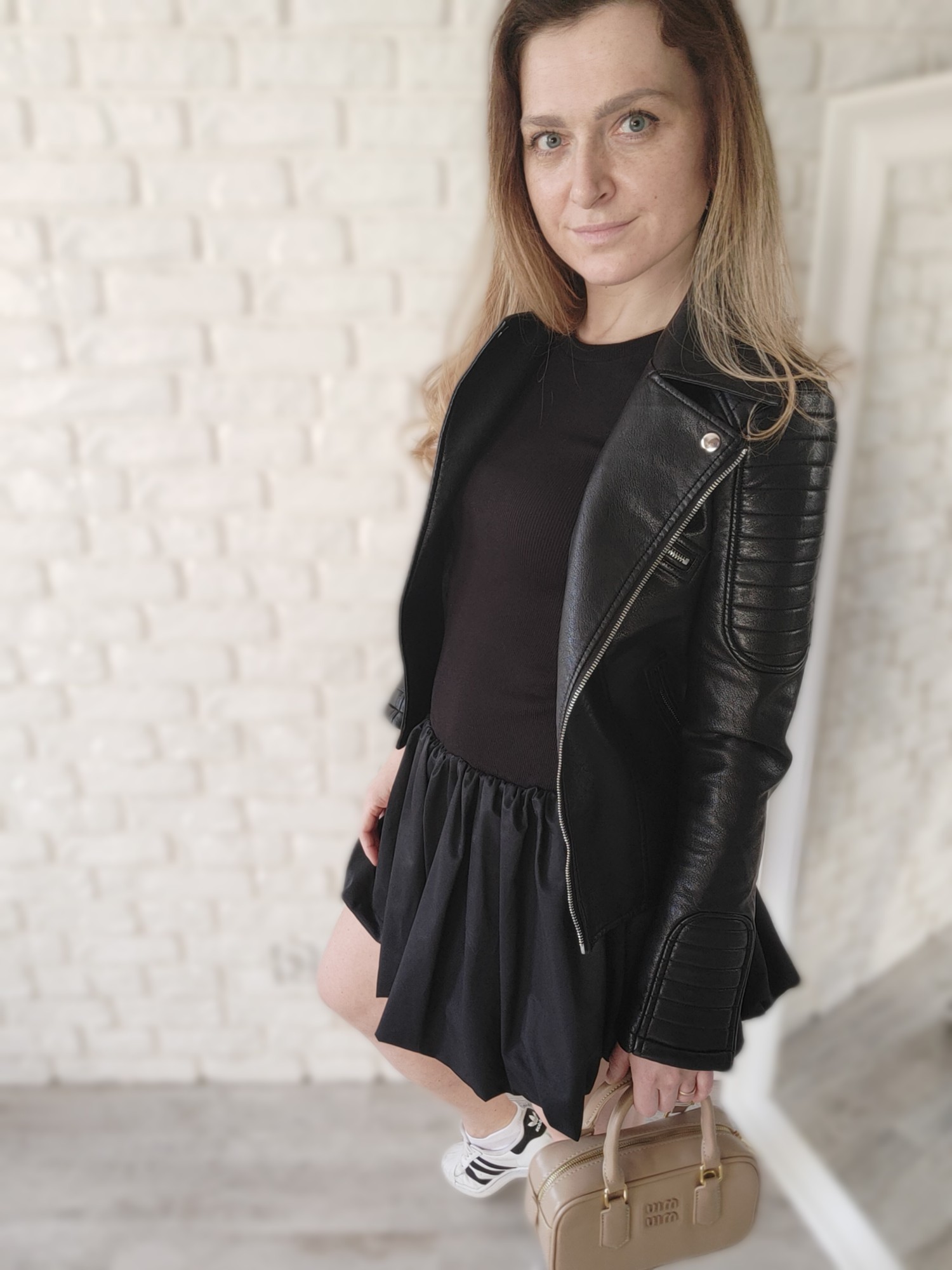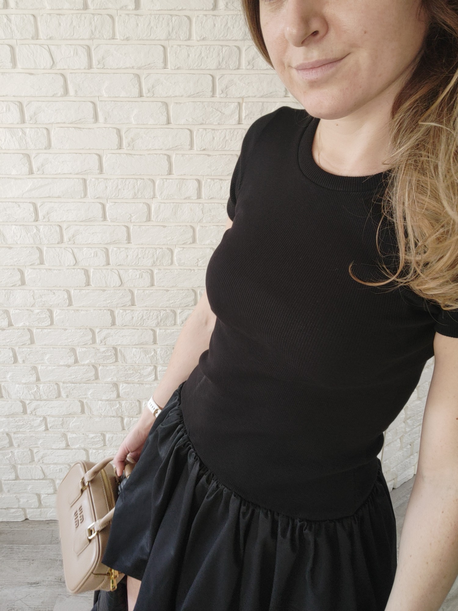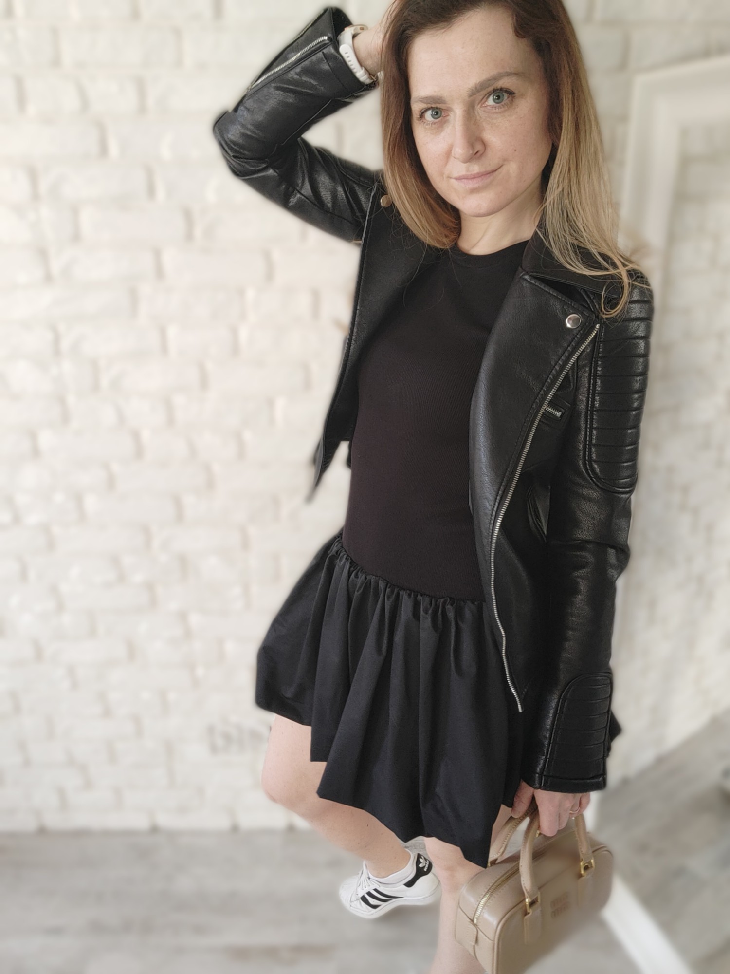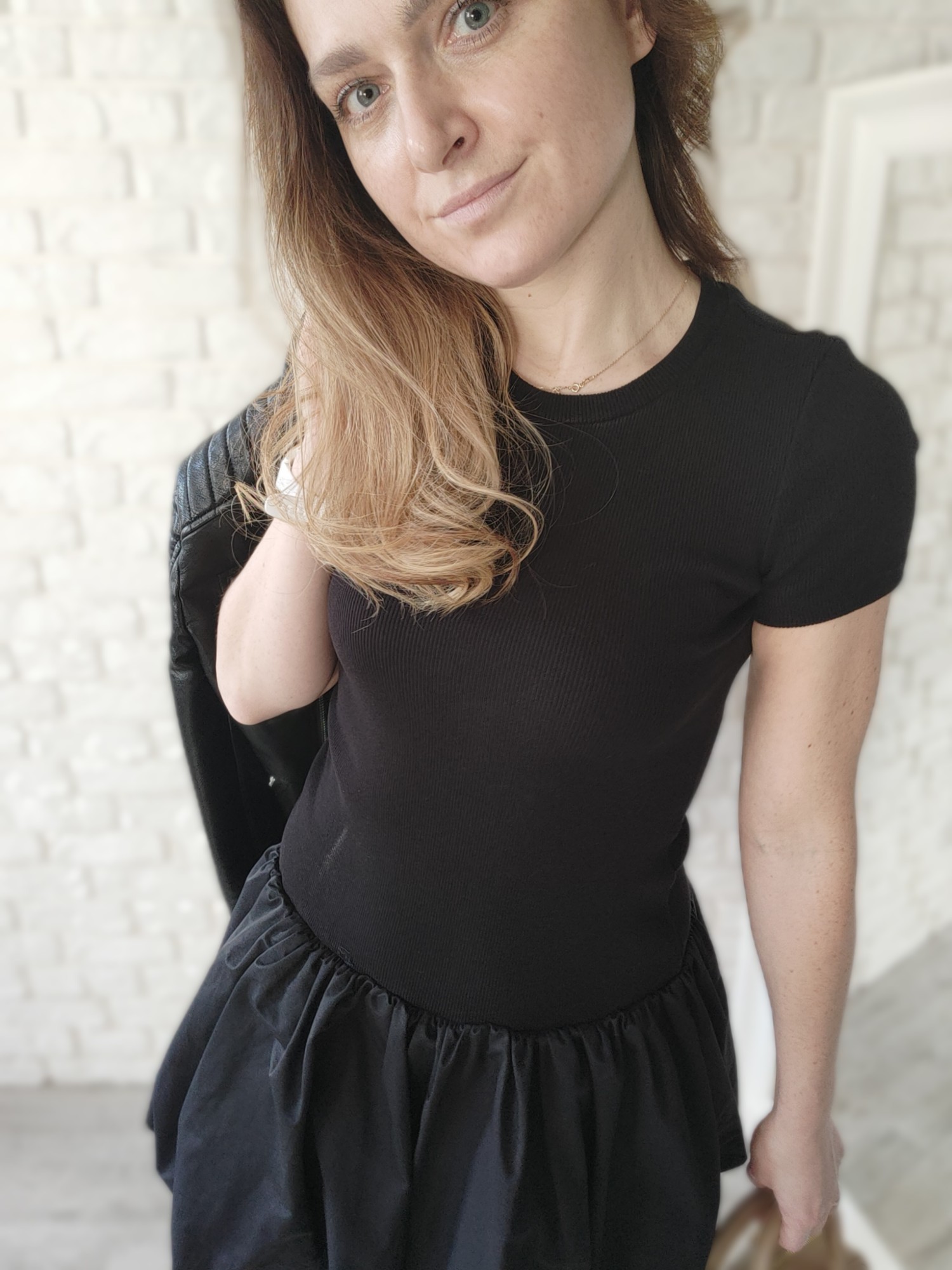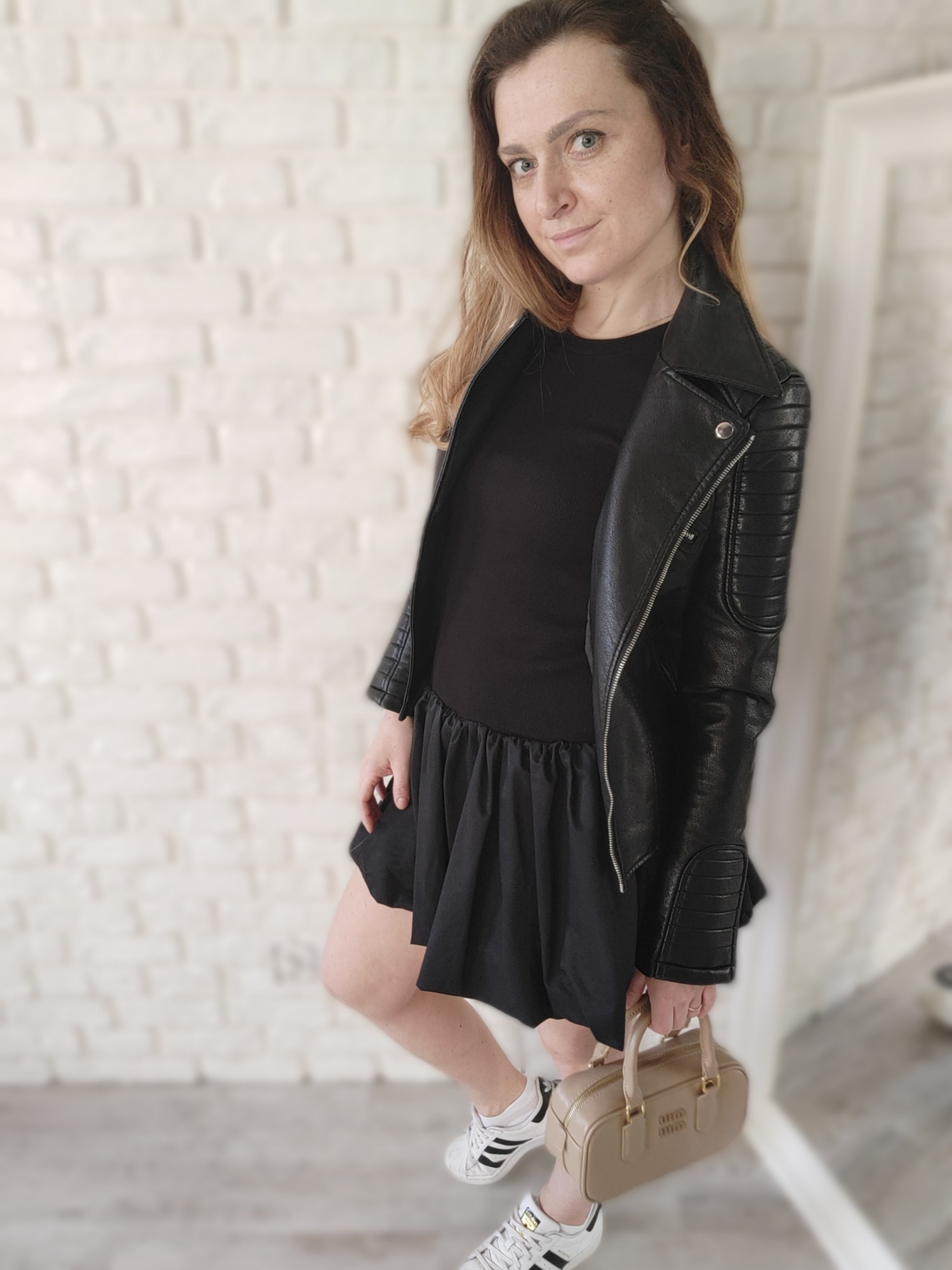 Mała czarna w zupełnie nowym wydaniu. Góra z miękkiej dzianiny otula sylwetkę niczym druga skóra, a dół… robi show. Tafta układa się w efektowny, bańkowy kształt, tworząc nonszalancką objętość i modowy twist. Sukienka balansuje między casualem a nutą elegancji – założysz ją i do białych sneakersów, i do botków na obcasie.