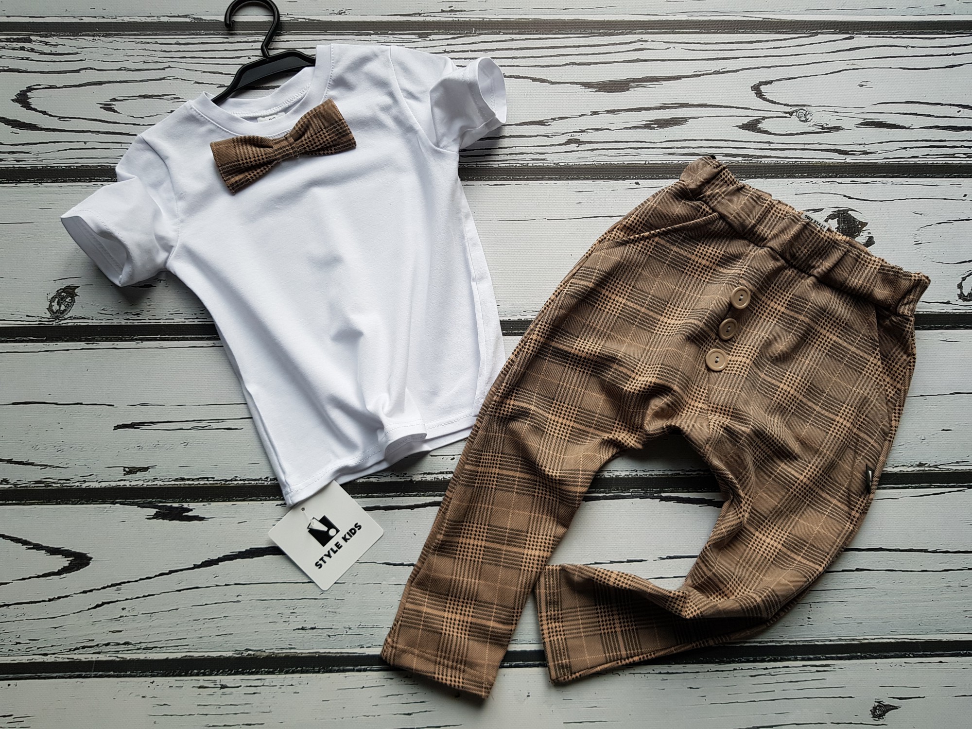 T-shirt elegancki z muchą w beżową kratę Style Kids